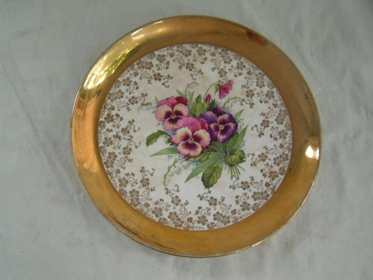More like this elsewhere in the sale. Vintage. Potters Co-Operative Co. Gold floral w/ pansies. About 9-1/2" dia