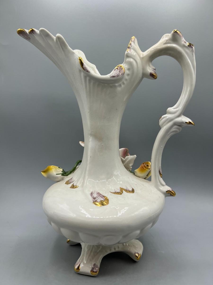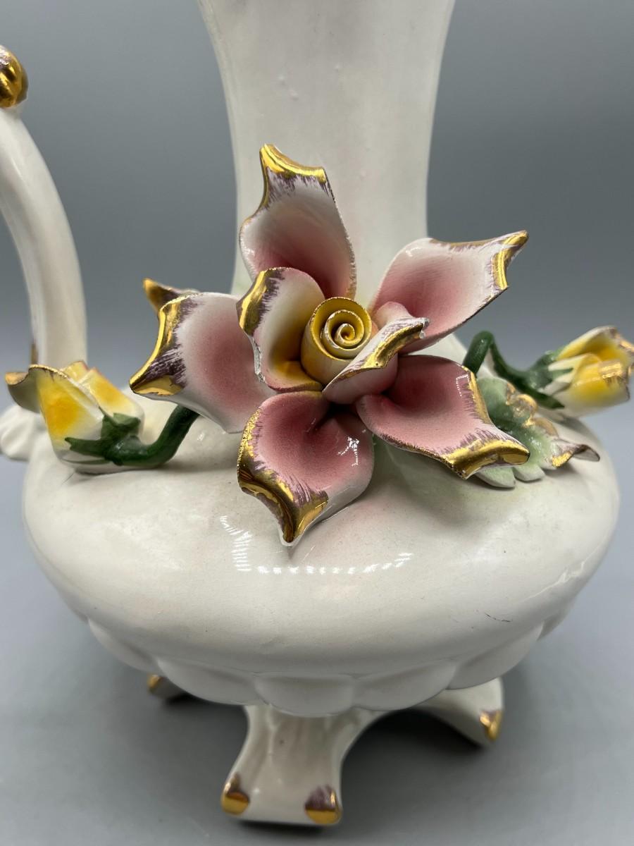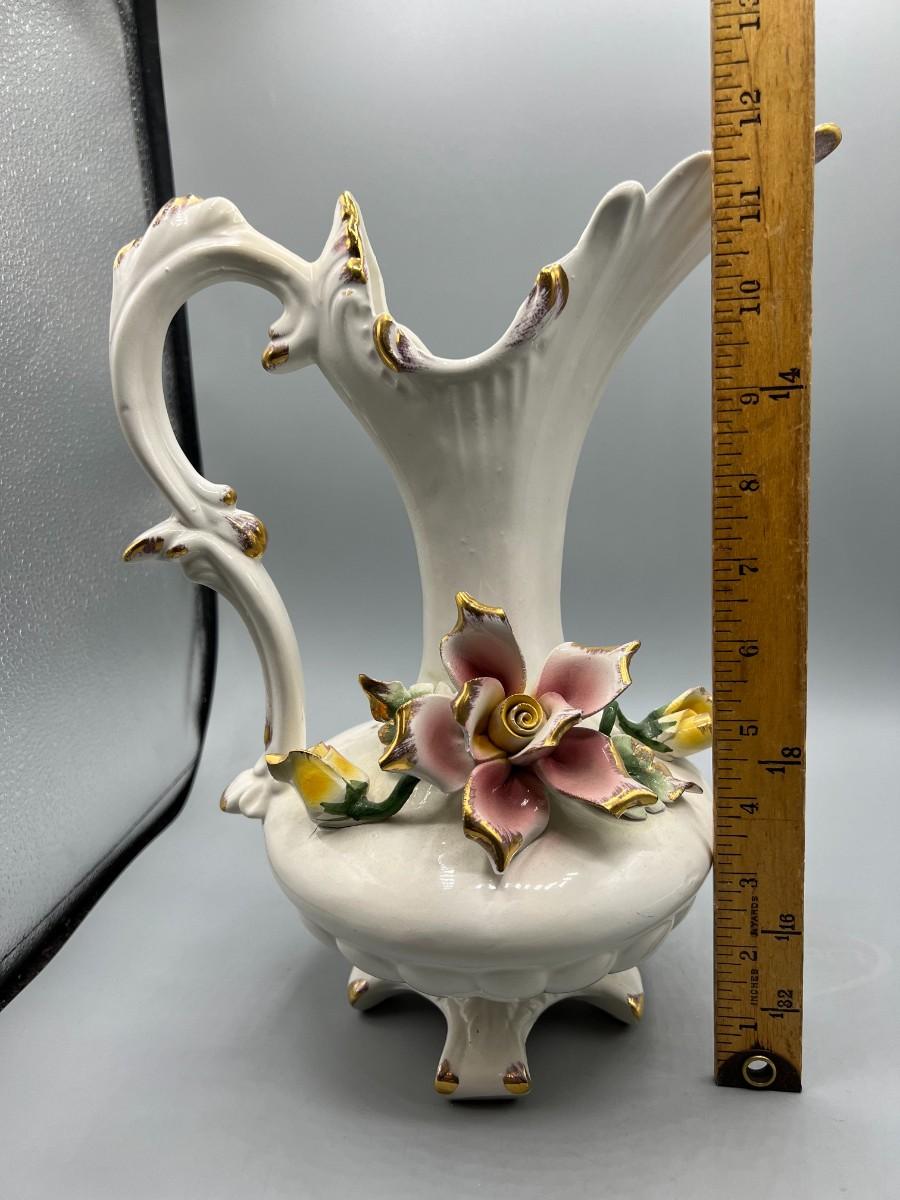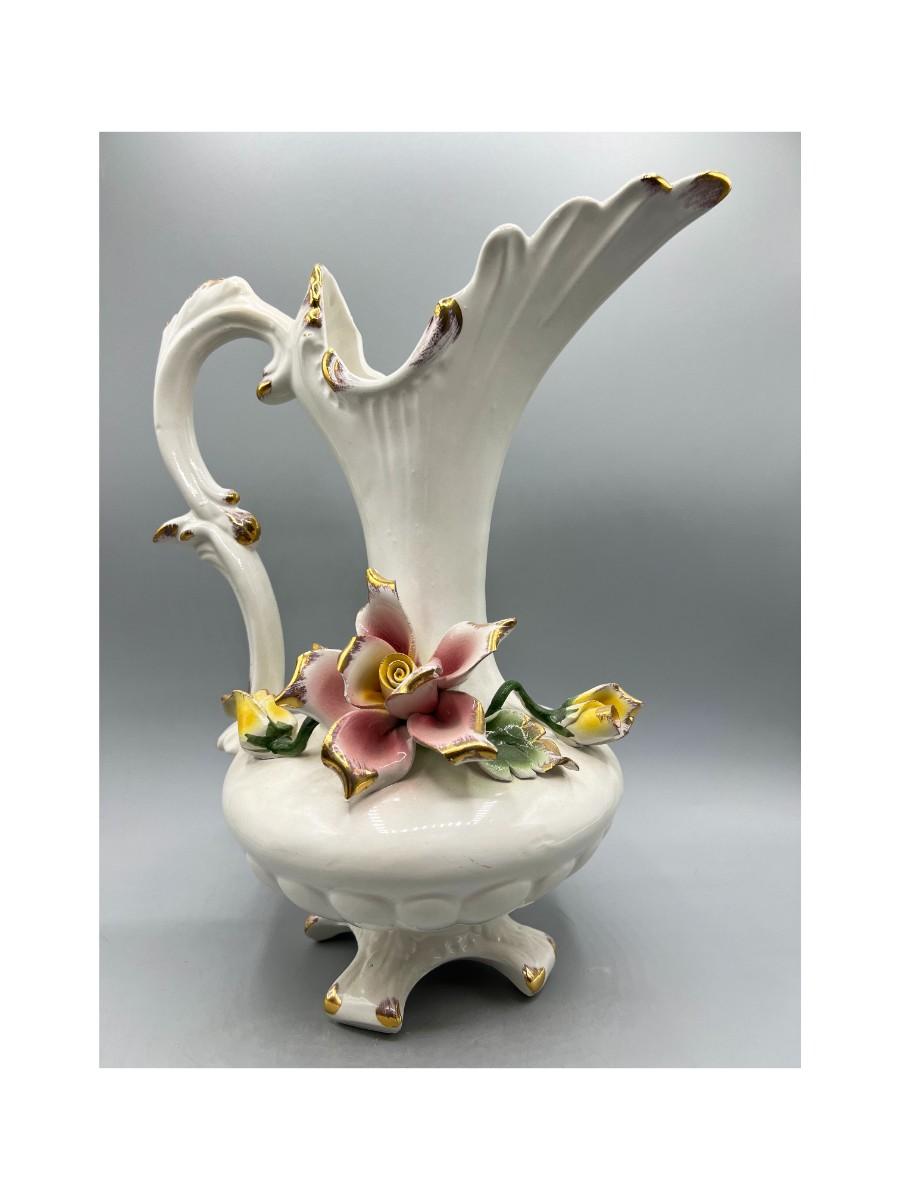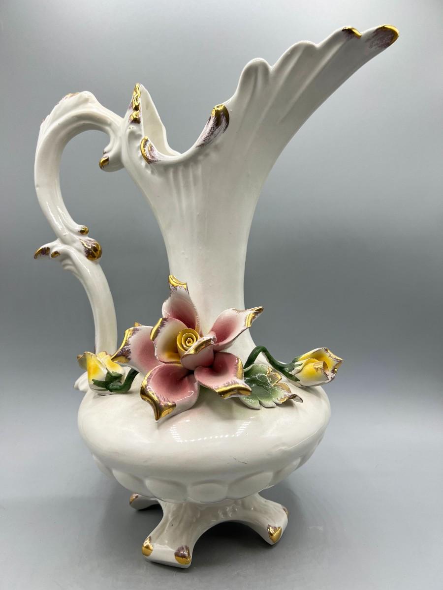 Vintage Pottery Art Capodimonte Porcelain Hand Painted Flower Pitcher