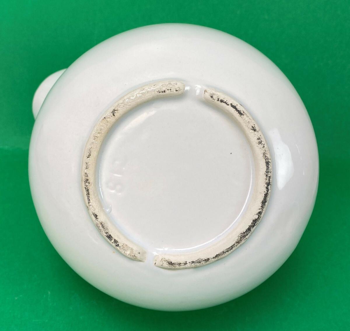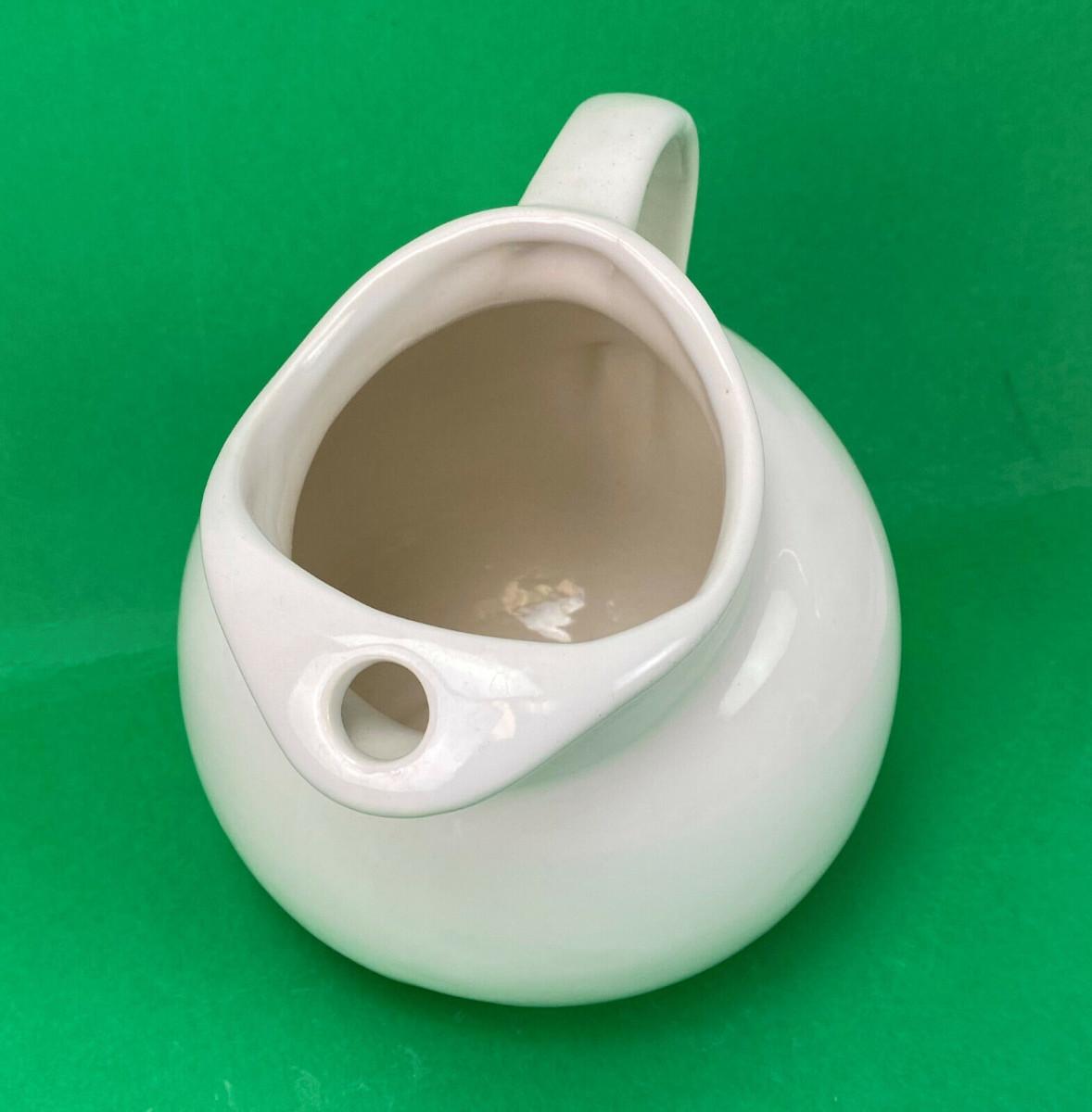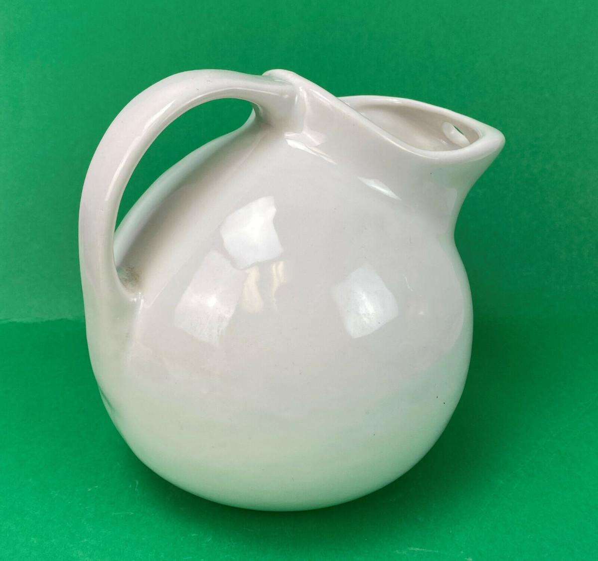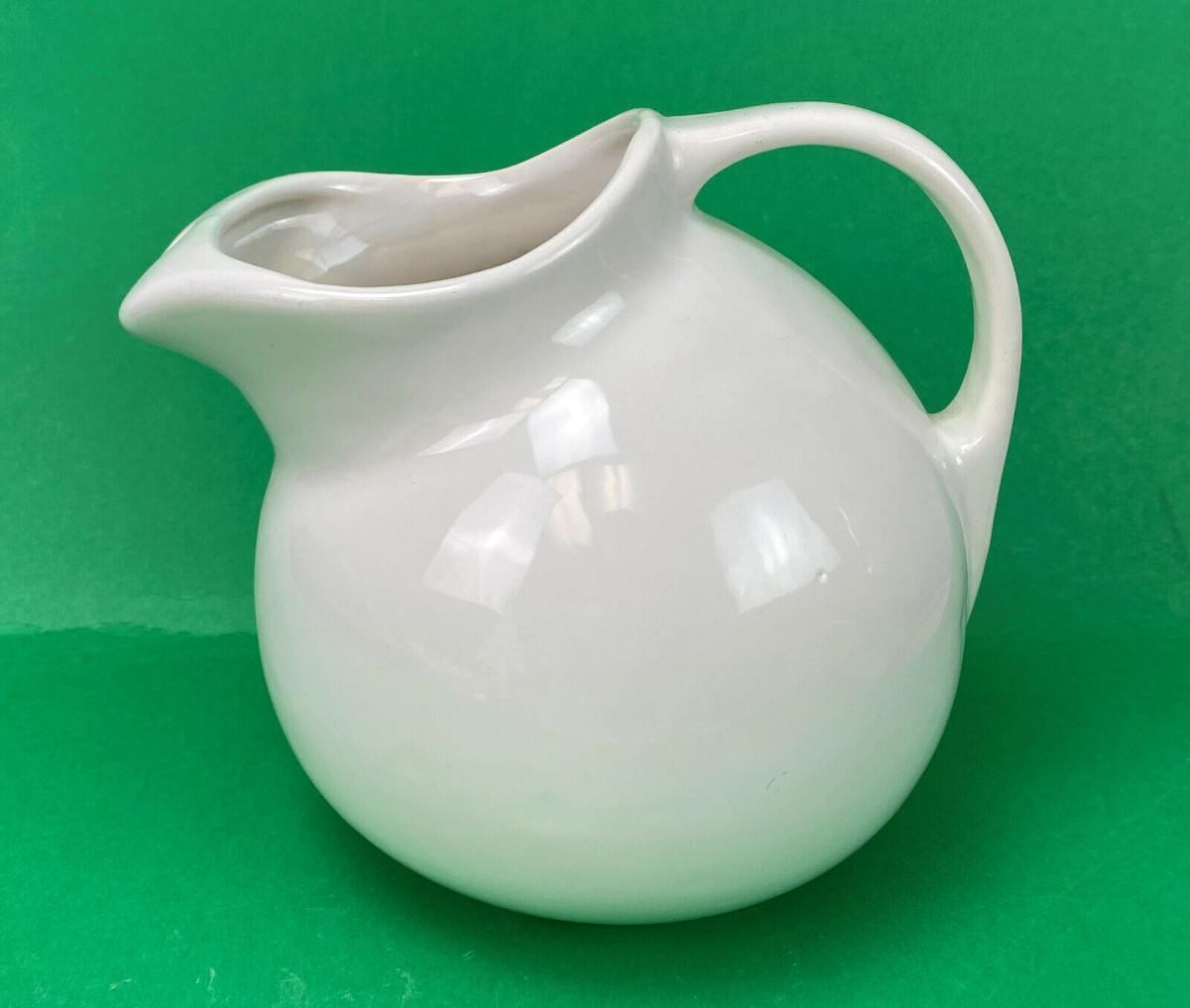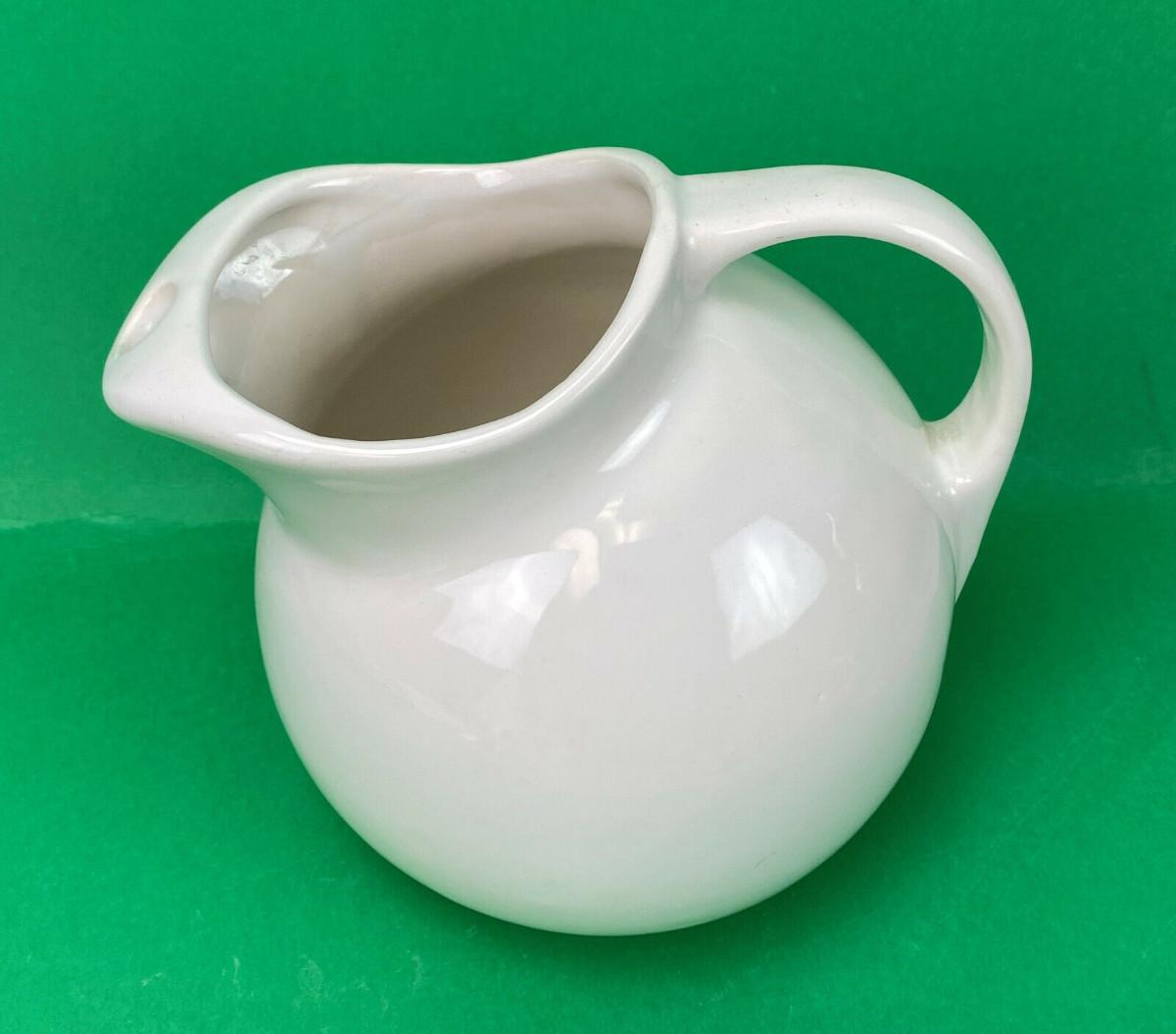 Excellent condition on this 7" tall white Ball Jug...Stamped with a mold number 812...Unknown U.S. pottery? No chips or cracks...Features an ice lip...Classic 20th century design.
