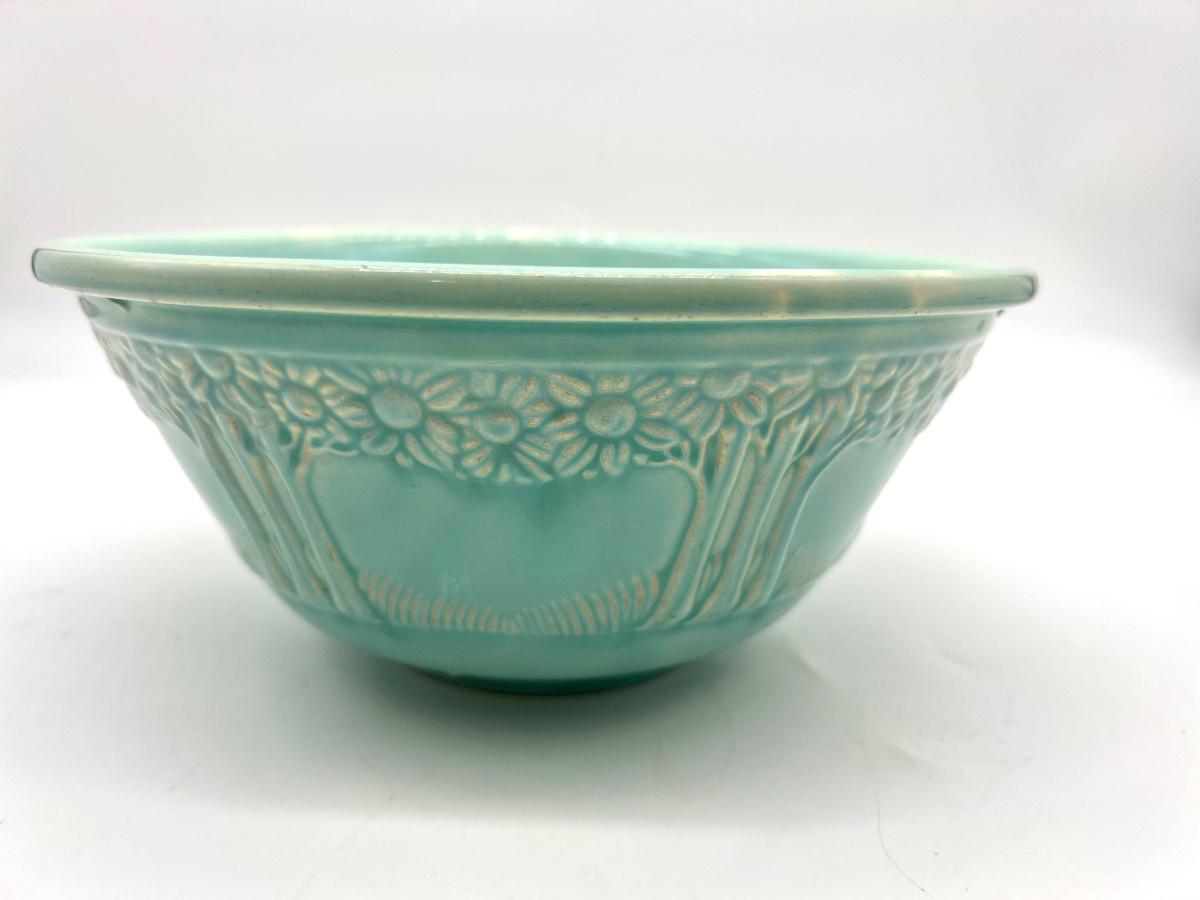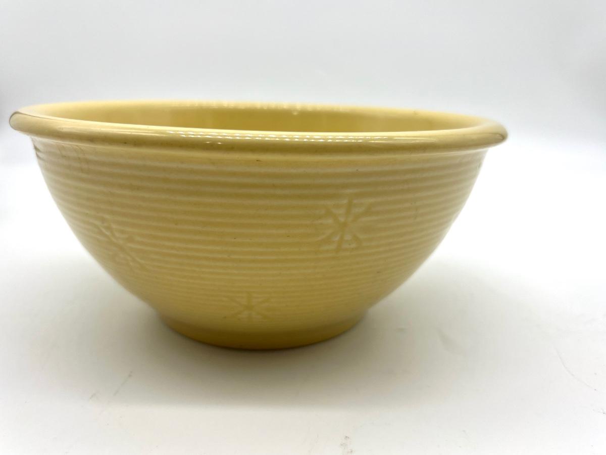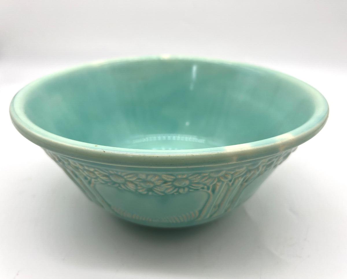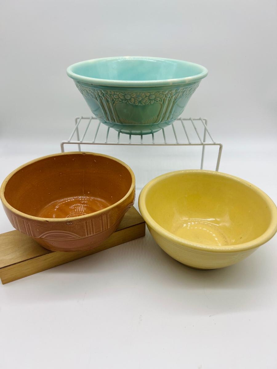 3 vintage pottery bowls. Vintage Homer Laughlin USA Pottery Aqua Blue Apple Trees Small Mixing bowl, 9 inches round and 4 inches tall. Antique USA Ceramic Bowl - Star/Snowflake Design measures 3 1/2 inches tall 8 inches round. Vintage Watt Pottery Oven Ware USA 7 Stoneware Bowl **has crack on the inside, see pictures. Measures 3 1/2 inches tall and 7 1/2 inches round.