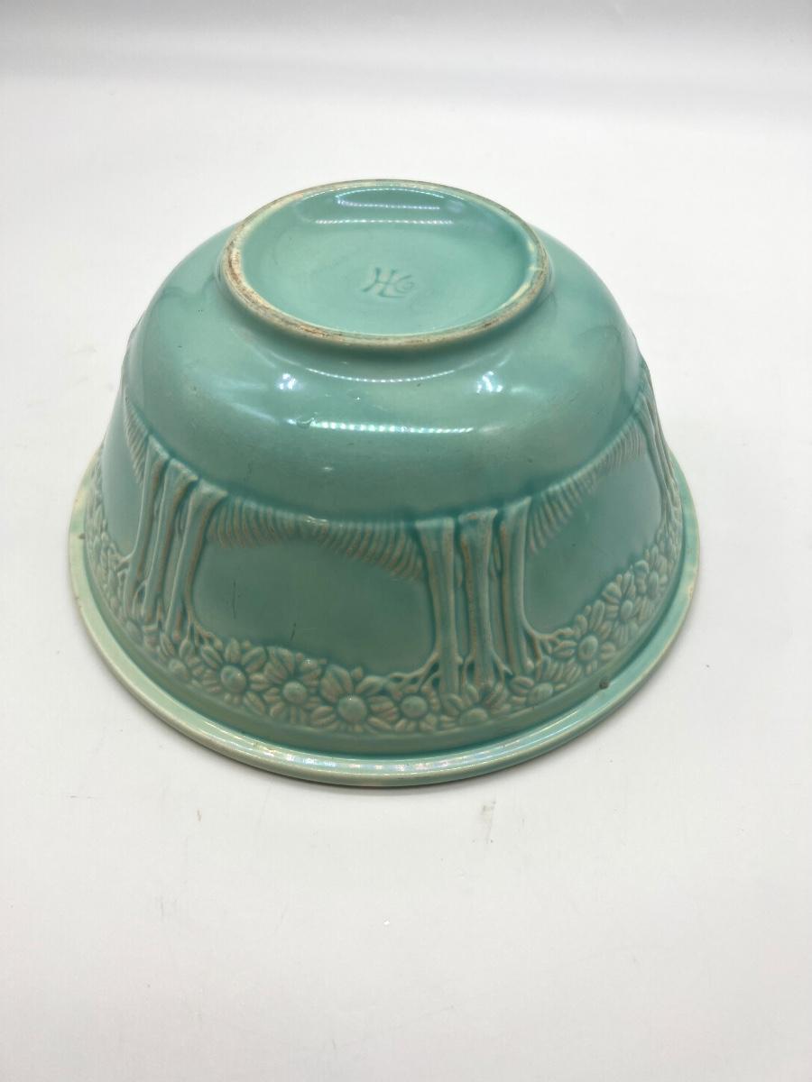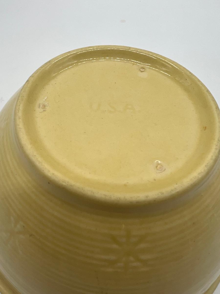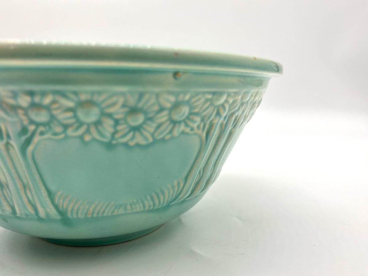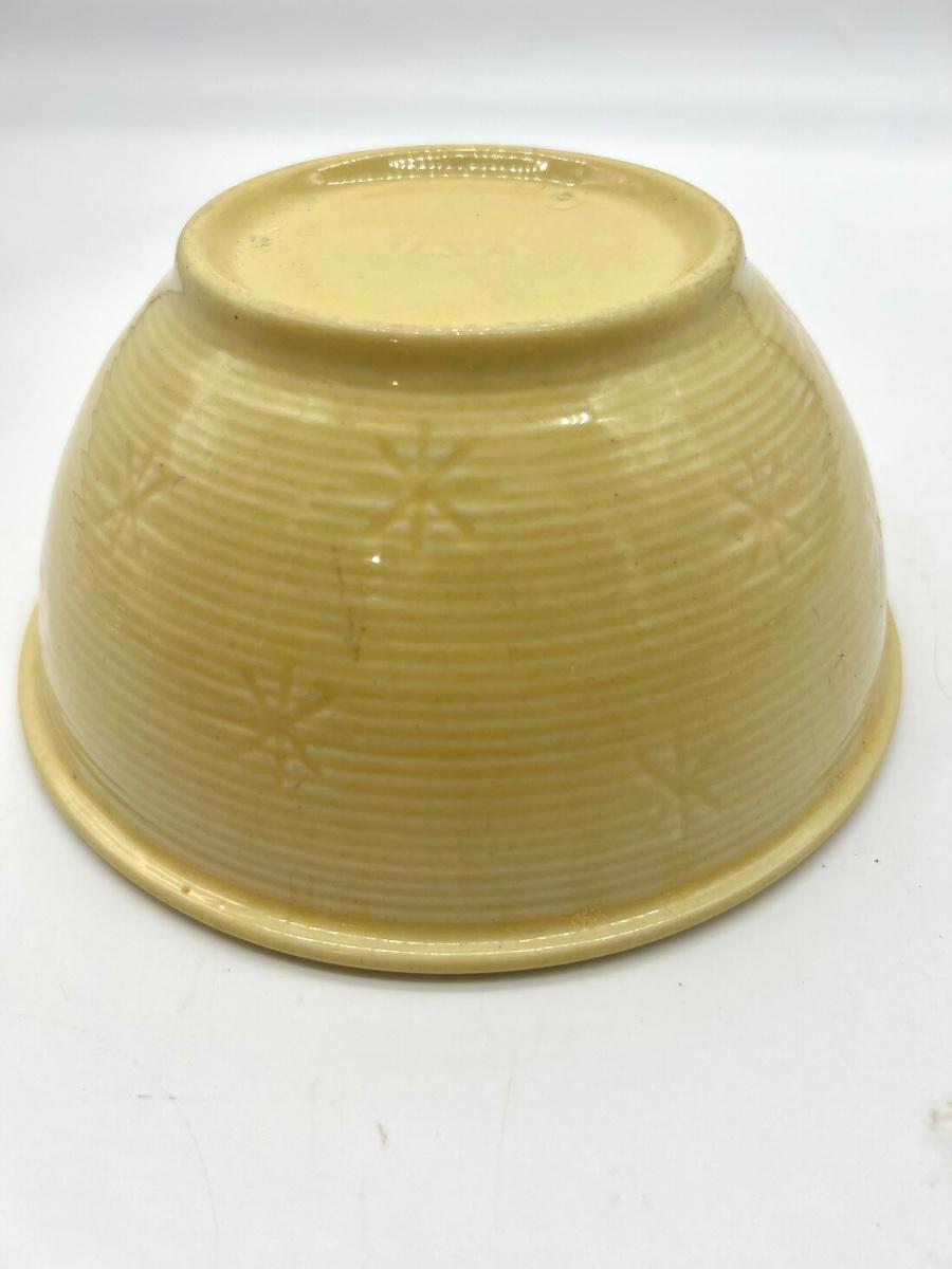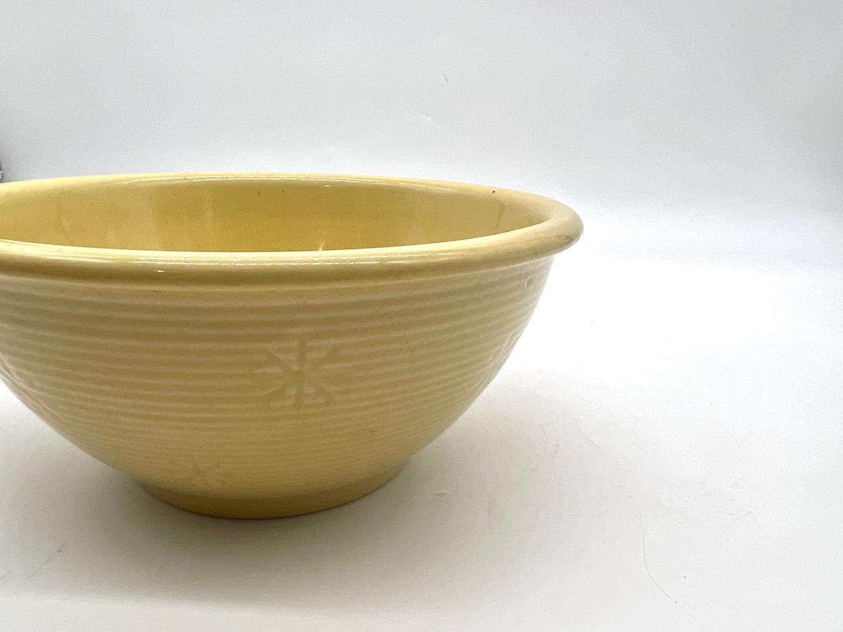 3 vintage pottery bowls. Vintage Homer Laughlin USA Pottery Aqua Blue Apple Trees Small Mixing bowl, 9 inches round and 4 inches tall. Antique USA Ceramic Bowl - Star/Snowflake Design measures 3 1/2 inches tall 8 inches round. Vintage Watt Pottery Oven Ware USA 7 Stoneware Bowl **has crack on the inside, see pictures. Measures 3 1/2 inches tall and 7 1/2 inches round.
