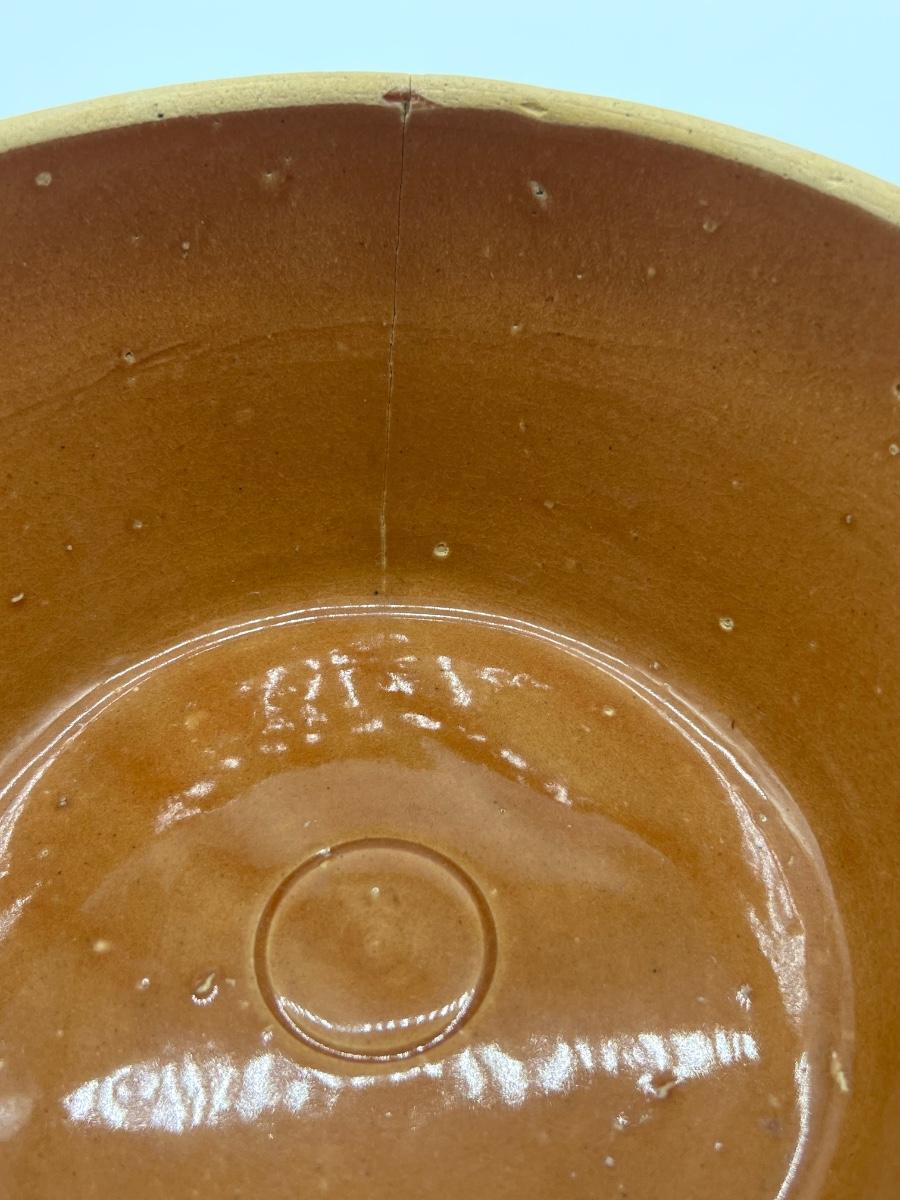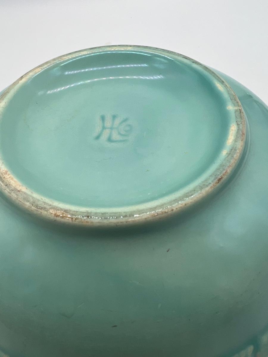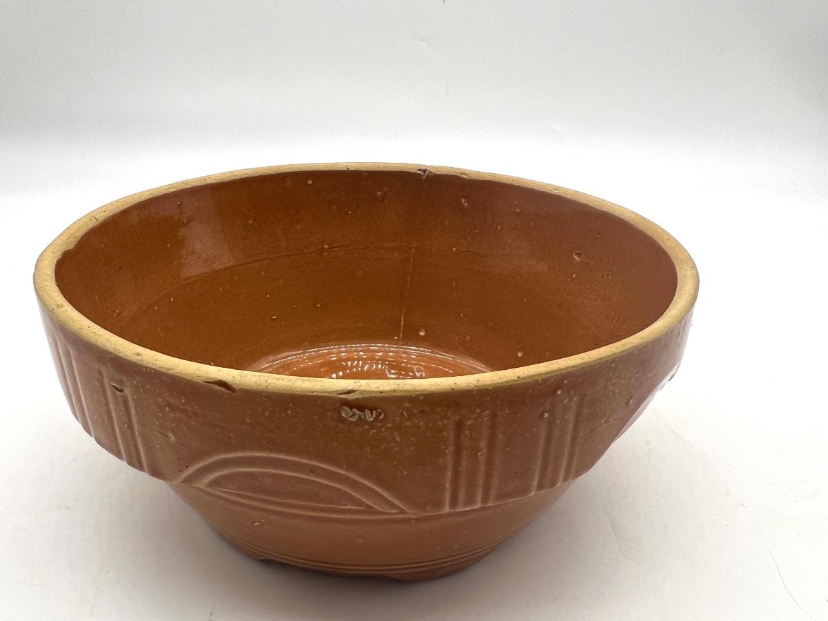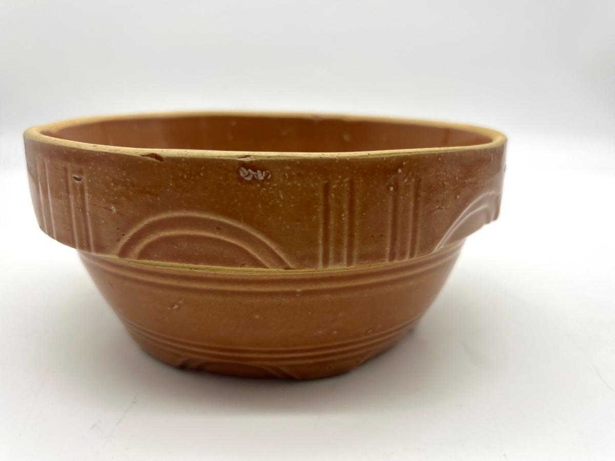 3 vintage pottery bowls. Vintage Homer Laughlin USA Pottery Aqua Blue Apple Trees Small Mixing bowl, 9 inches round and 4 inches tall. Antique USA Ceramic Bowl - Star/Snowflake Design measures 3 1/2 inches tall 8 inches round. Vintage Watt Pottery Oven Ware USA 7 Stoneware Bowl **has crack on the inside, see pictures. Measures 3 1/2 inches tall and 7 1/2 inches round.