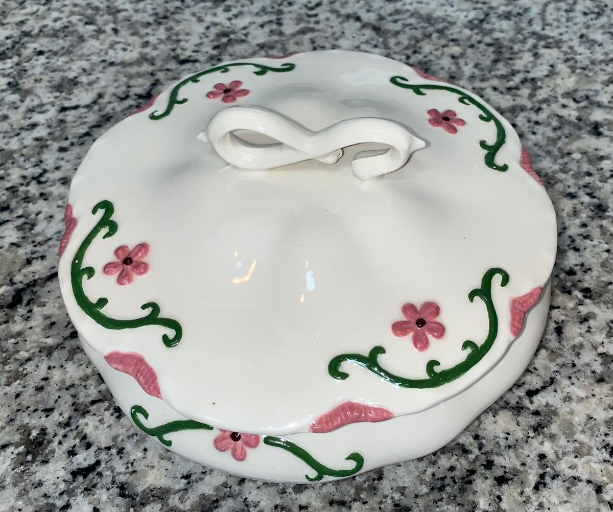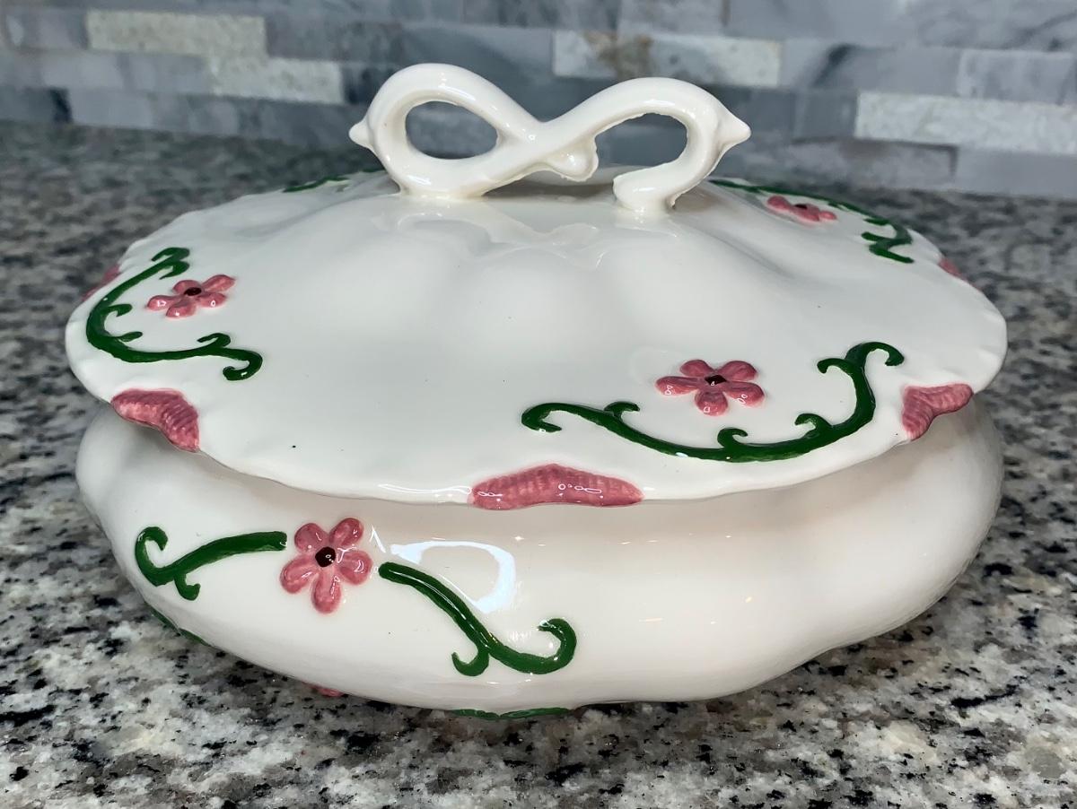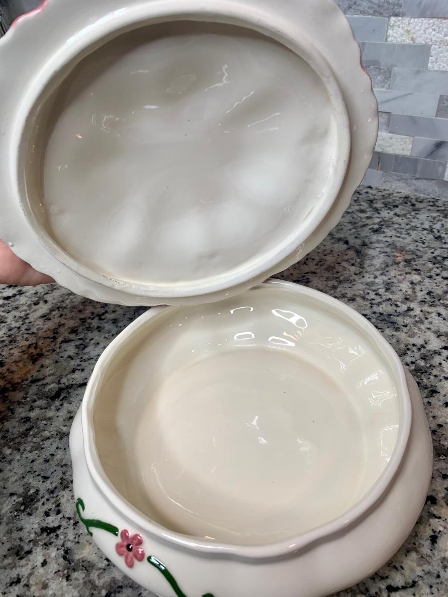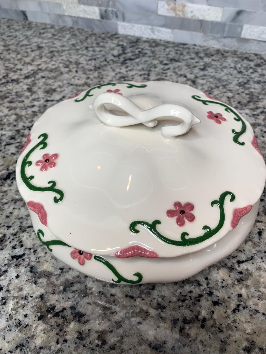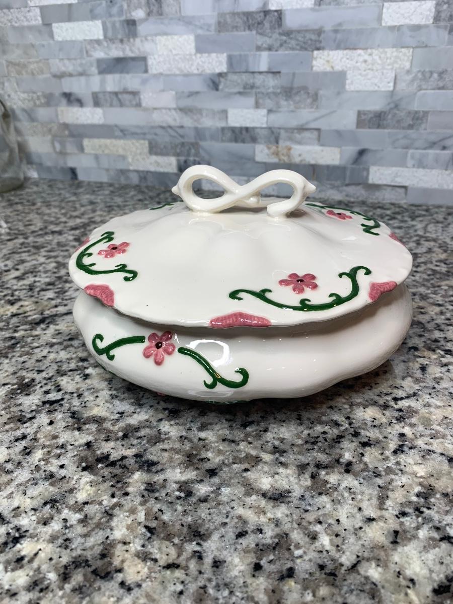 In perfect condition decorated with pink flowers and green vines finished off with a white ribbon of bow on the top of the lid.