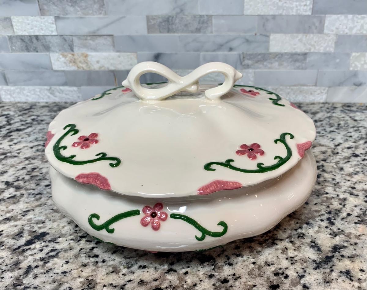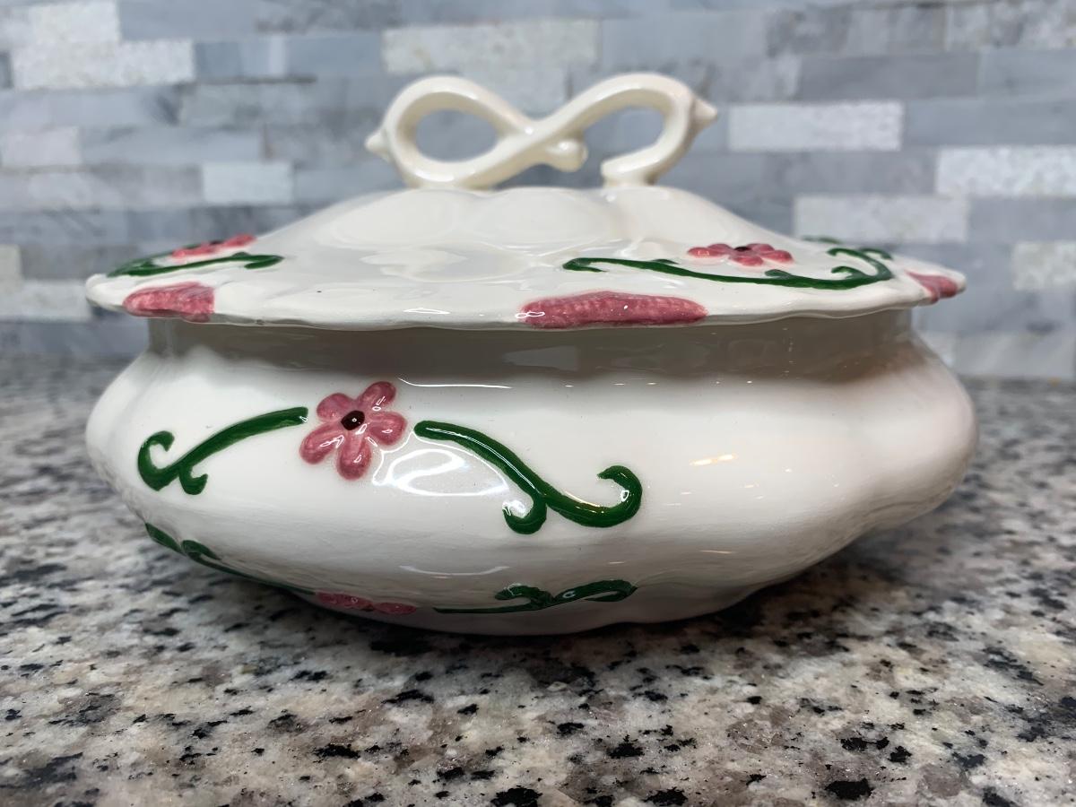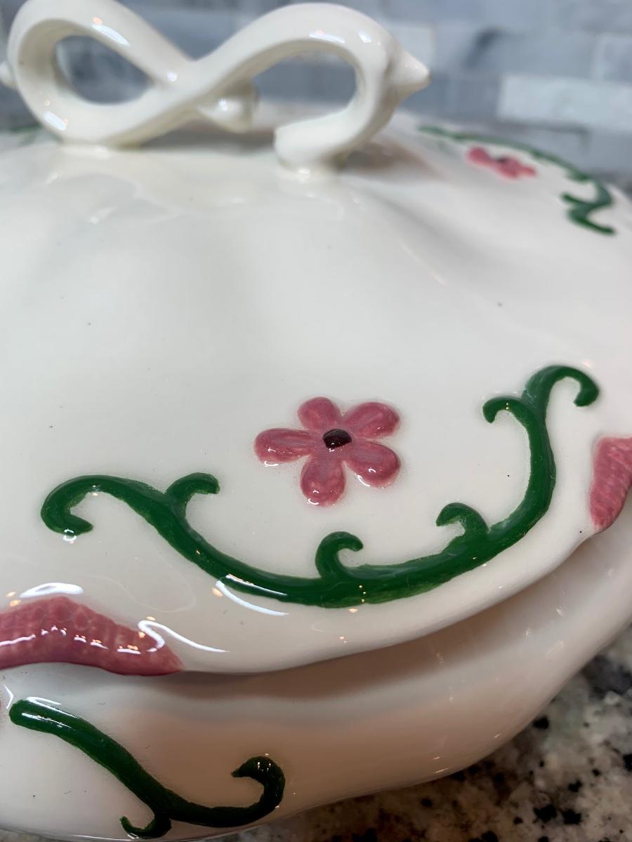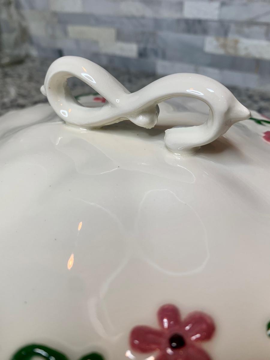 In perfect condition decorated with pink flowers and green vines finished off with a white ribbon of bow on the top of the lid.