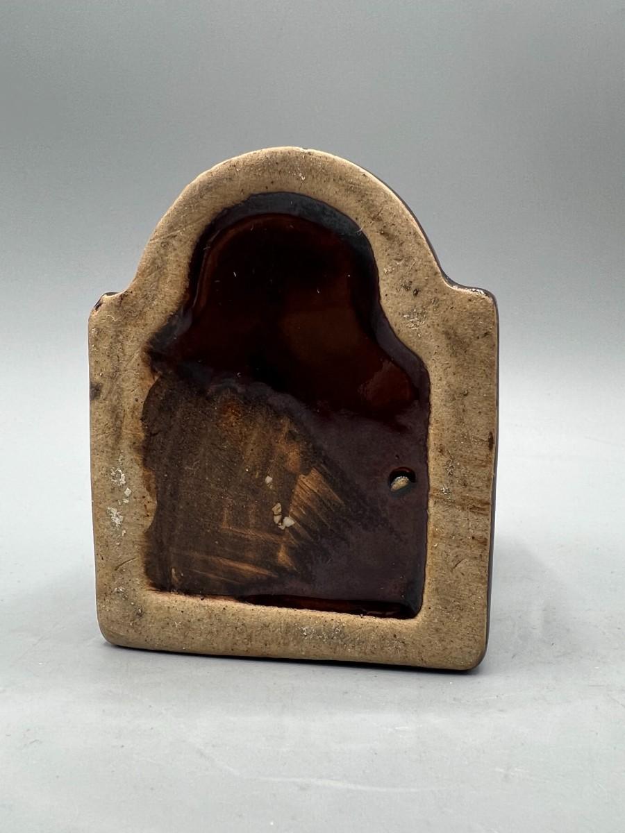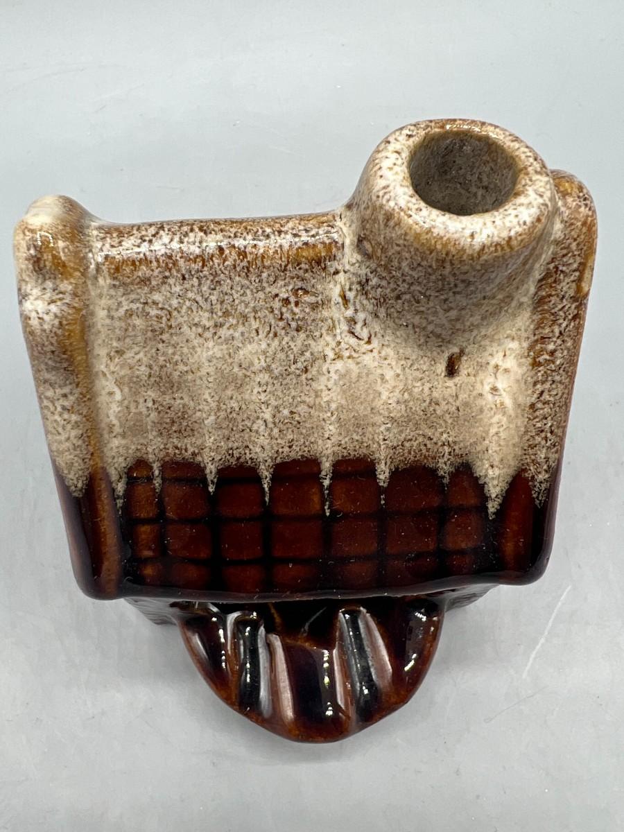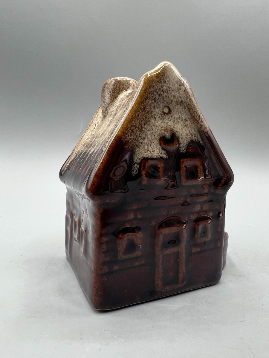 Vintage Pottery Ceramic Dripware Style Cabin House Ashtray. Under 4" size. The chimney is open, and the cigarette smoke would raise through like a fire in fireplace. Would probably work for an incense burner. Good vintage condition.