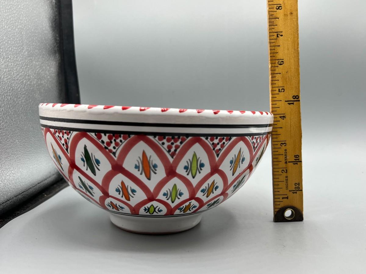 Hand painted ceramic serving bowl from Tunisia. Beautifully decorated. In good condition. Looks very similar to pottery pieces from Le Souk but unmarked possibly.