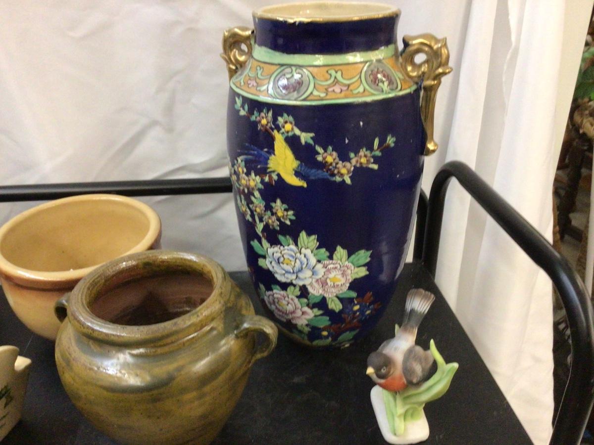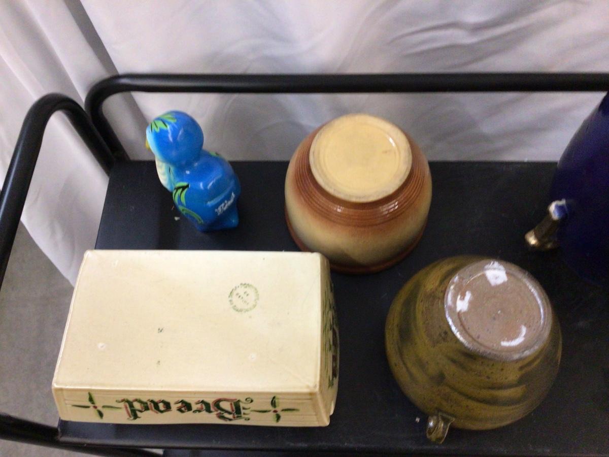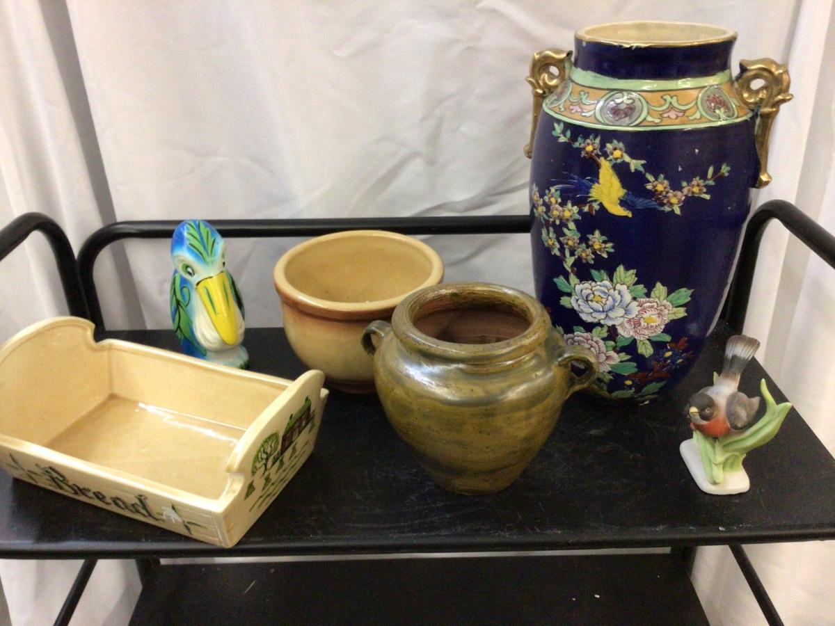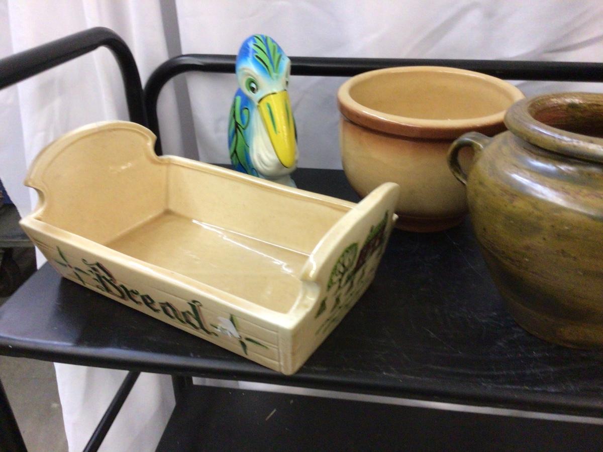 You get poppytrail bread, chalk ware bird bank, oven proof bowl, pottery bowl, and large Asian vase