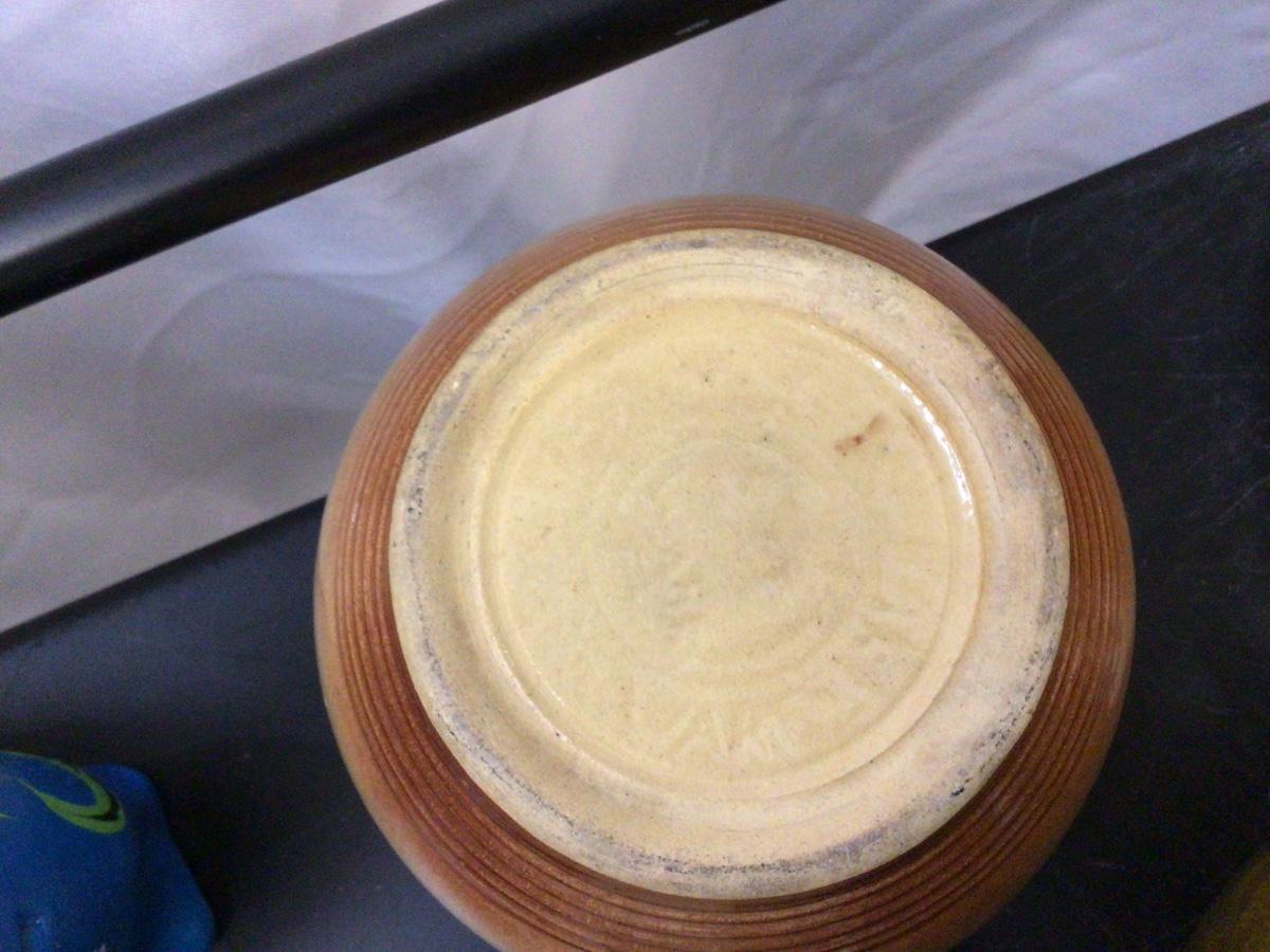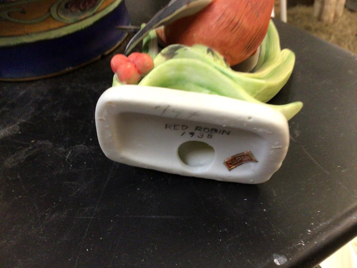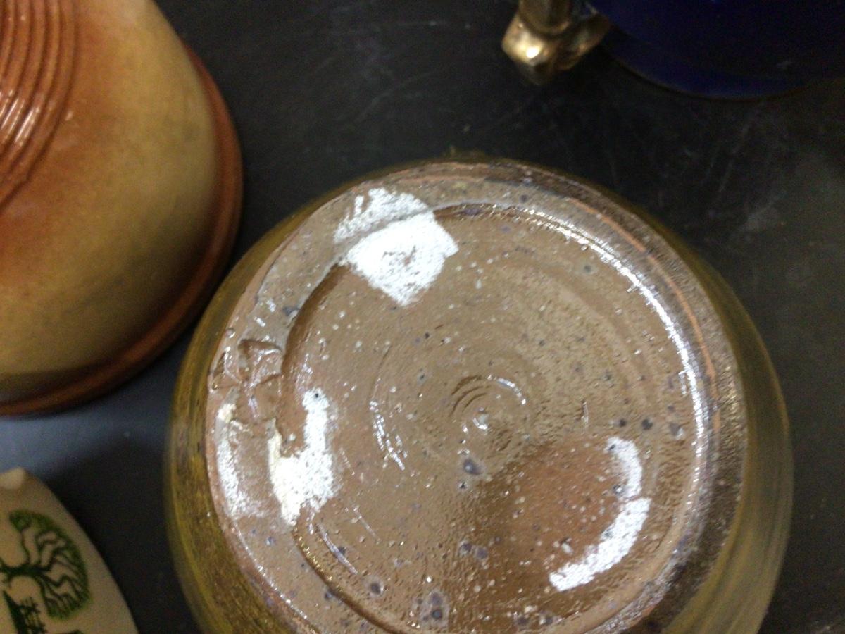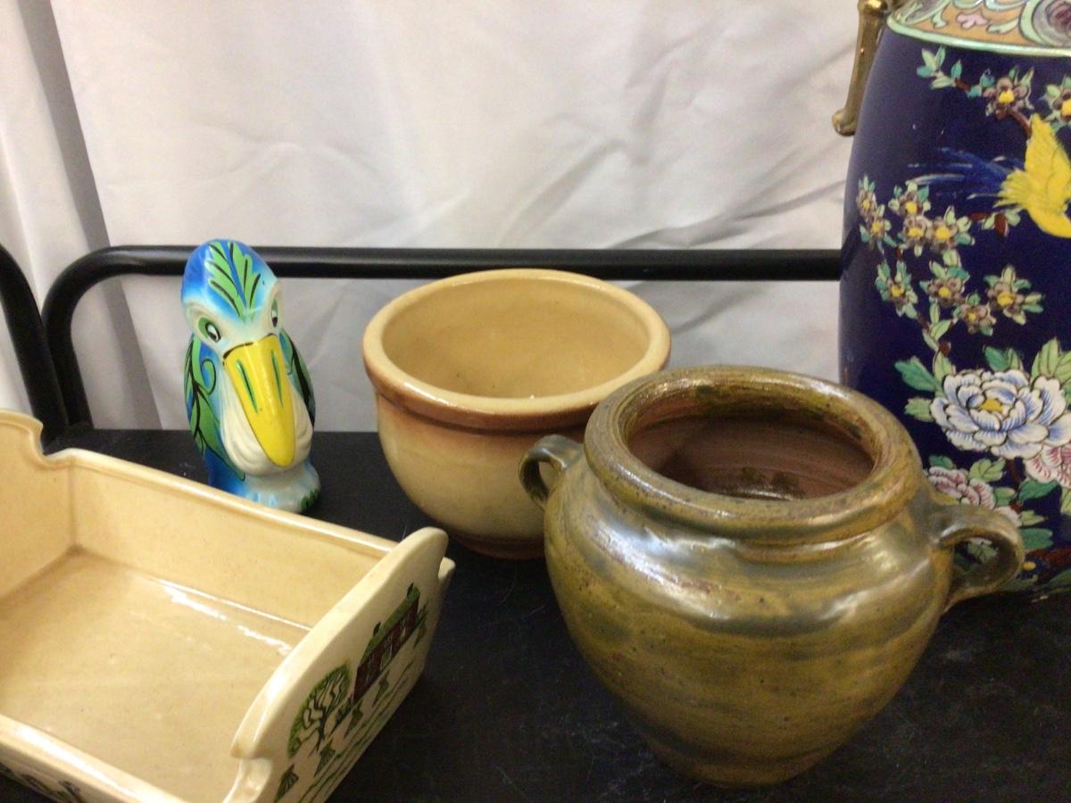You get poppytrail bread, chalk ware bird bank, oven proof bowl, pottery bowl, and large Asian vase