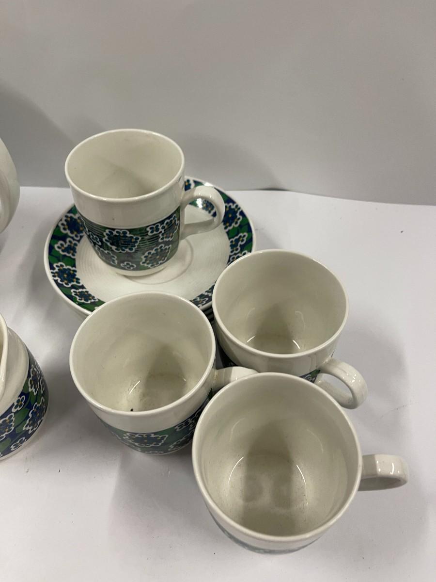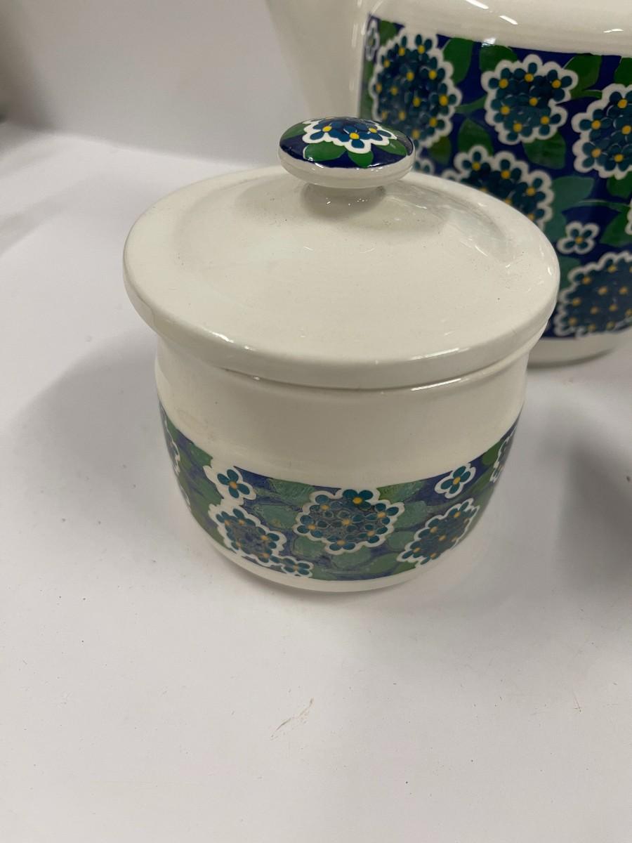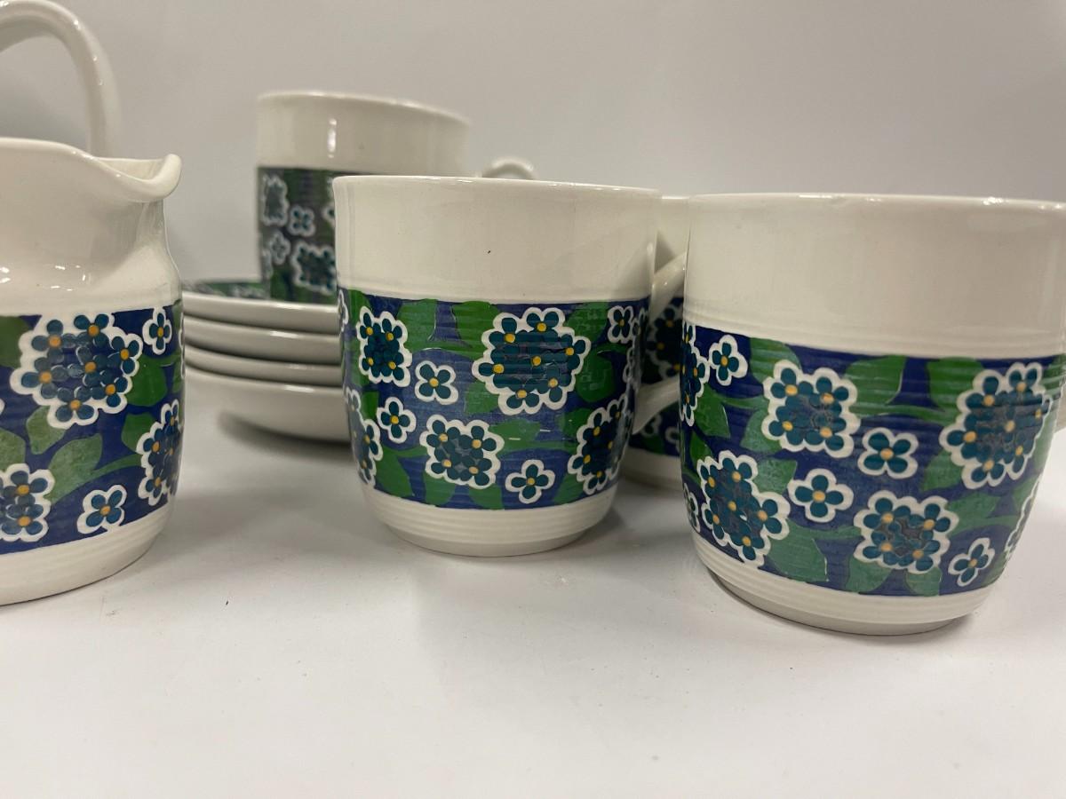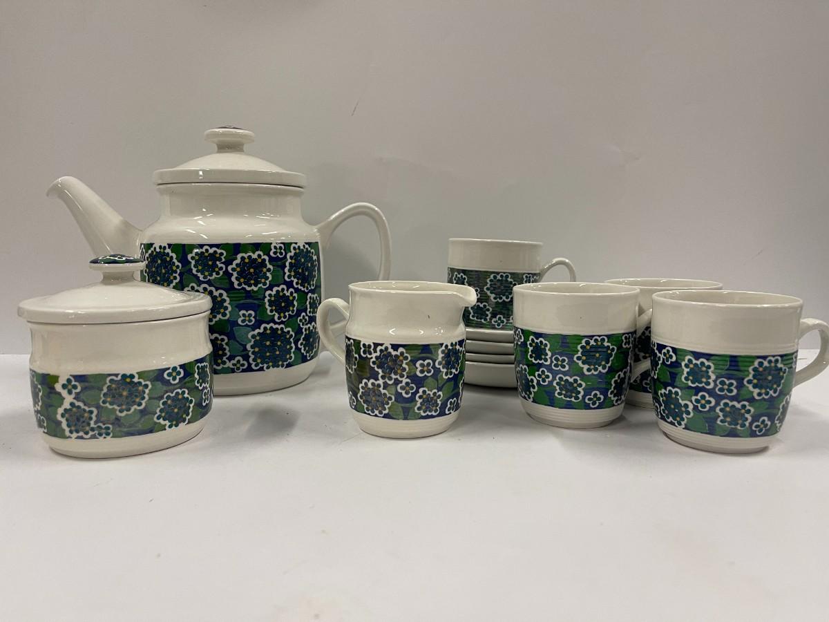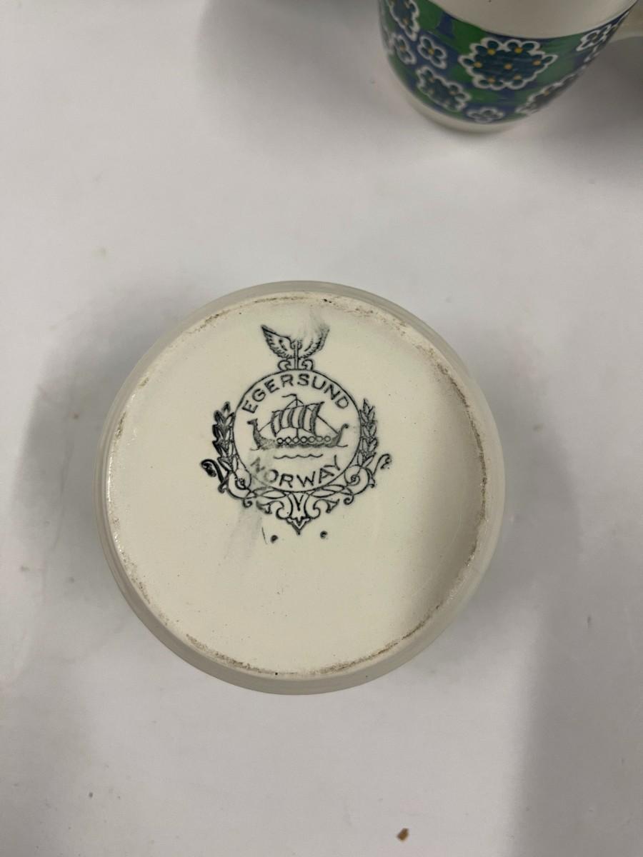 Vintage pottery tea set by Egersund, Norway, excellent condition. Includes tea pot, creamer & sugar, 4 cups and saucers. Cups are fairly small at 3" high.