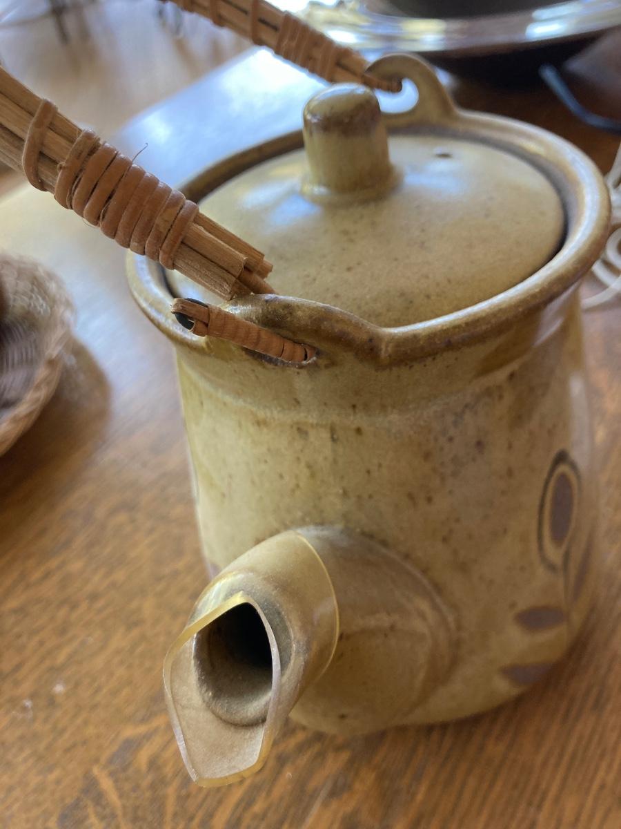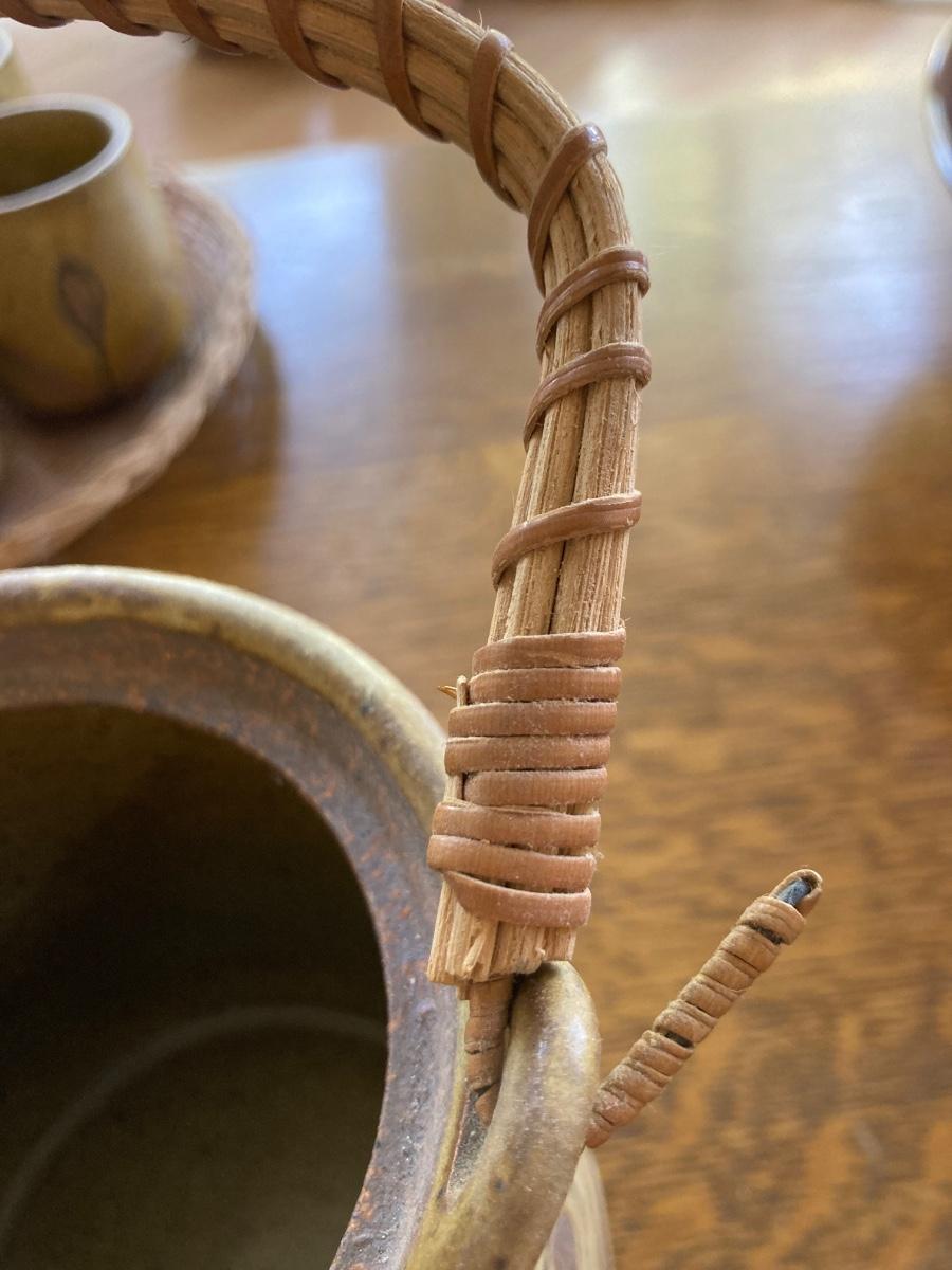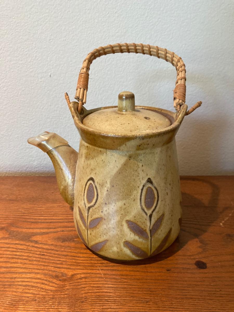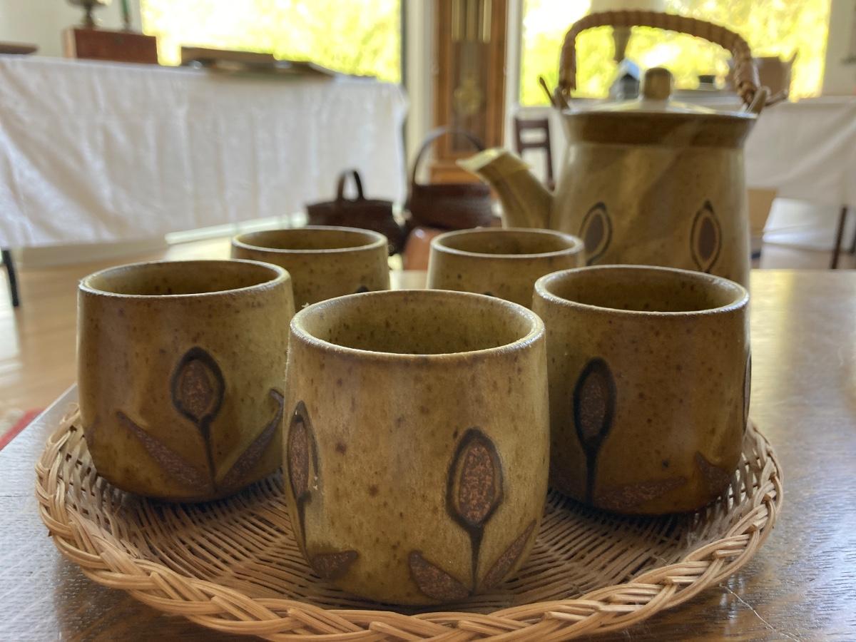 Purchased in Brazil (1989) teapot, five cups, wicker tray