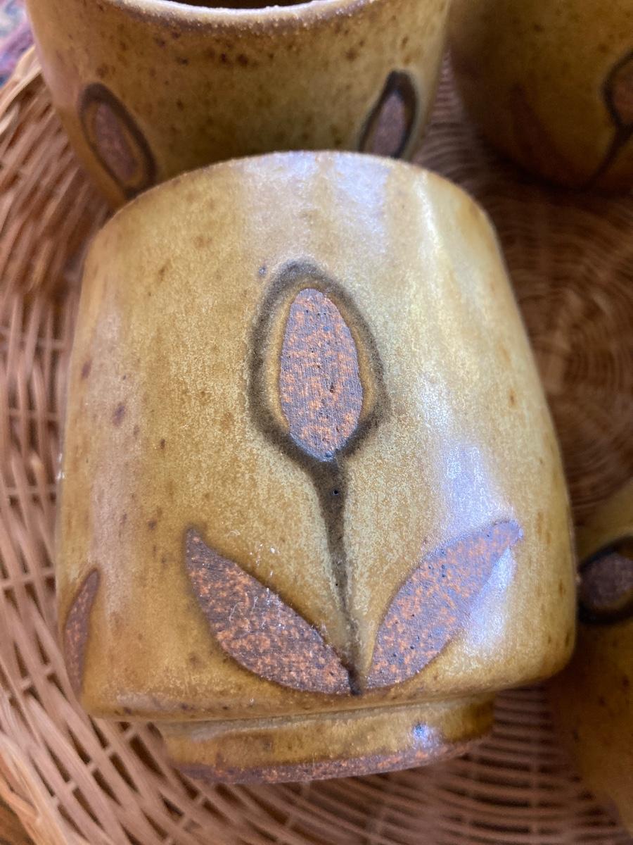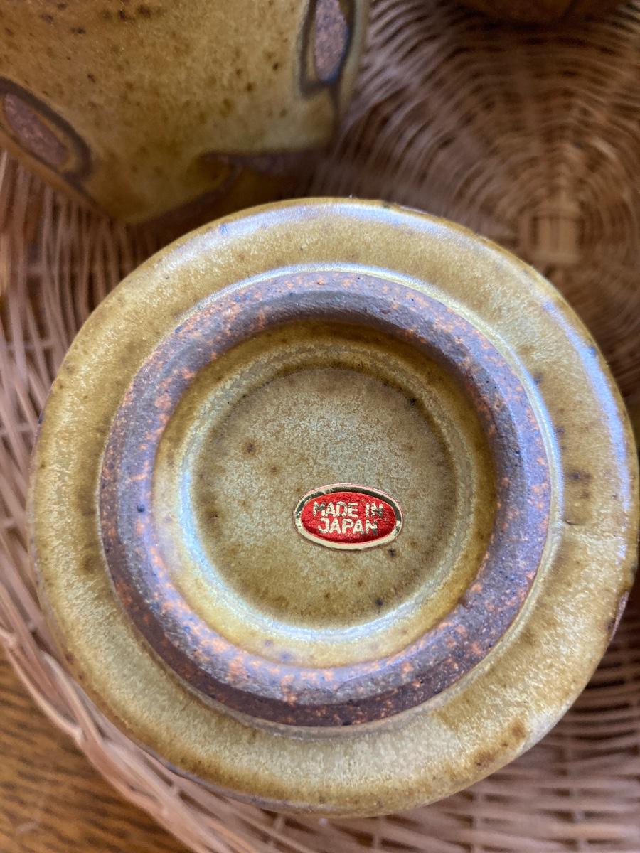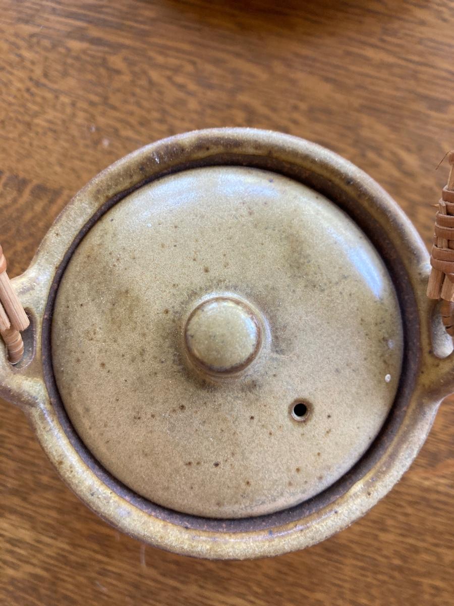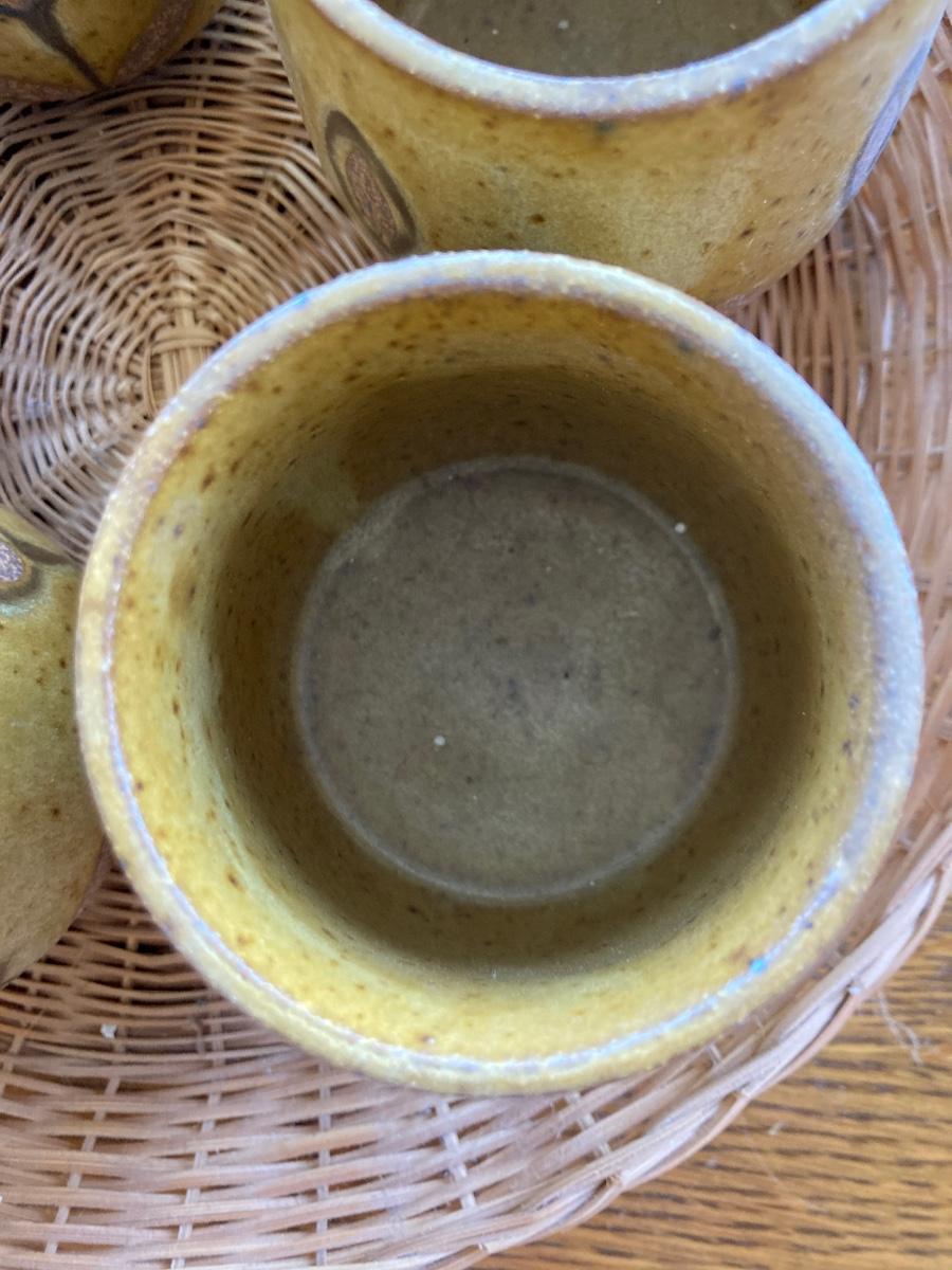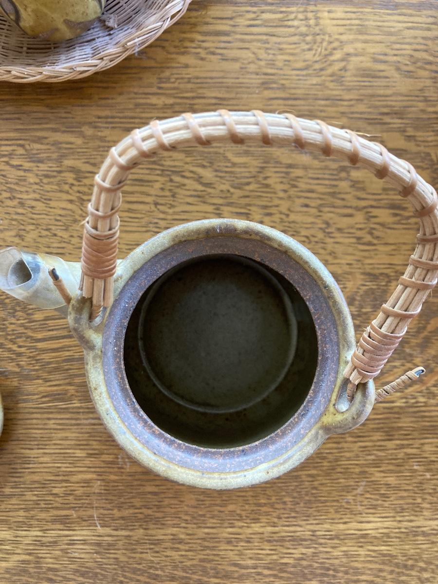 Purchased in Brazil (1989) teapot, five cups, wicker tray