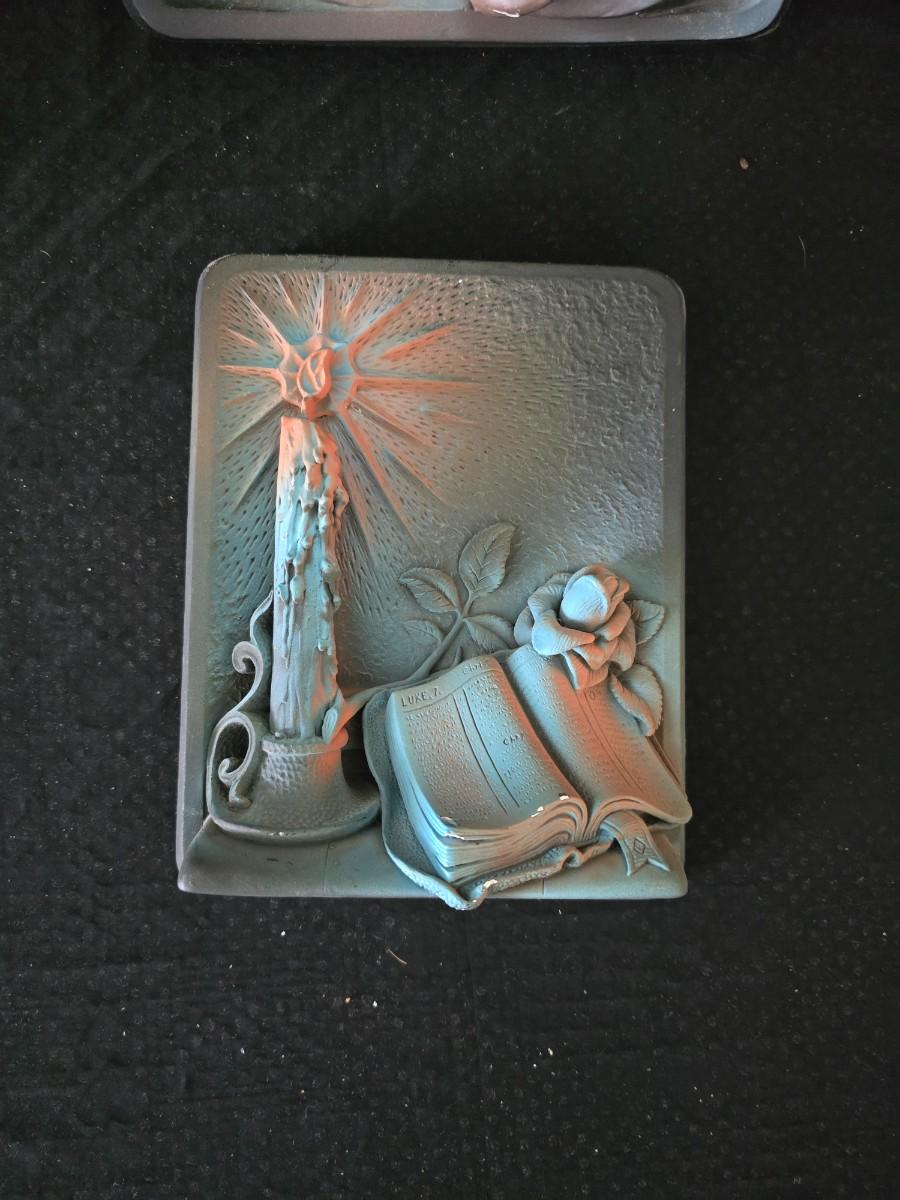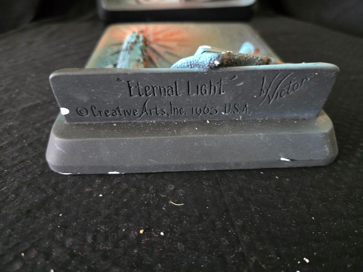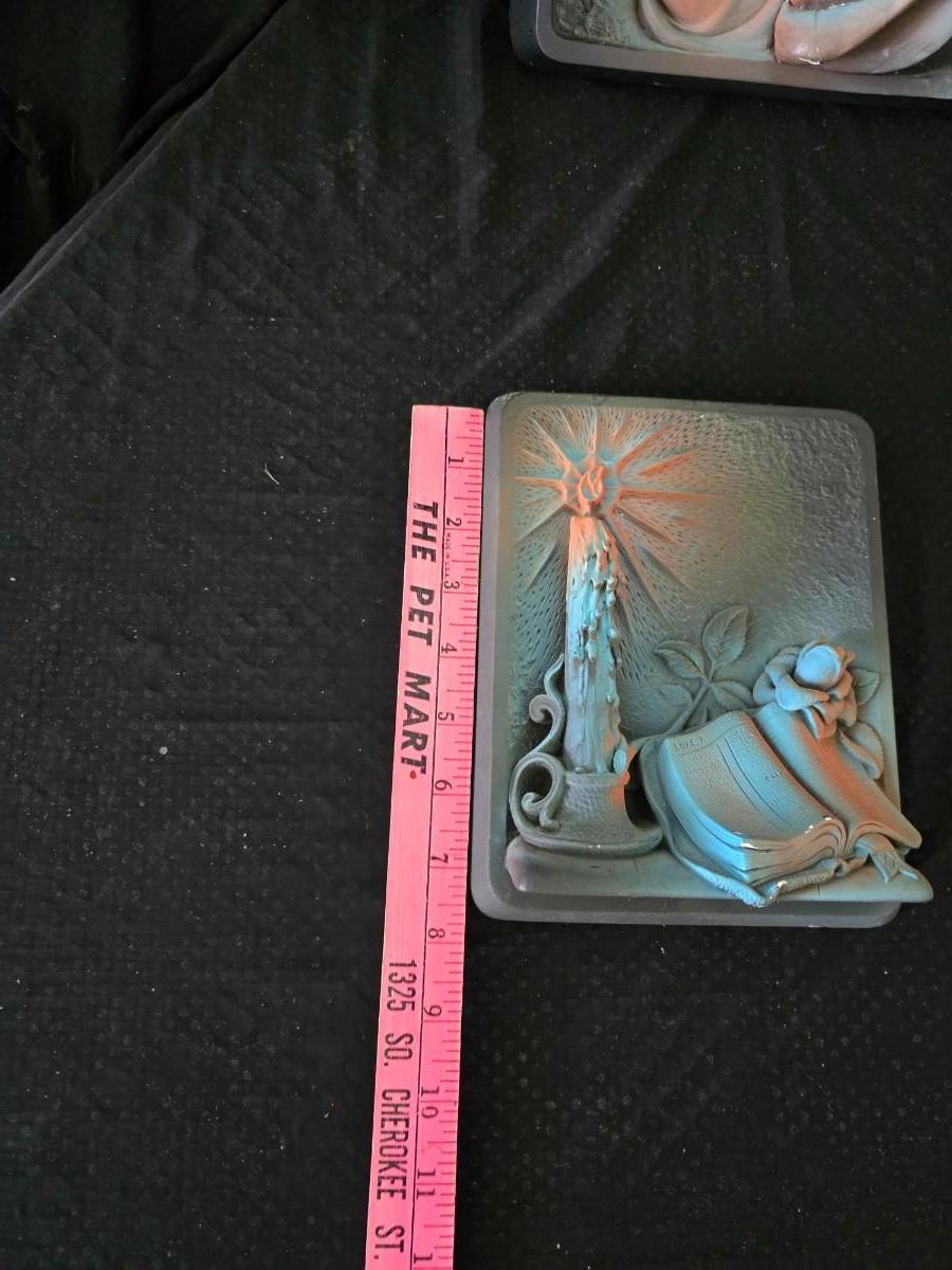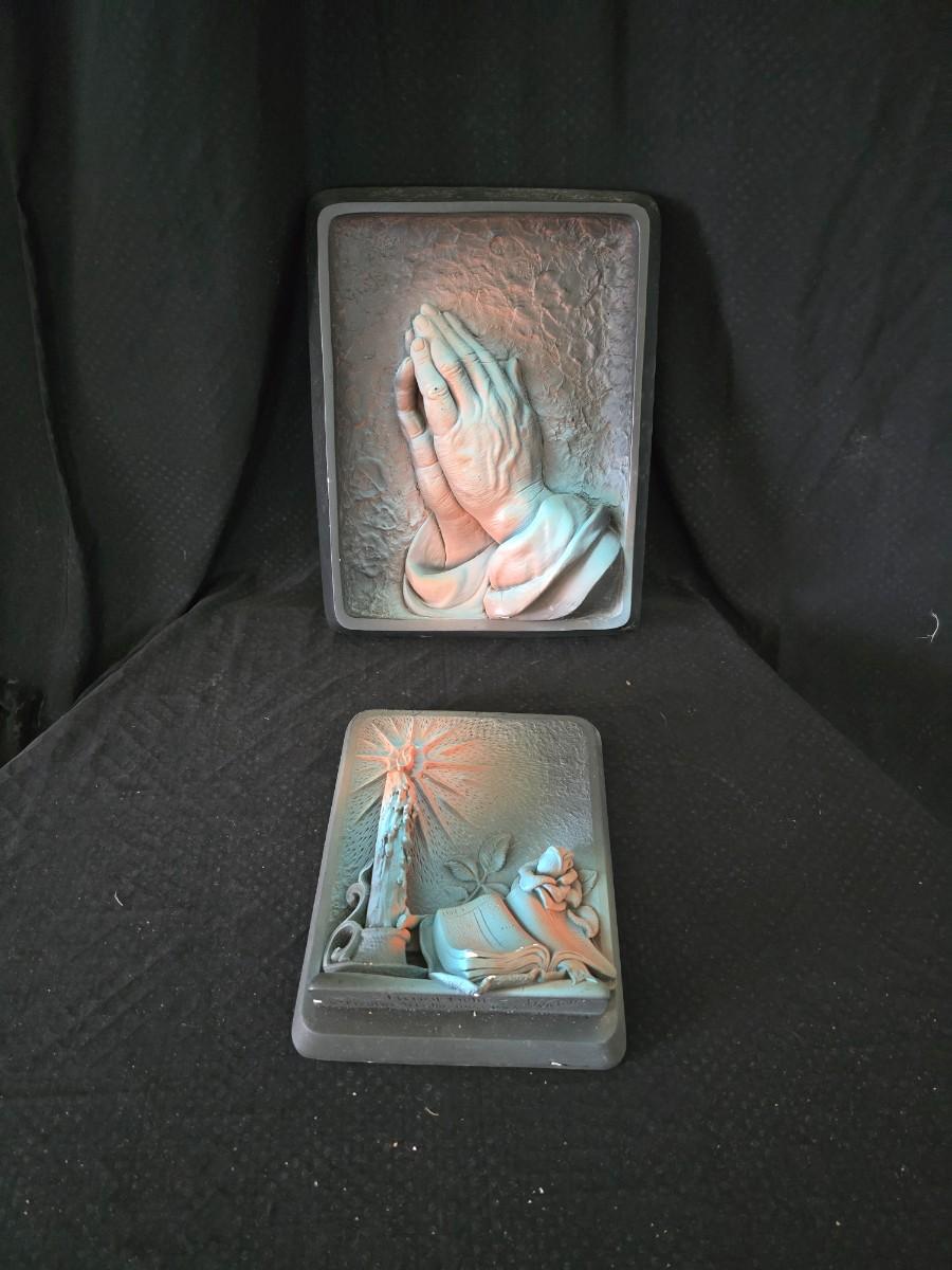 vintage "Prayer" and "Eternal Light" 3D plaques by Victor for Creative Arts, Inc., originally produced around 1959-1964.