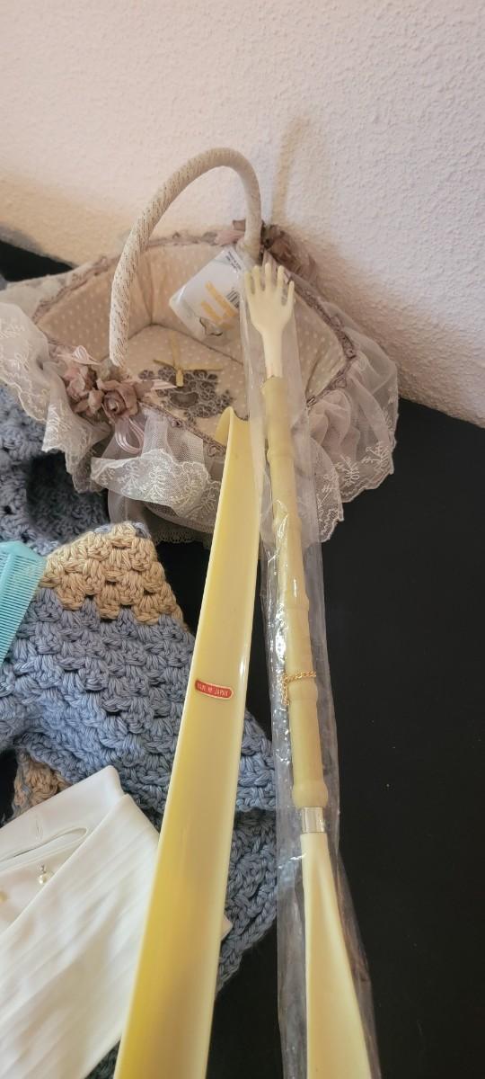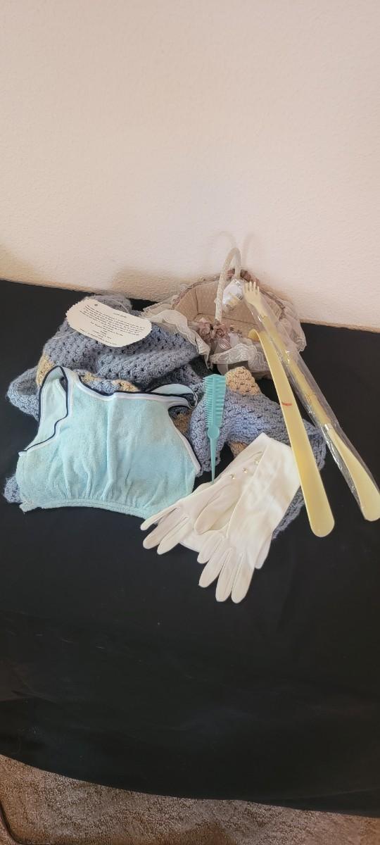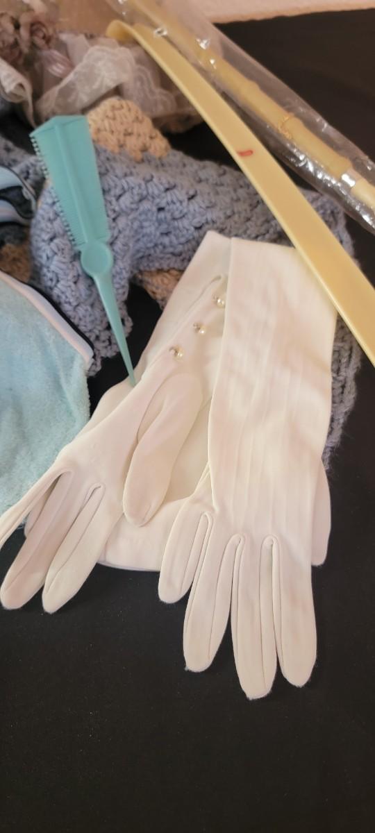 Vintage prayer shawl, button long white gloves, shoe horns.