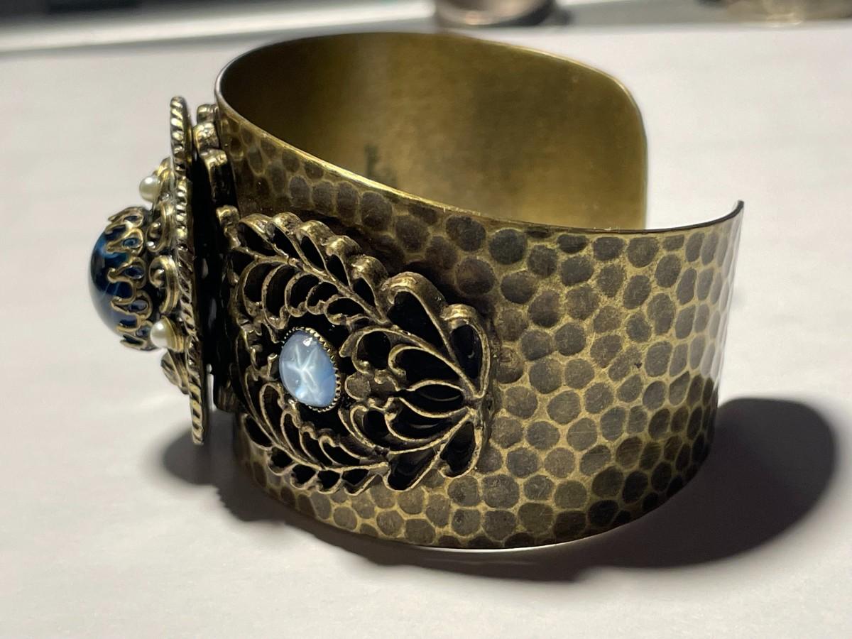 Vintage Preowned OLLIPOP Cuff Bracelet Hammered Brass Enameled w/Assorted Stones as Pictured. (Standard Size Wrist). FREE DOMESTIC SHIPPING.
