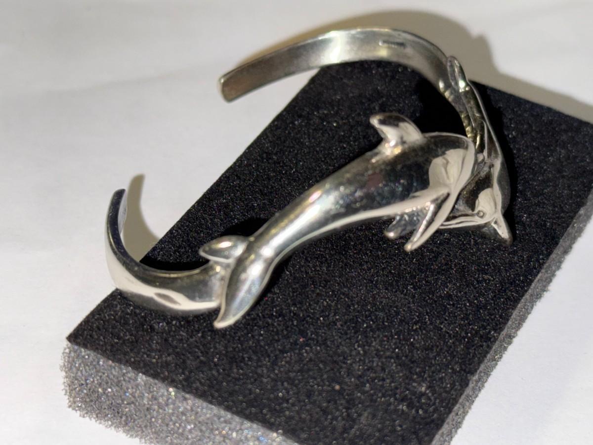 VINTAGE PREOWNED STERLING SILVER FIGURAL DOLPHIN CUFF BRACELET 17.7 GRAMS TW STANDARD SIZE 7".
