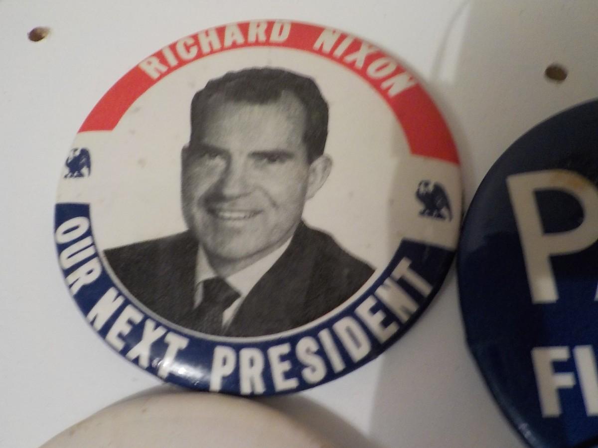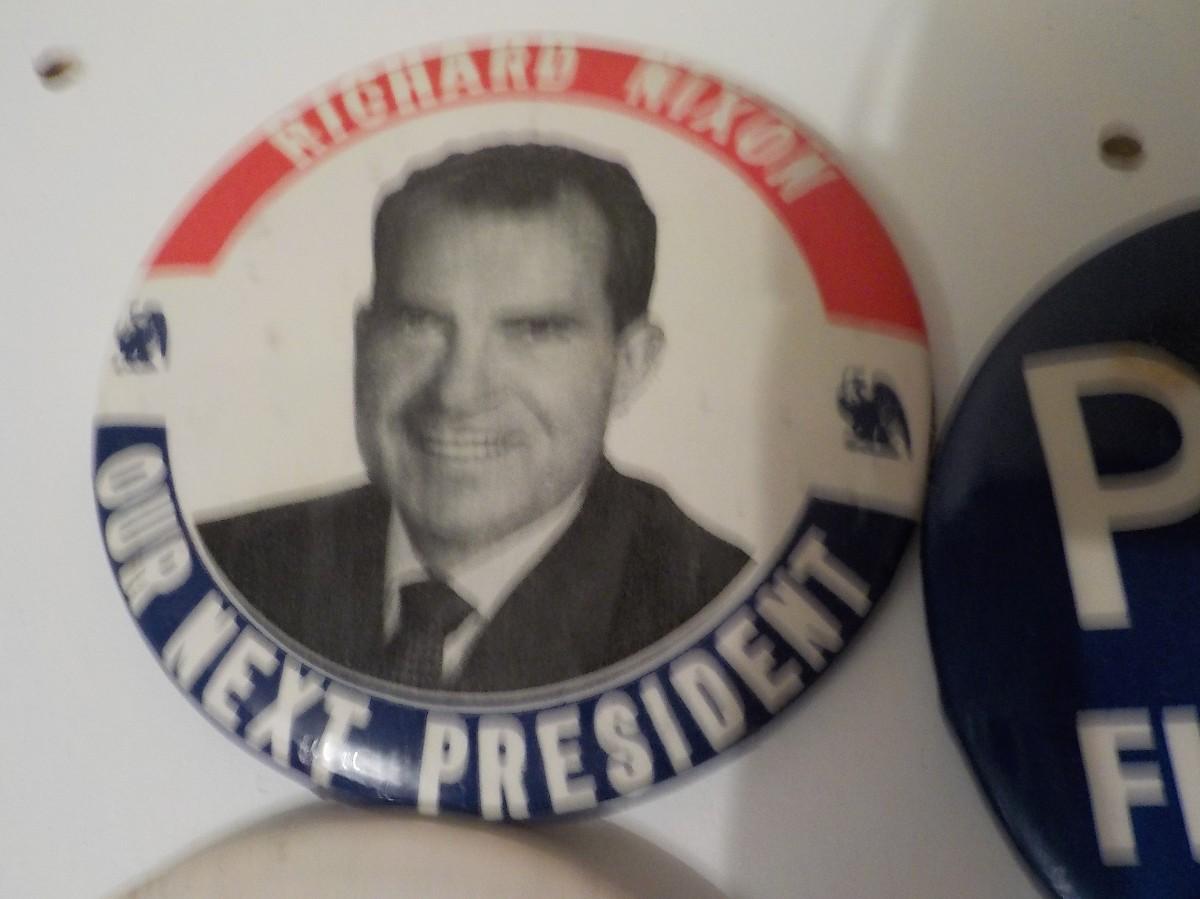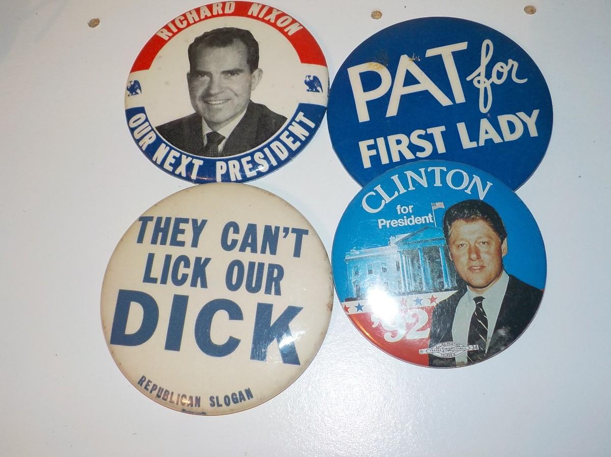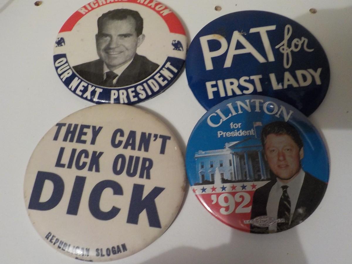 "Vintage presidential Buttons, Richard Nixon and Clinton'.