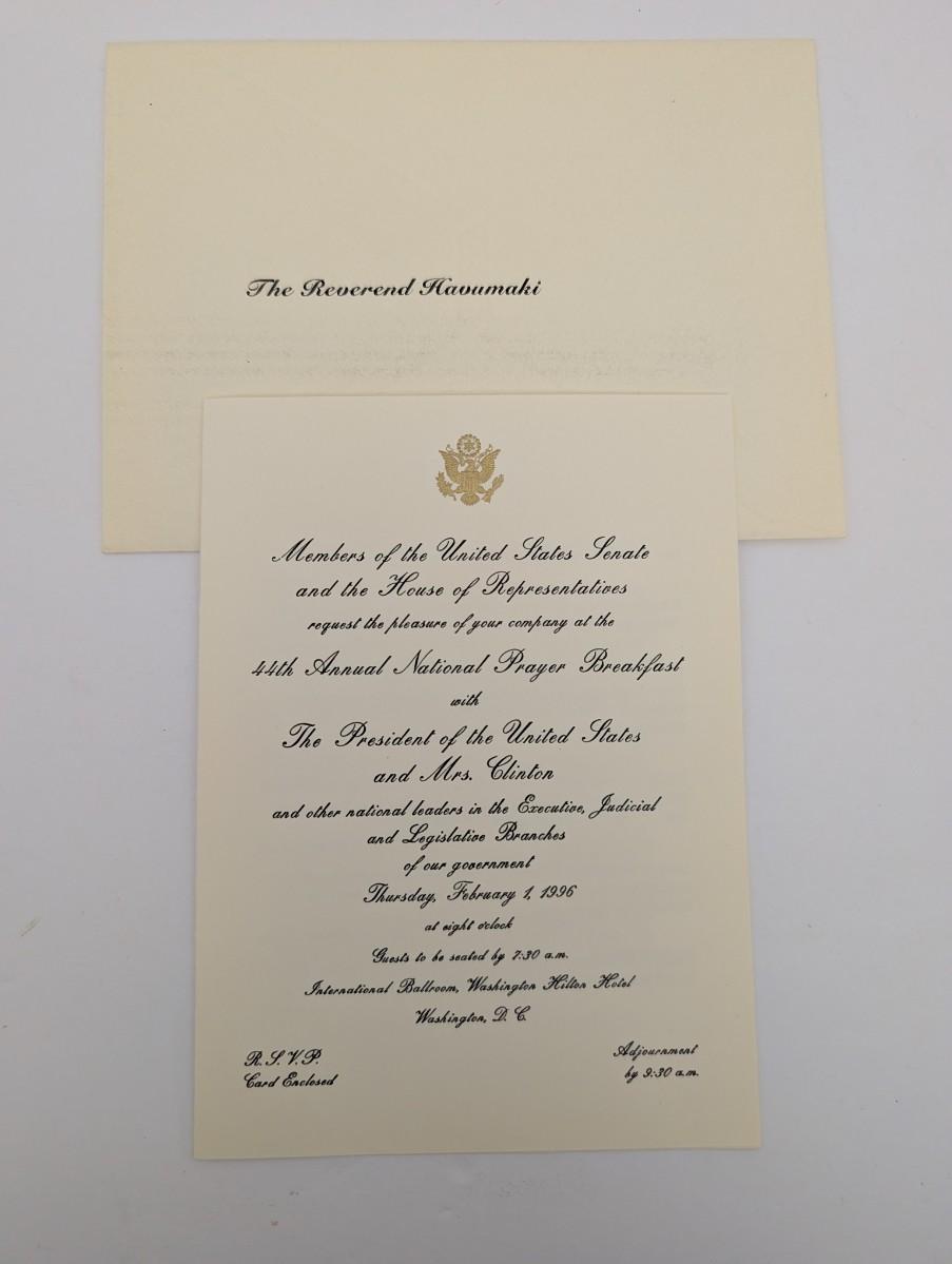 This is a rare and highly collectible piece of American political and religious history: an original invitation and addressed envelope to the 44th Annual National Prayer Breakfast held in Washington, D.C. on Thursday, February 1, 1996.