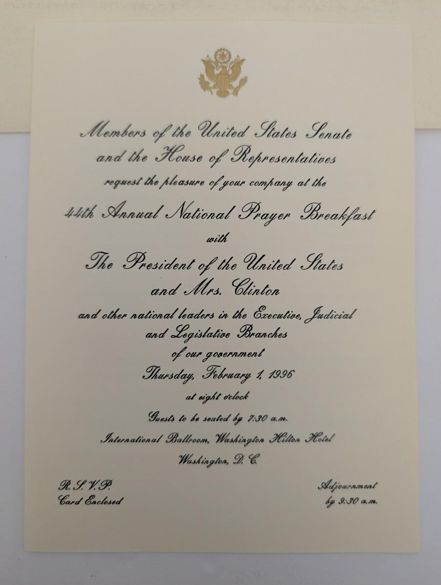 The National Prayer Breakfast is a non-partisan annual event that has been attended by every U.S. President since Dwight D. Eisenhower. Invitations to this specific event are valuable as they connect directly to a sitting President and First Lady during a specific point in history. The 1996 breakfast took place during a key year of the Clinton Presidency, as he was running for re-election.