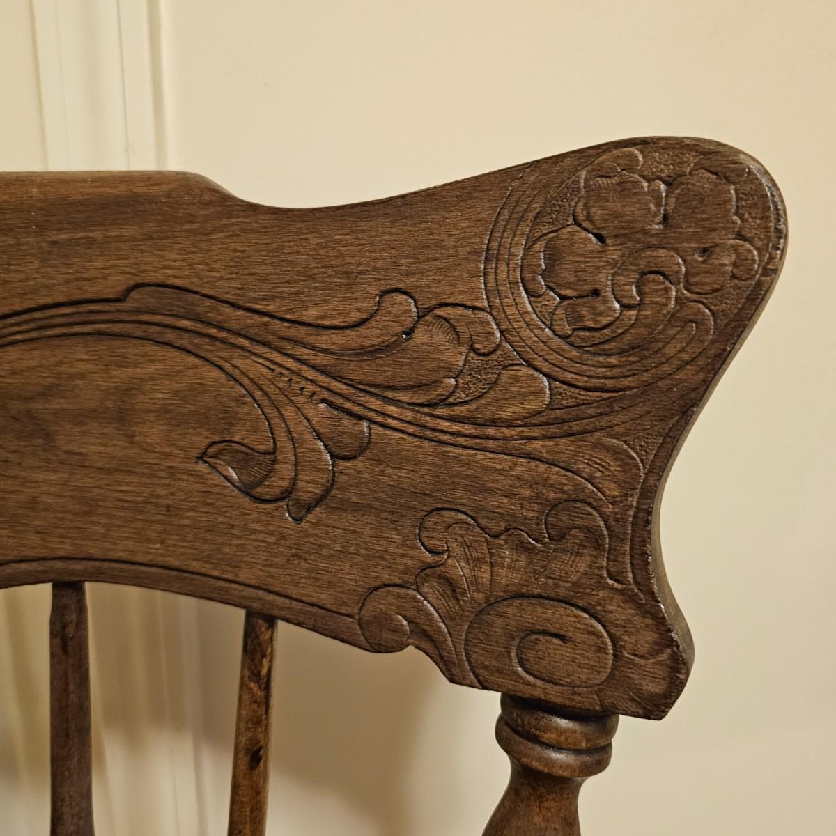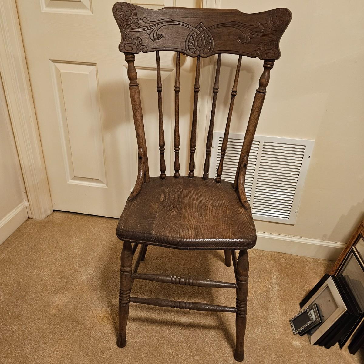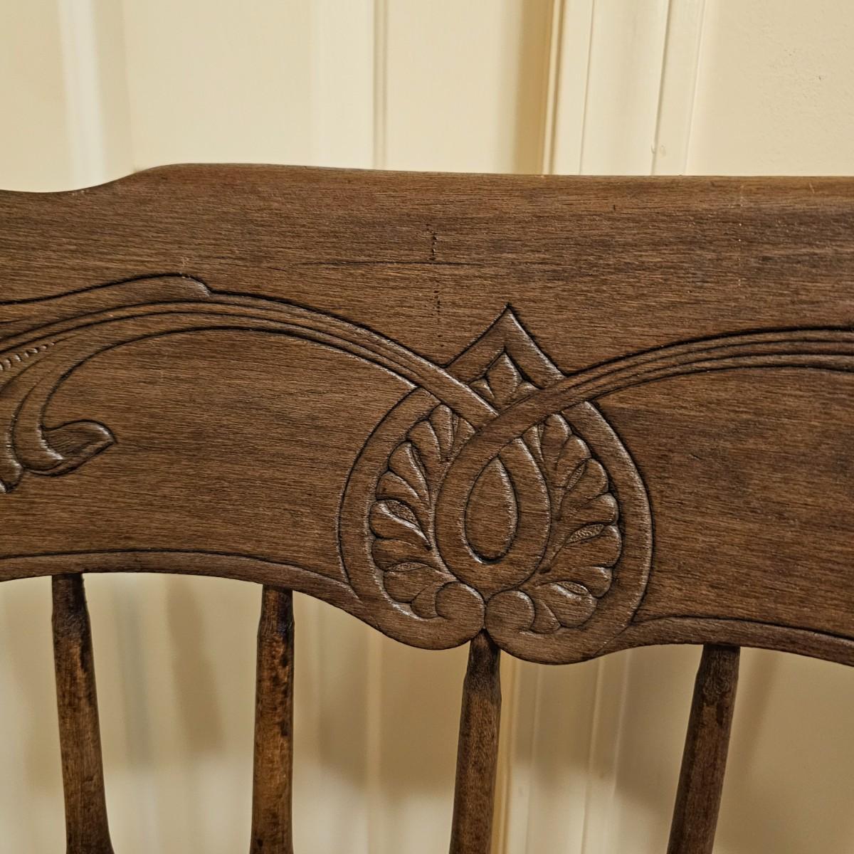 All solid oak construction, this chair has simple turned legs and stiles. A carved and decorated back has flowers and twirls within. Missing one lower rung and some nicks here and there. Chair measures 16" x 19" x 39"H, has 18" seat height. See photos for details. Local pickup only.