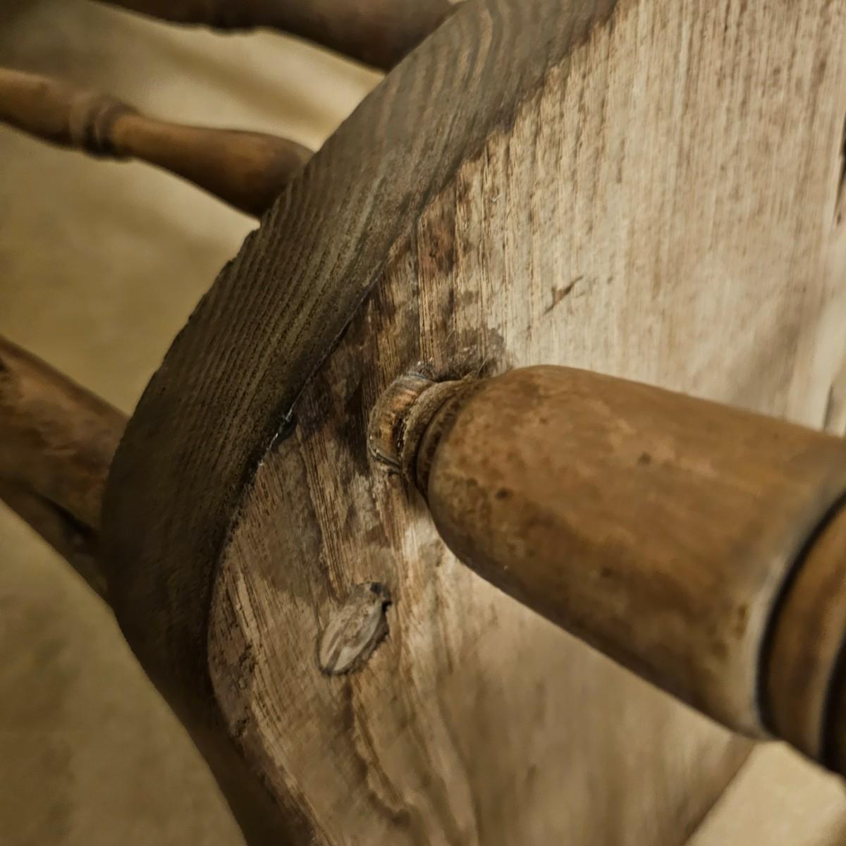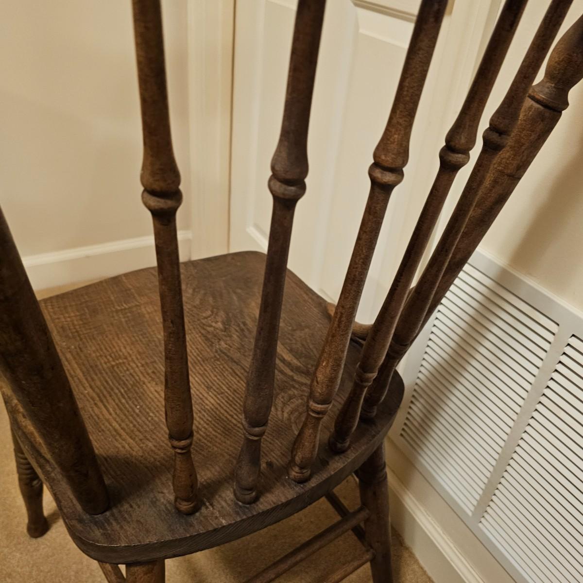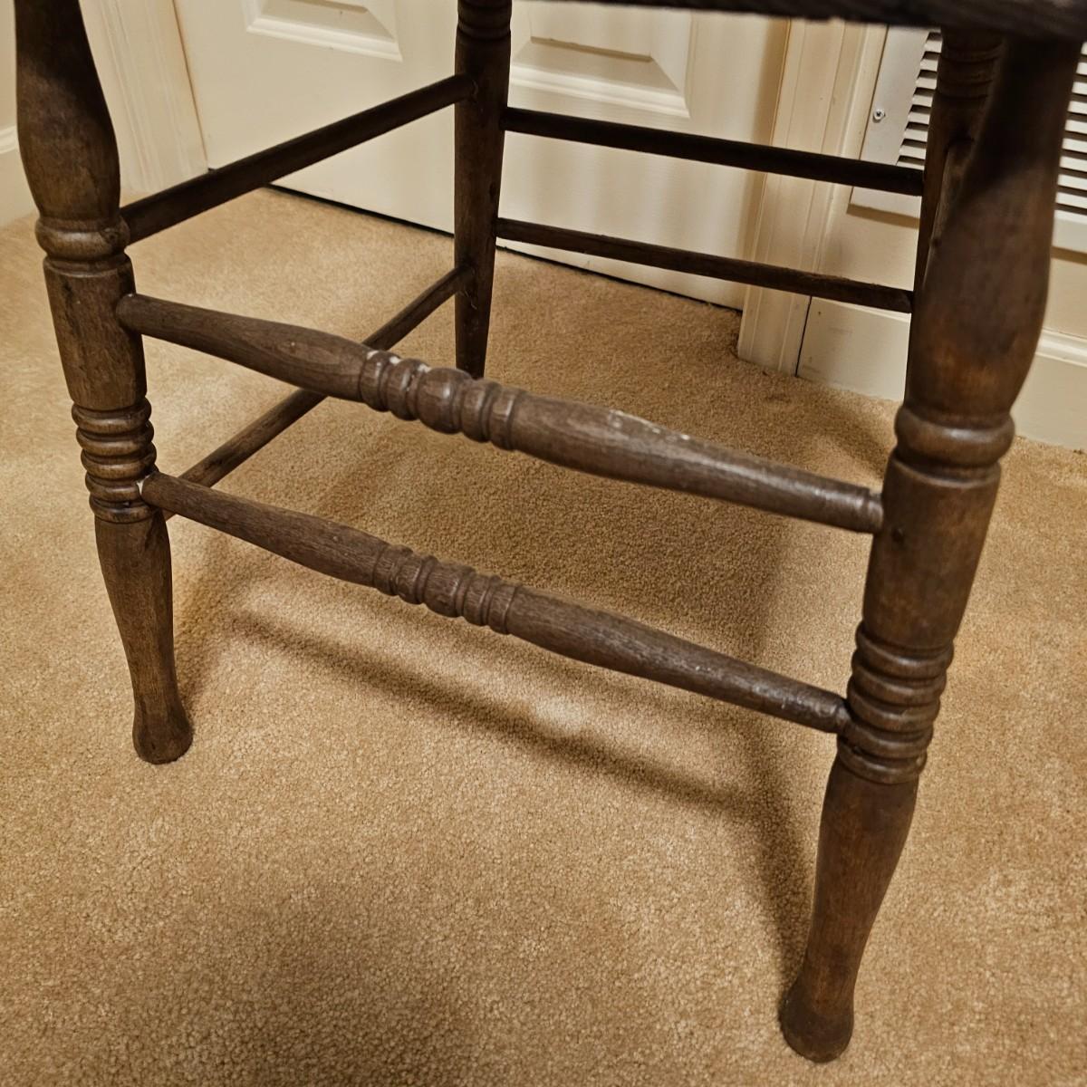 All solid oak construction, this chair has simple turned legs and stiles. A carved and decorated back has flowers and twirls within. Missing one lower rung and some nicks here and there. Chair measures 16" x 19" x 39"H, has 18" seat height. See photos for details. Local pickup only.