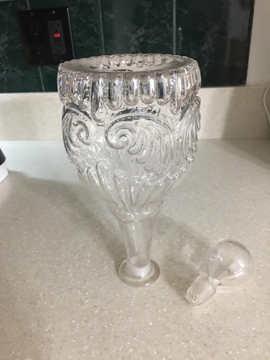 Vintage pressed glass decanter with ball stopper. Ready to use for your wine or liquor. Good condition no chips or cracks. Measures 11” tall. Beautiful addition to your home bar.