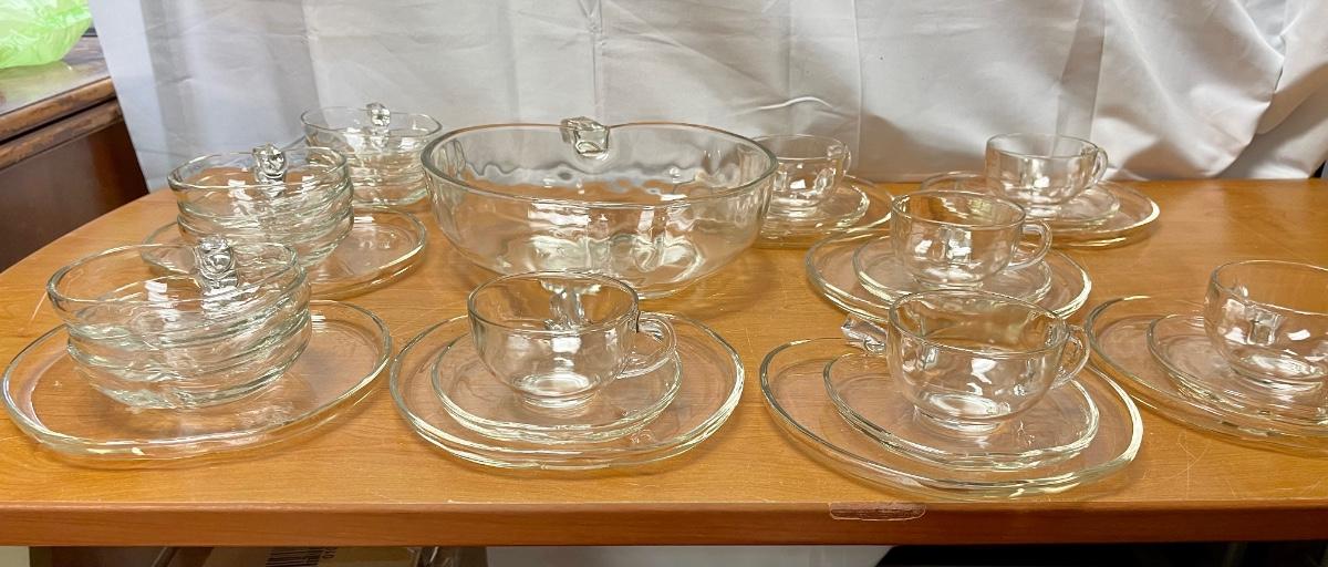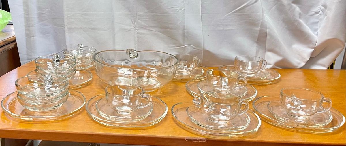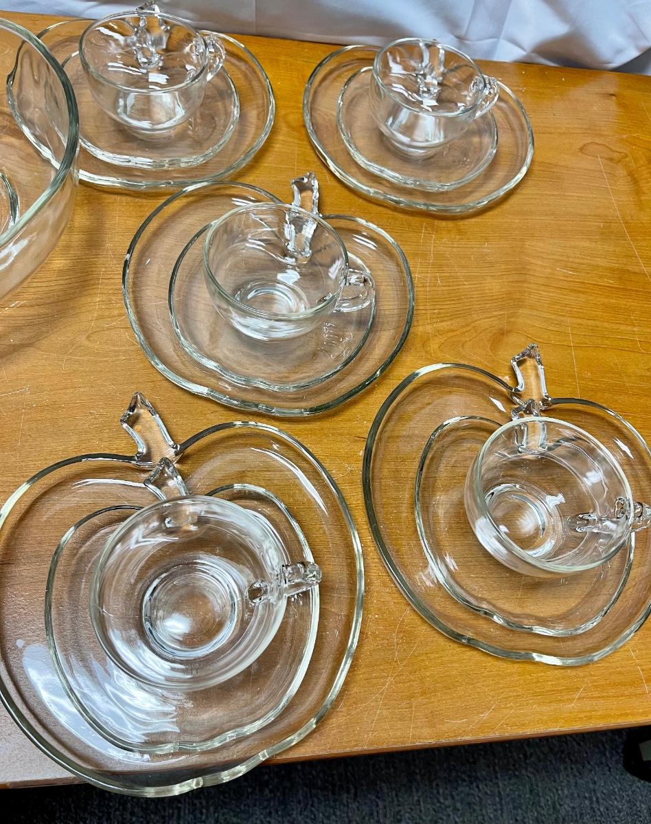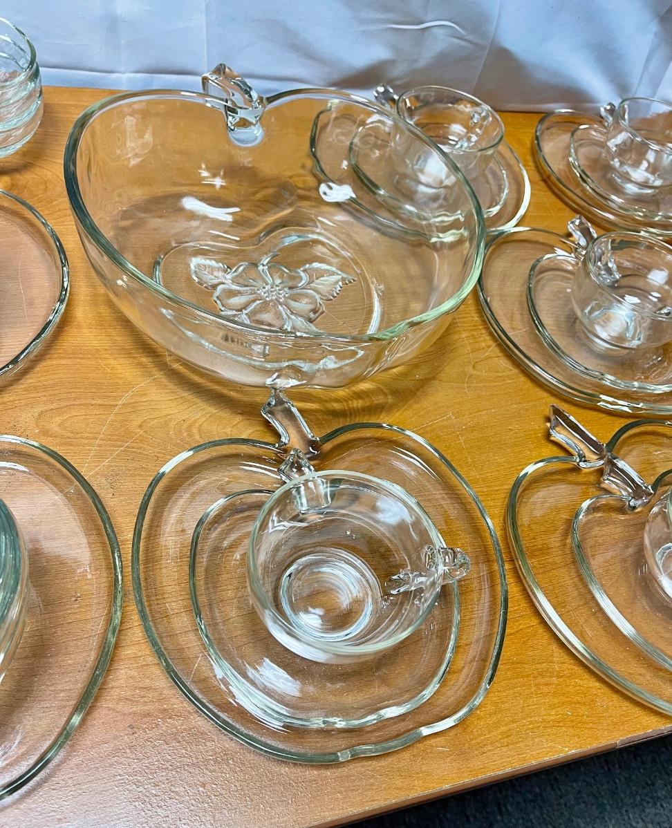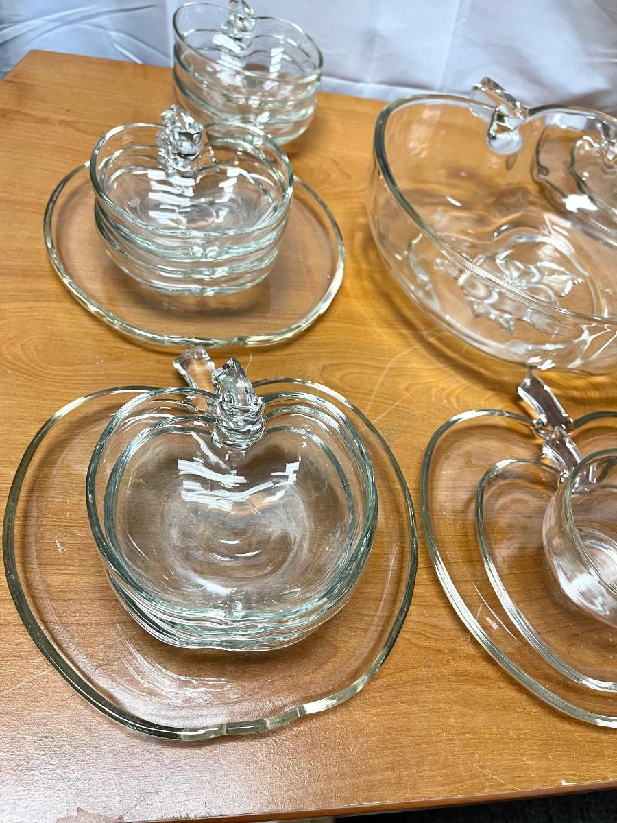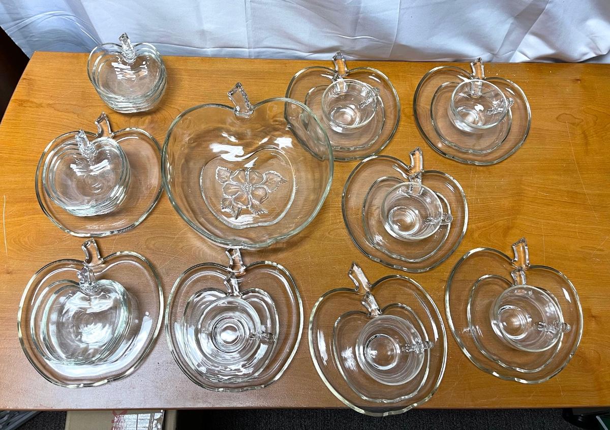 Vintage Pressed Glass Set of Apple Shaped Luncheon Dishes. Large set may be multiple sets together. Includes a serving bowl, lunch plates, cup & saucers, and berry/dessert bowls. Service for 8. Good condition.