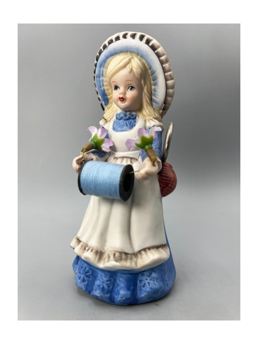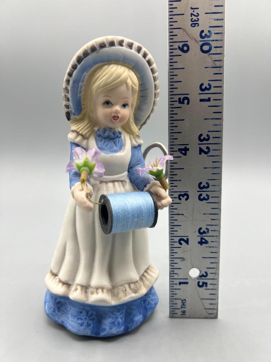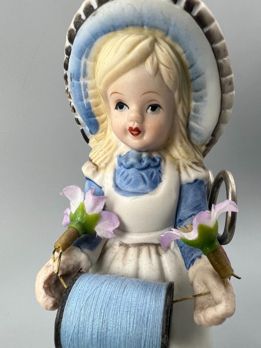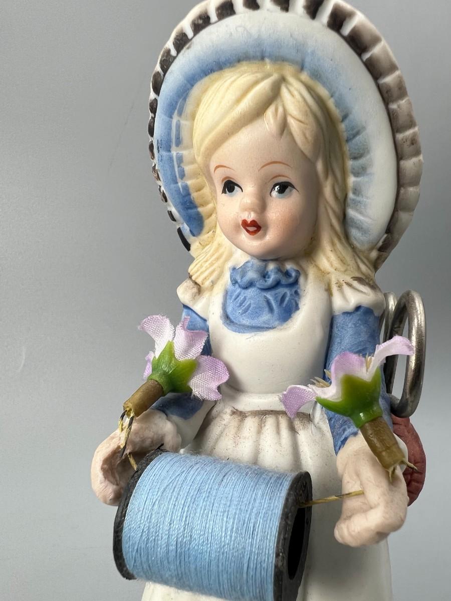 Vintage Price Products Sewing String Spool Holder & Scissors Flower Girl Ceramic Figurine