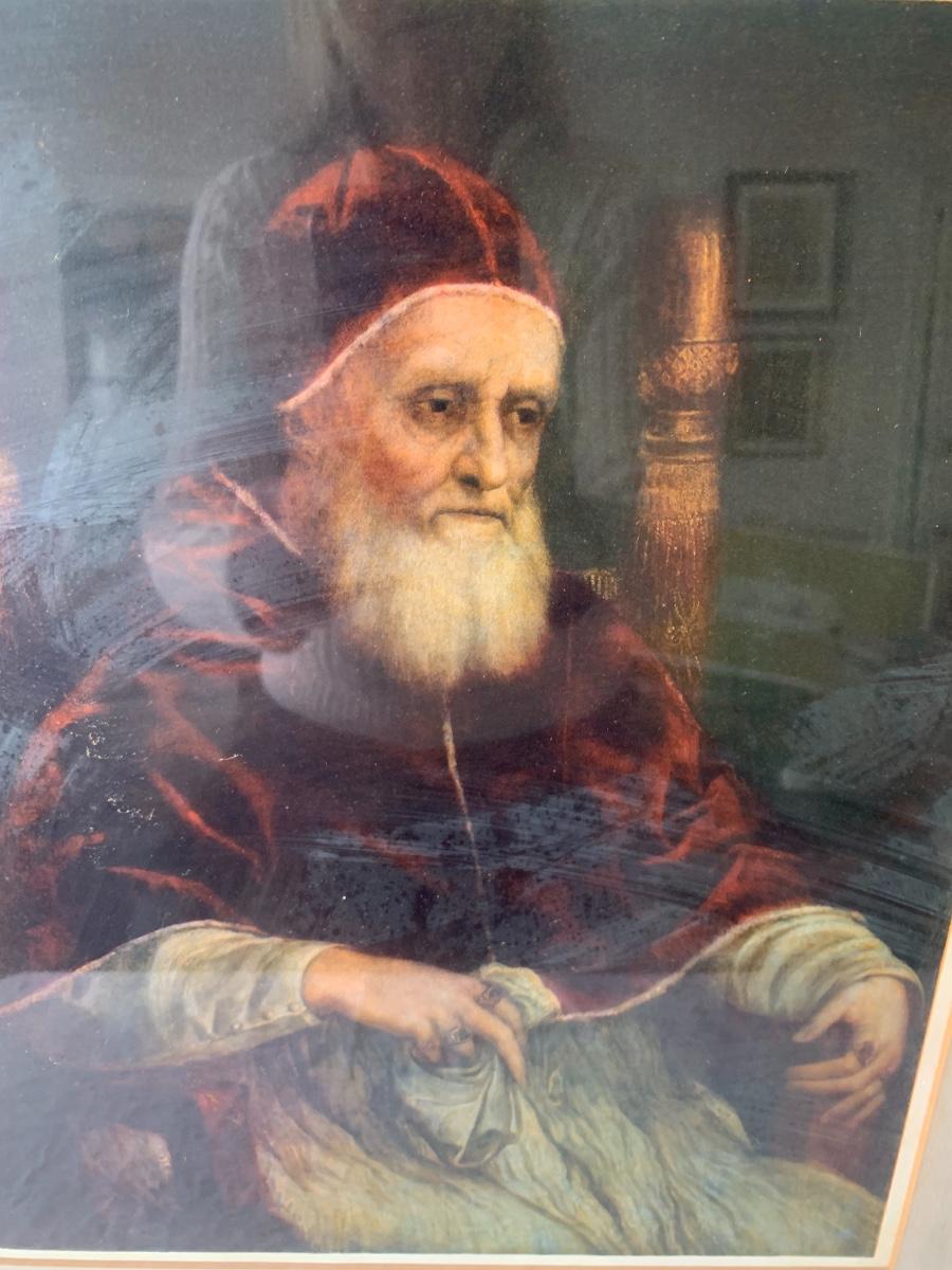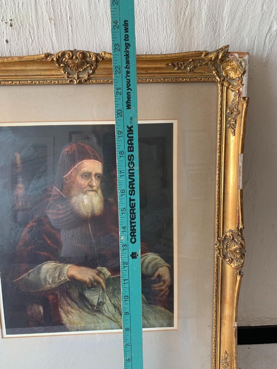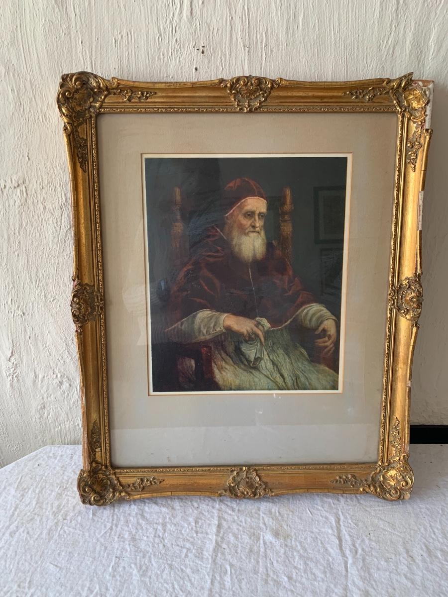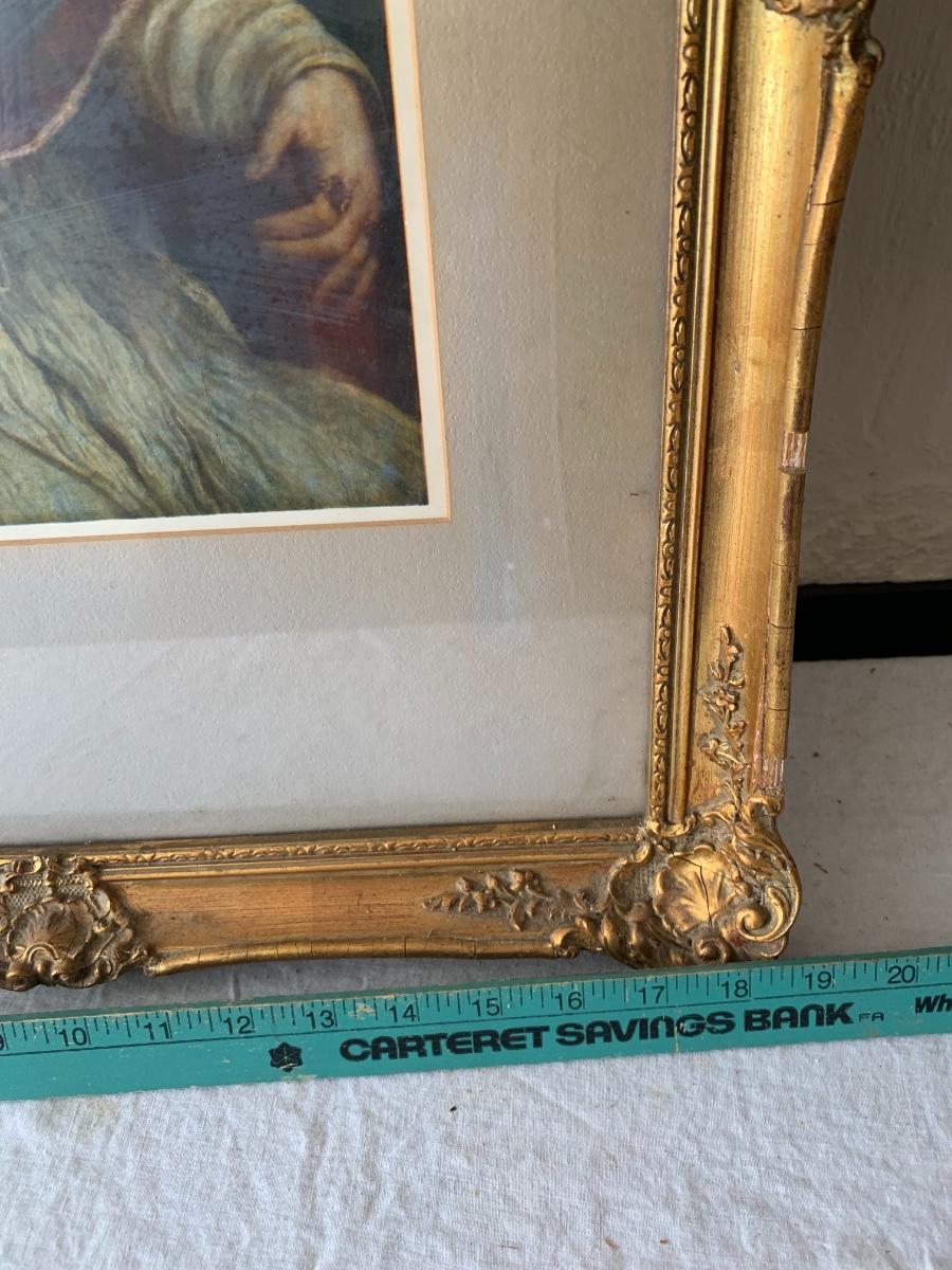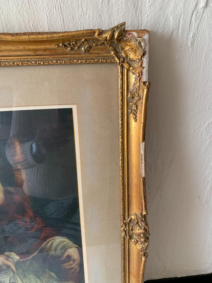 Vintage print in gold painted elaborate frame. There is some damage on frame. Cool elegance!