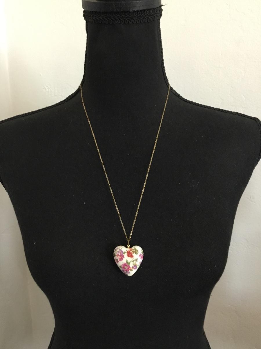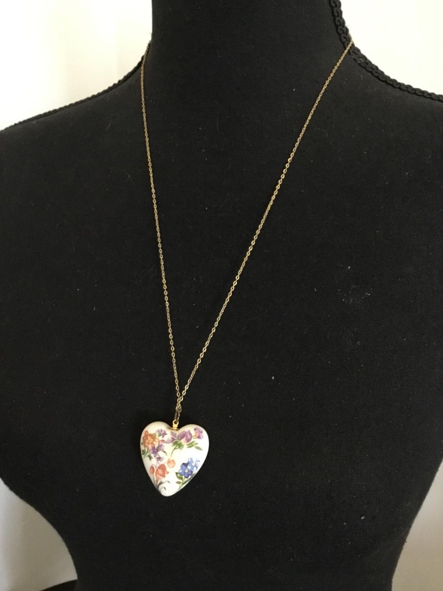 Vintage, puffy, heart, ceramic pendant, necklace, gold tone, chain necklace