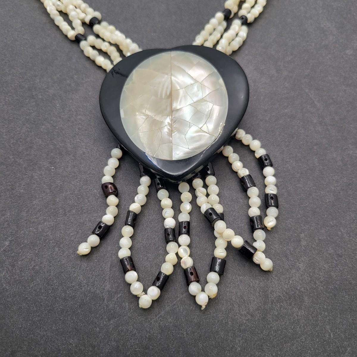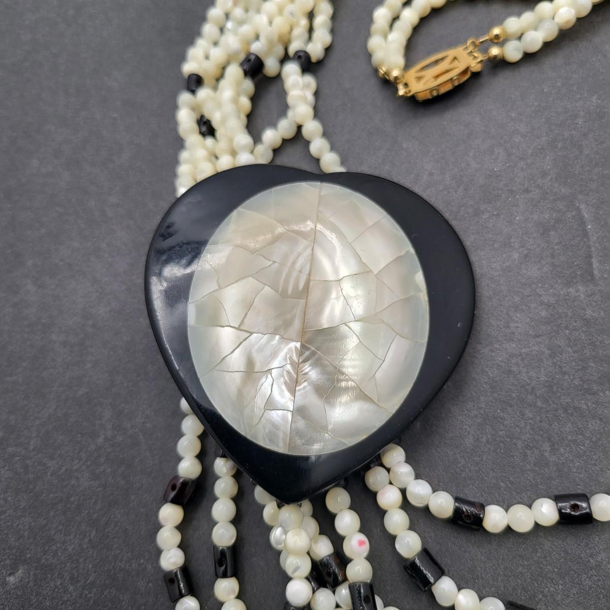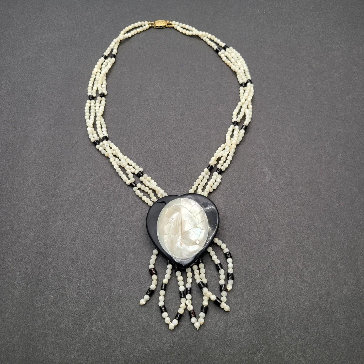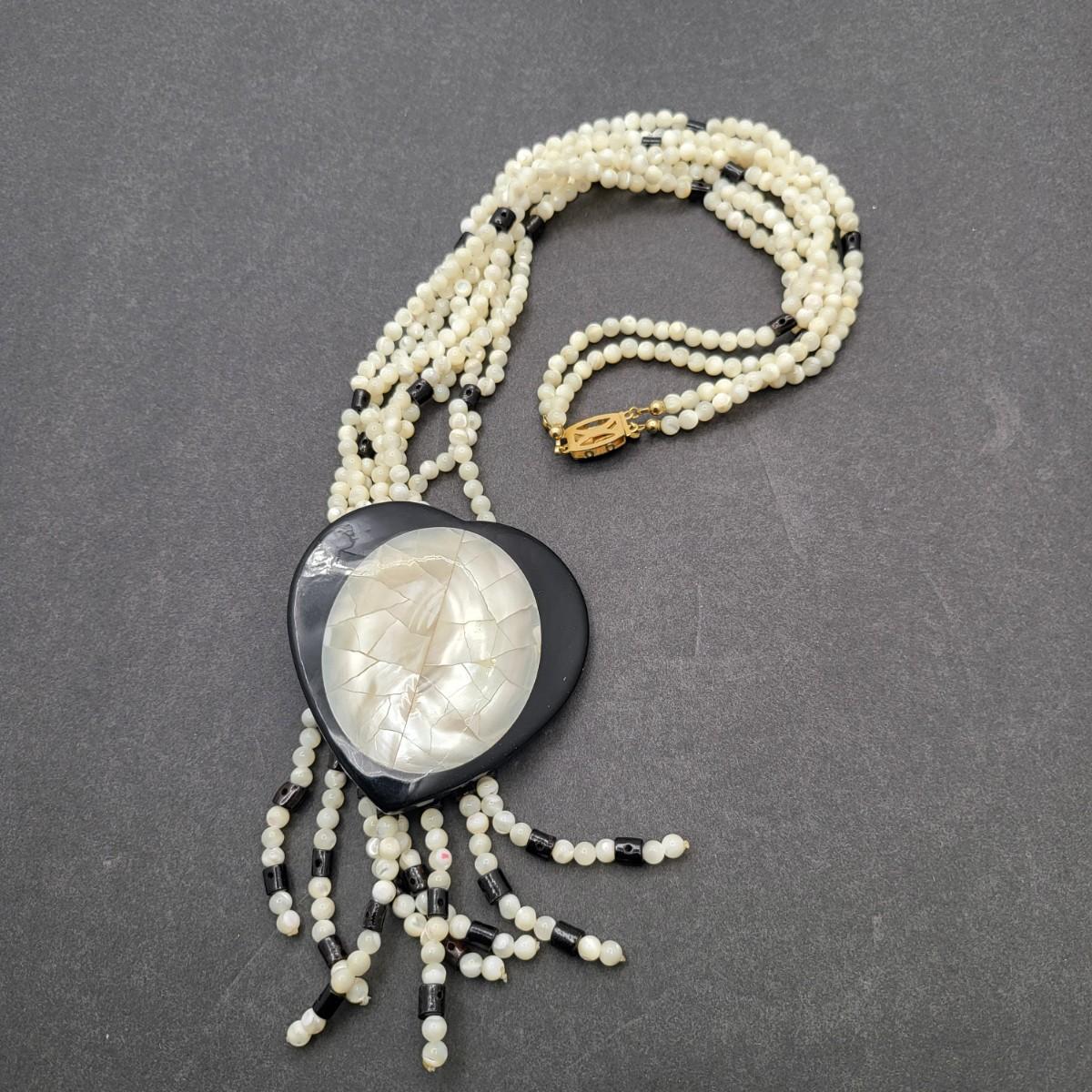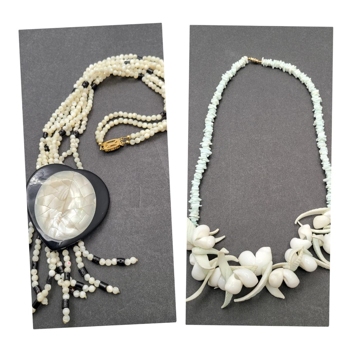 Large heart shape plastic pendant with MOP inlay and multi strand small beads & tassel necklace. Has decorative gold push clasp and measures 23" long to the pendant (2.75" x 2.5"), additional 3" tassel length. Hawain style, pale blue Puka and shells necklace measuring 24".