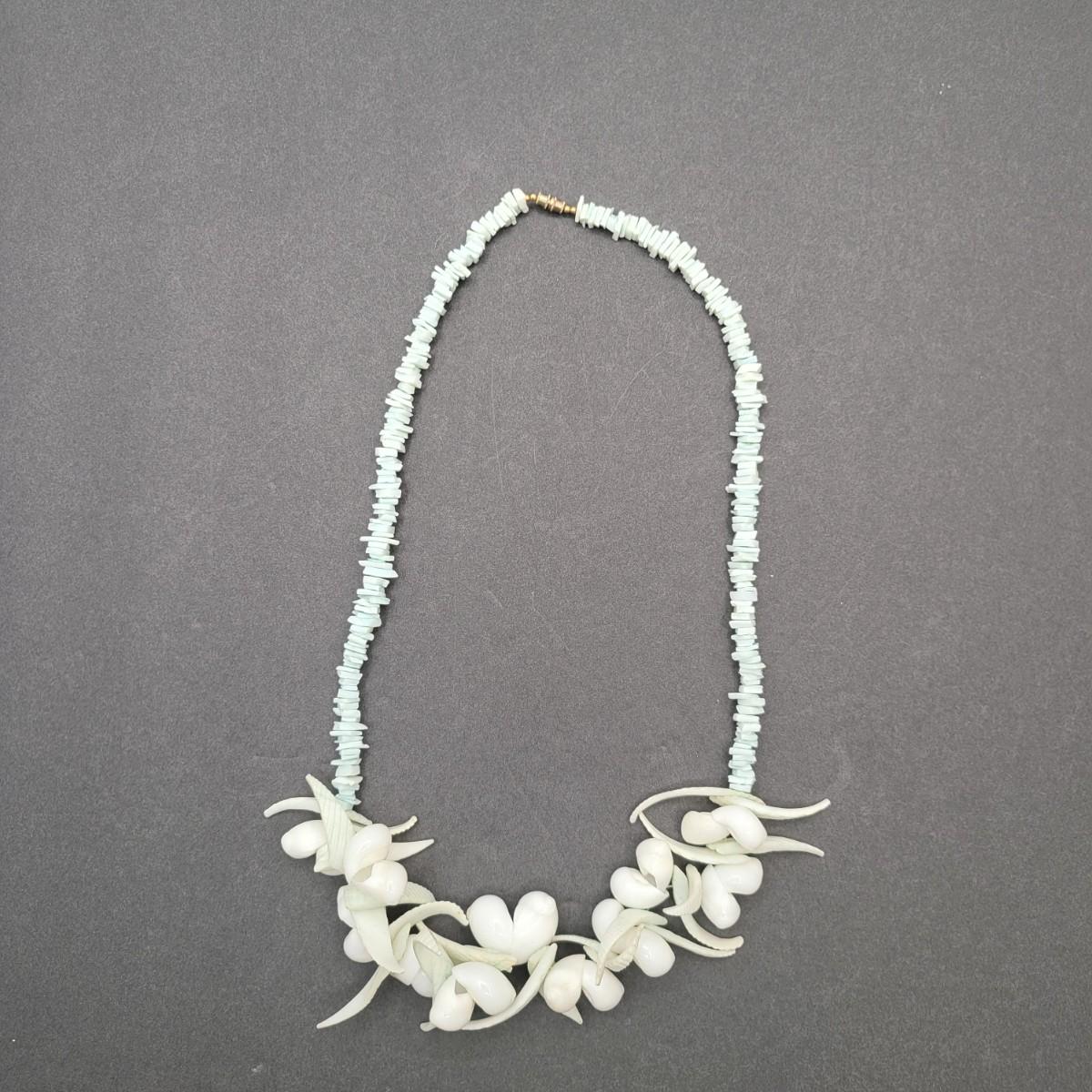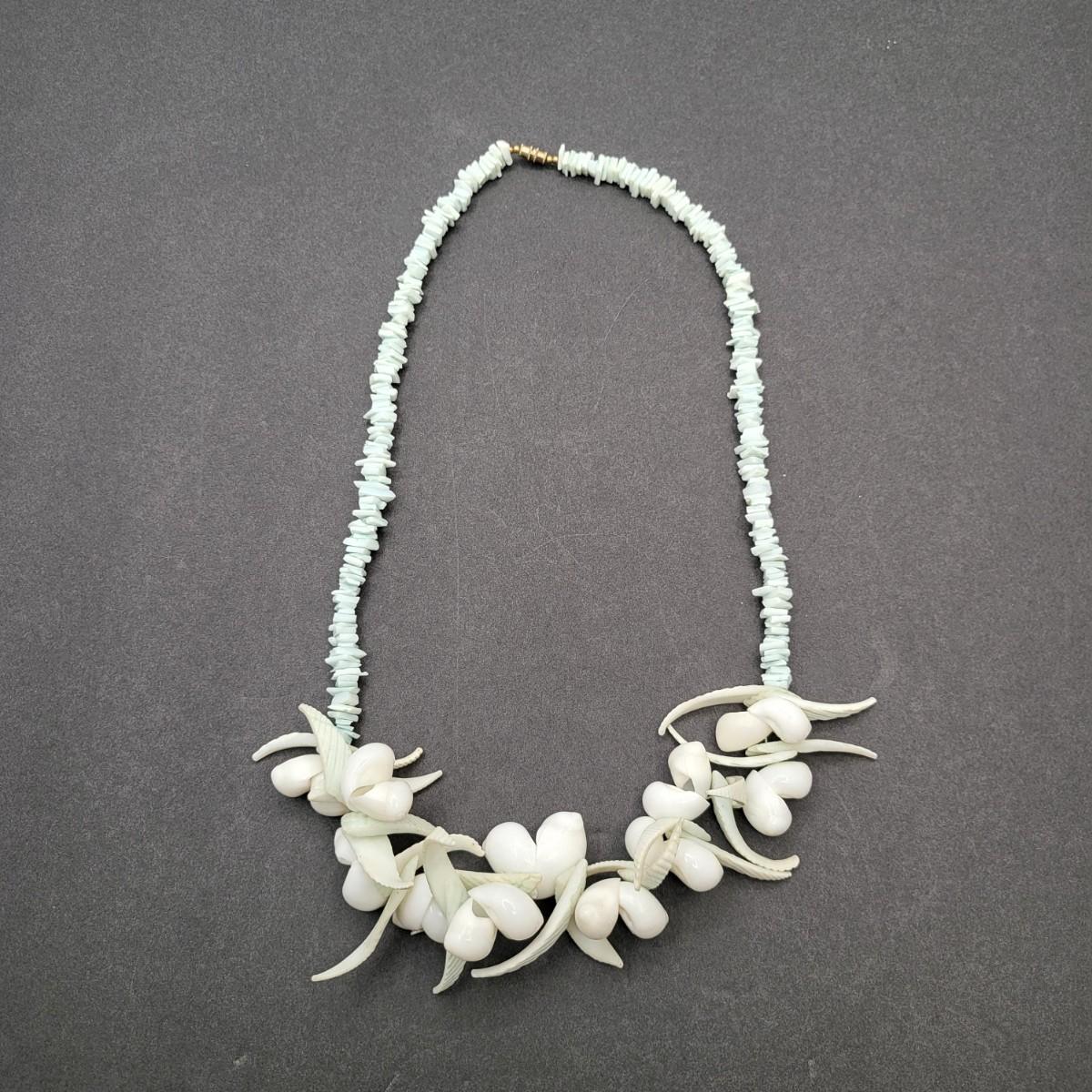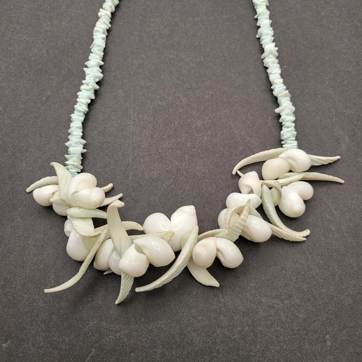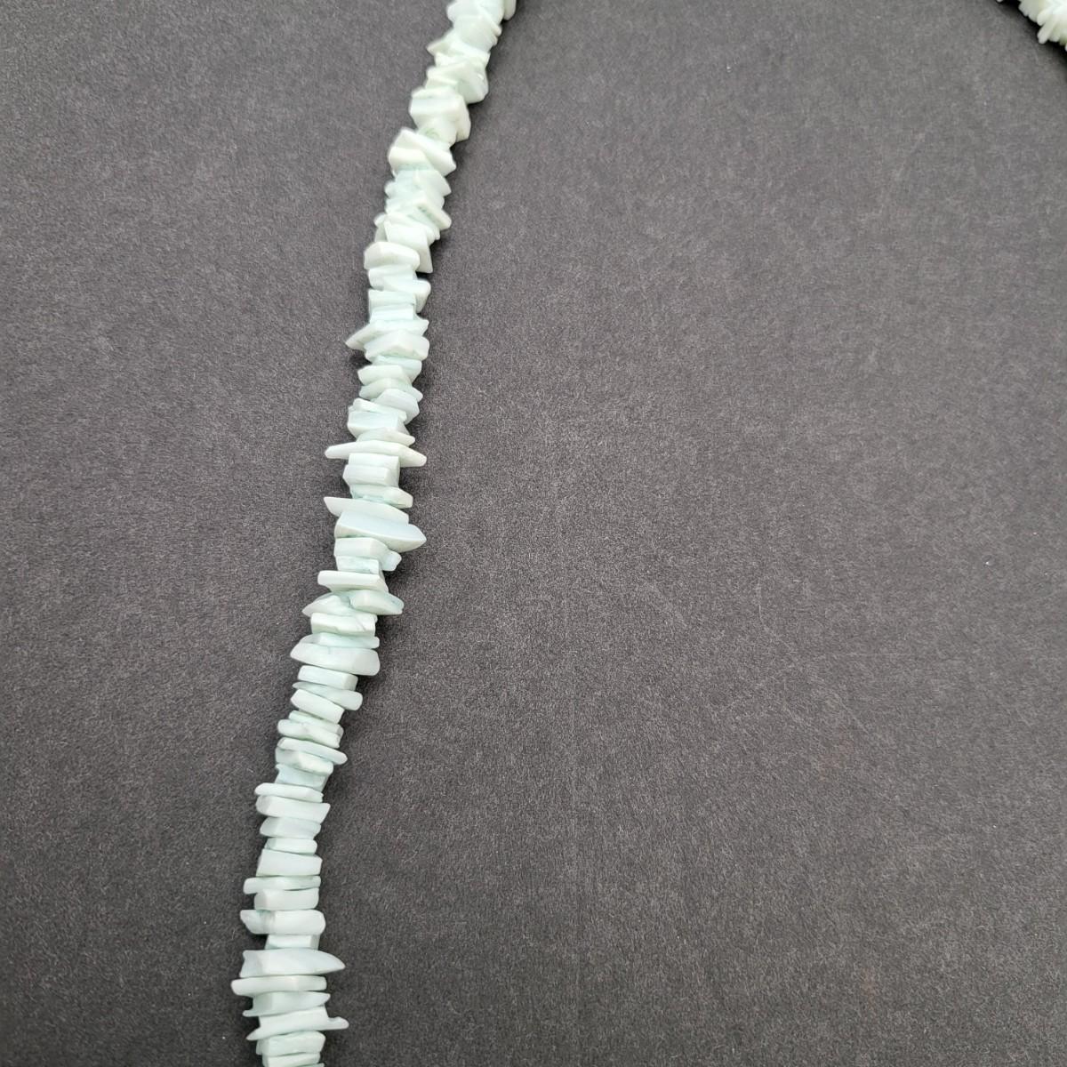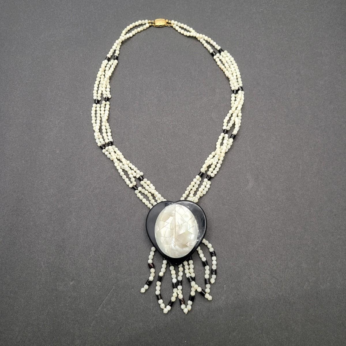 Large heart shape plastic pendant with MOP inlay and multi strand small beads & tassel necklace. Has decorative gold push clasp and measures 23" long to the pendant (2.75" x 2.5"), additional 3" tassel length. Hawain style, pale blue Puka and shells necklace measuring 24".