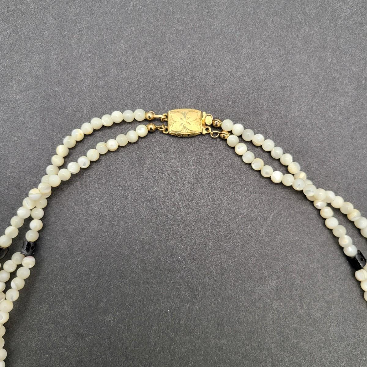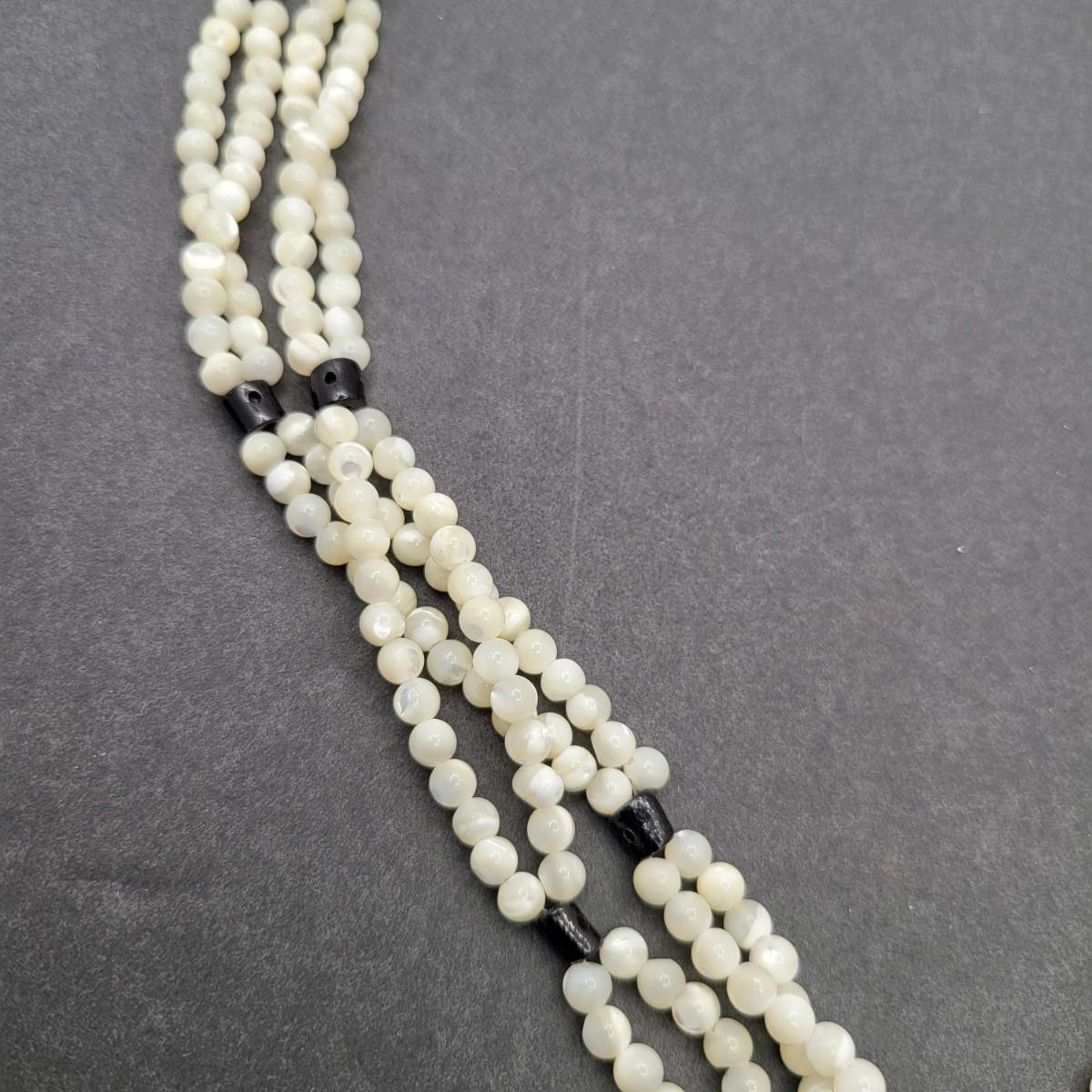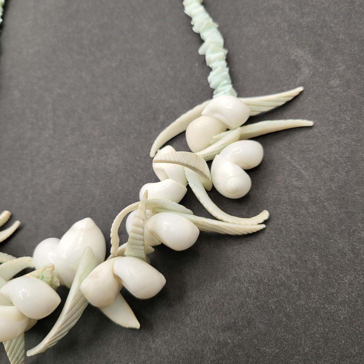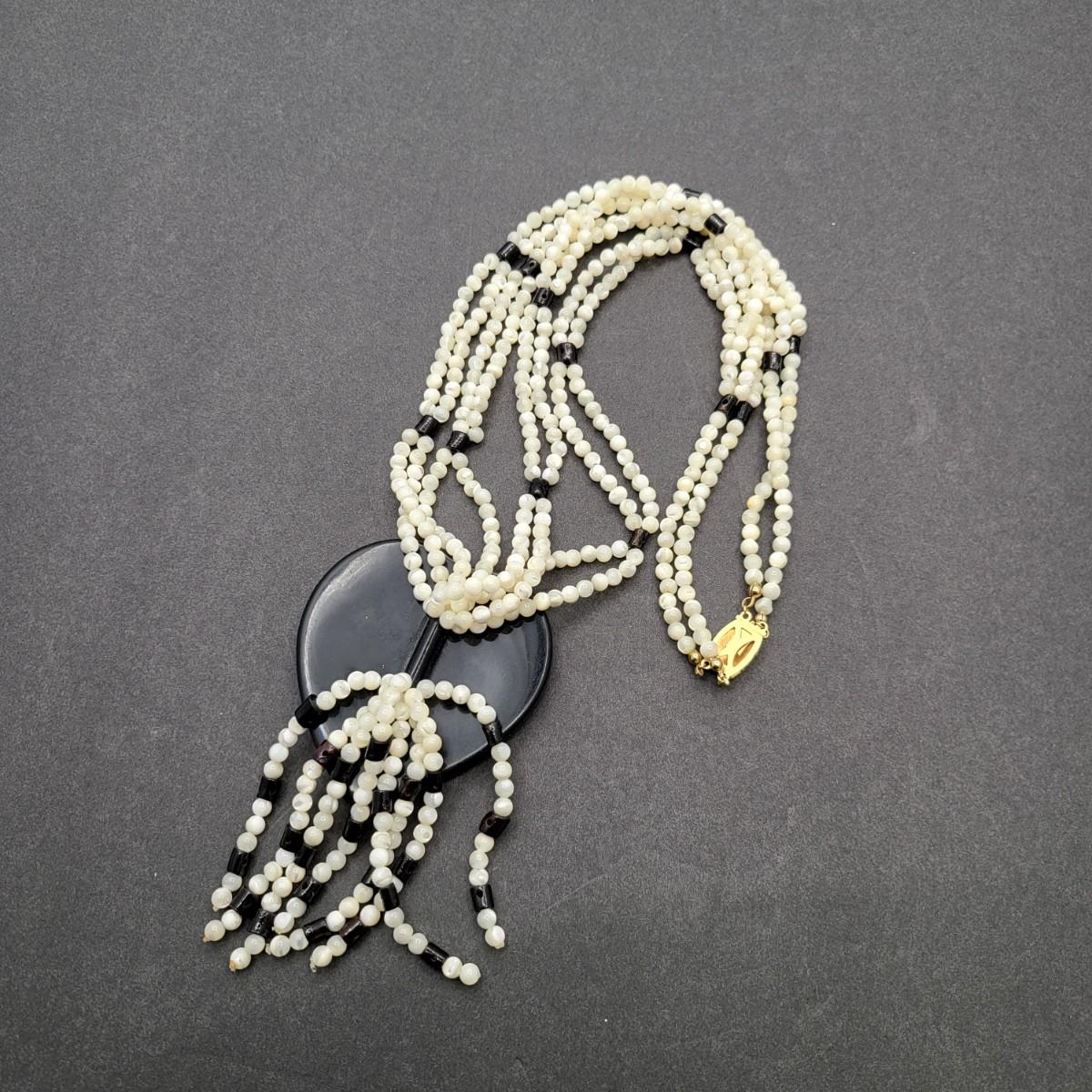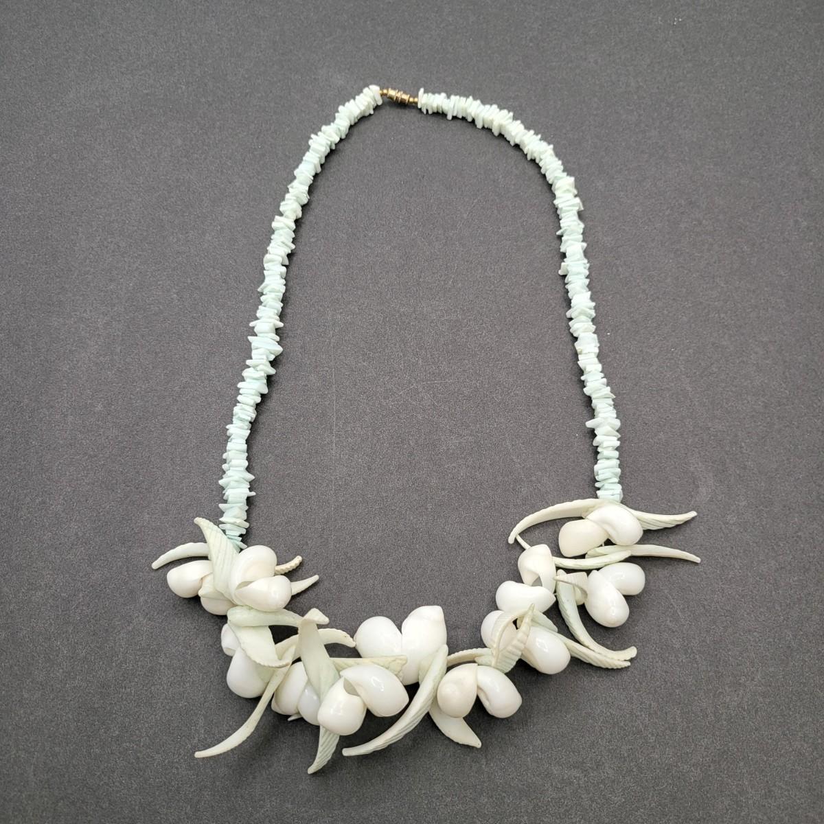 Large heart shape plastic pendant with MOP inlay and multi strand small beads & tassel necklace. Has decorative gold push clasp and measures 23" long to the pendant (2.75" x 2.5"), additional 3" tassel length. Hawain style, pale blue Puka and shells necklace measuring 24".