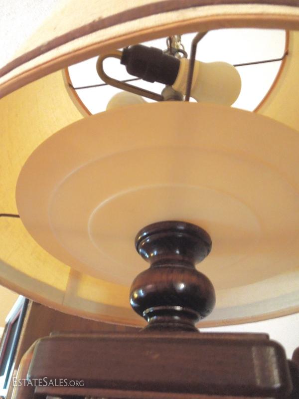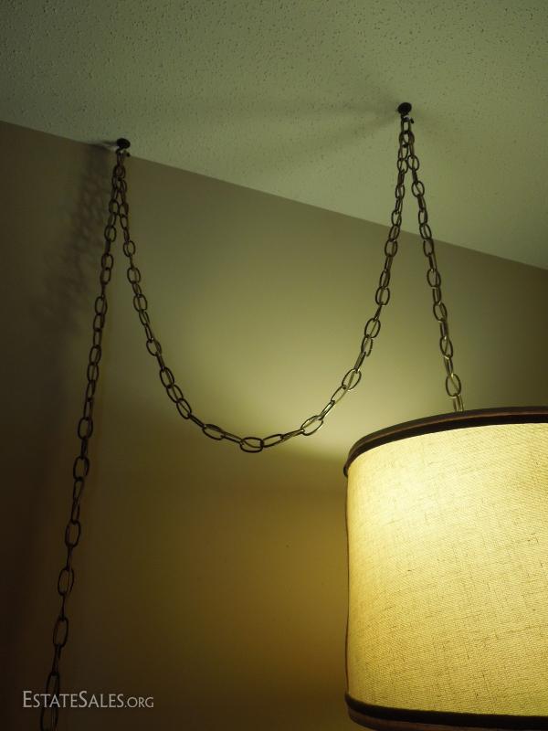 Replica ship pulley. Cord runs through chain. Shade is beginning to separate. Shade matches all other lamps. It is a heavy rough cotton blend. Works nicely.