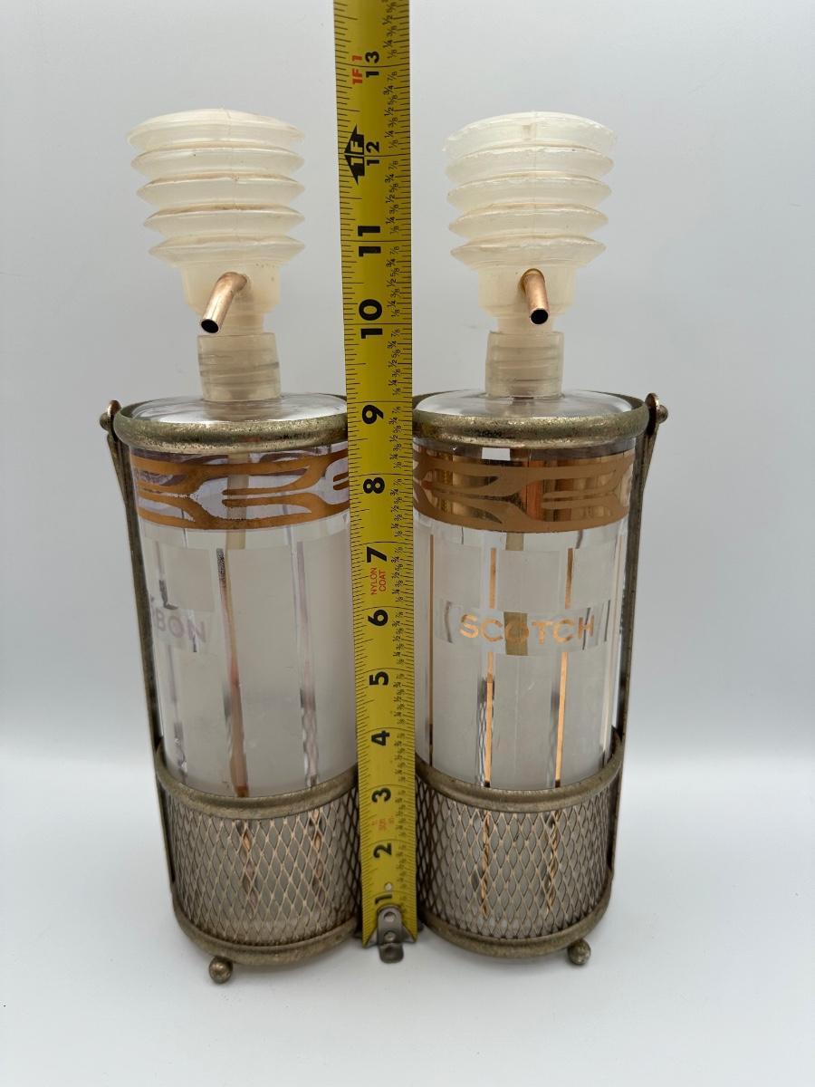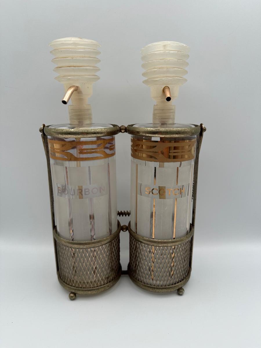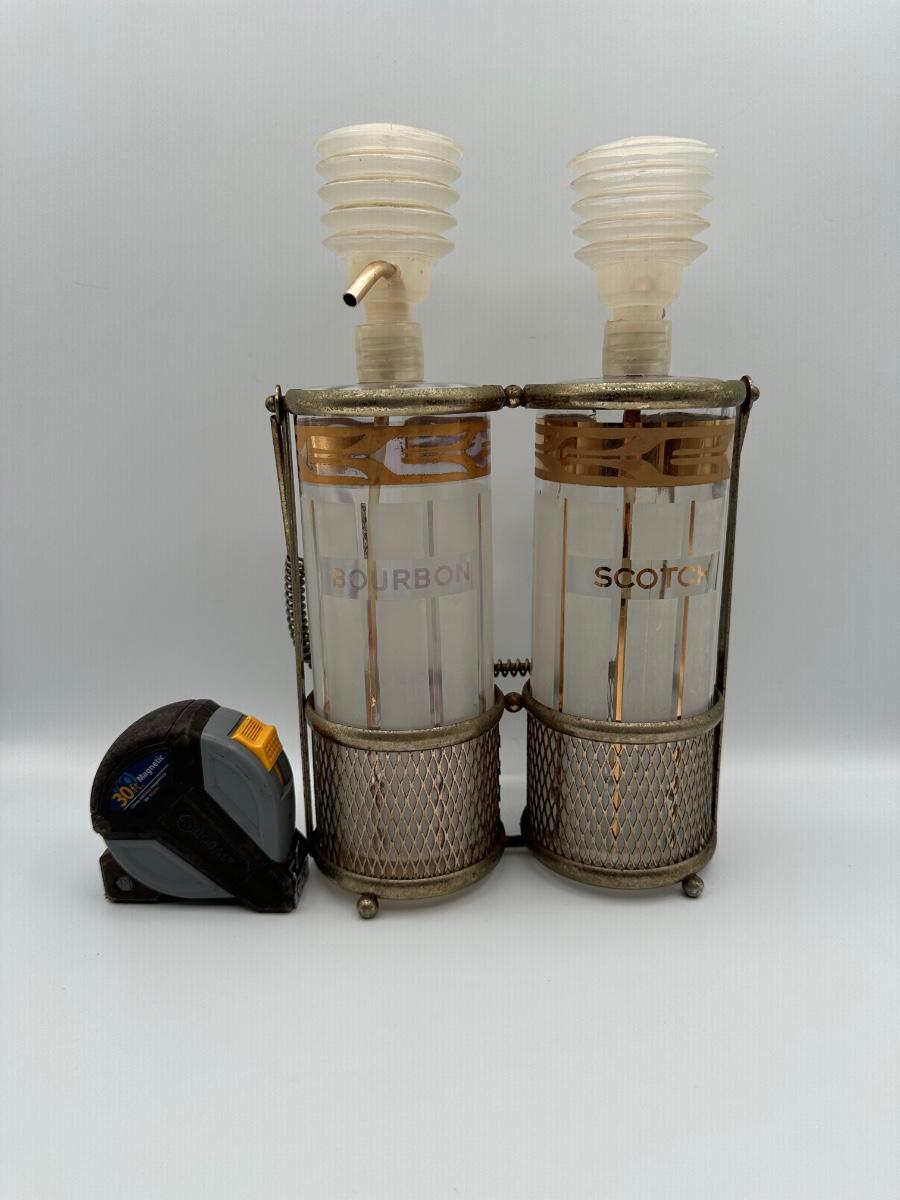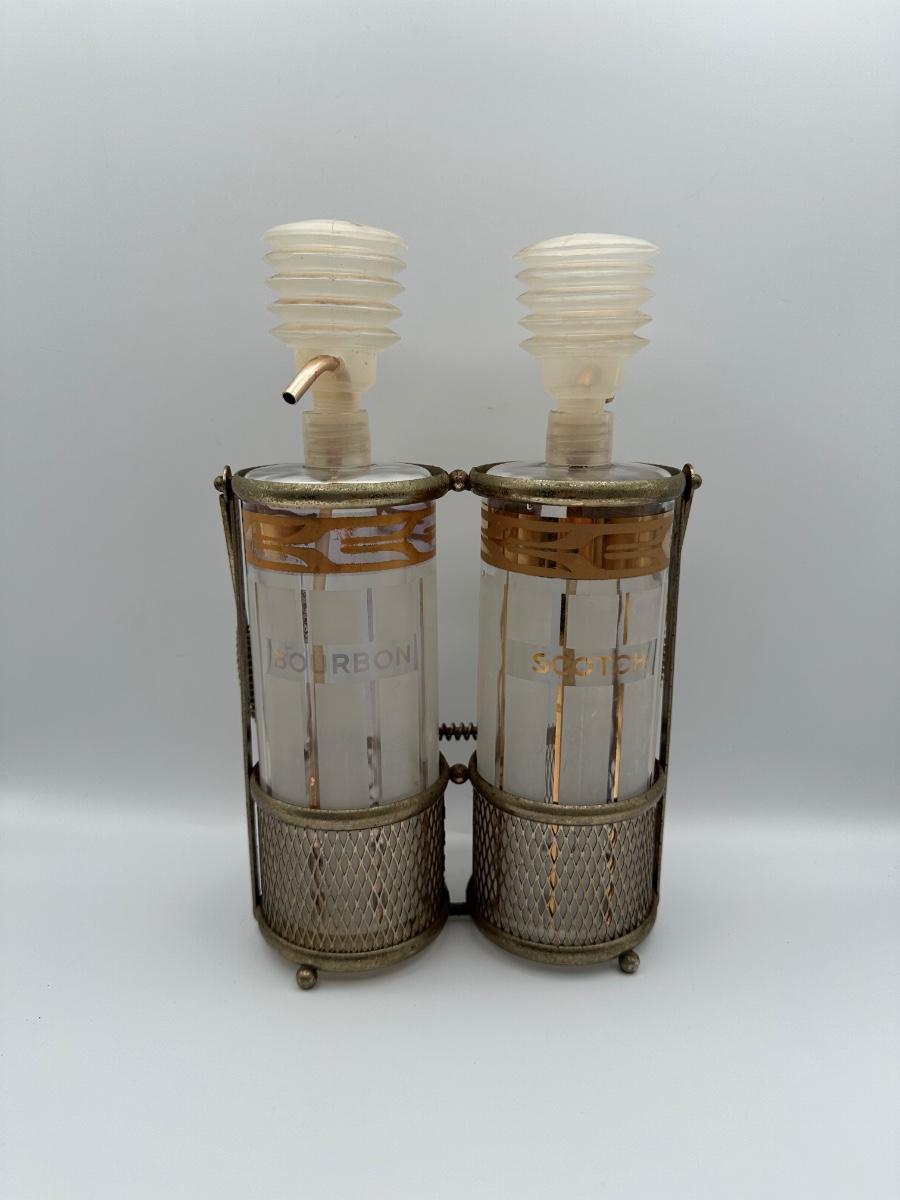 Vintage Pump Dispensing Glass Fred Press Scotch Bourbon Decanters Metal Carrier