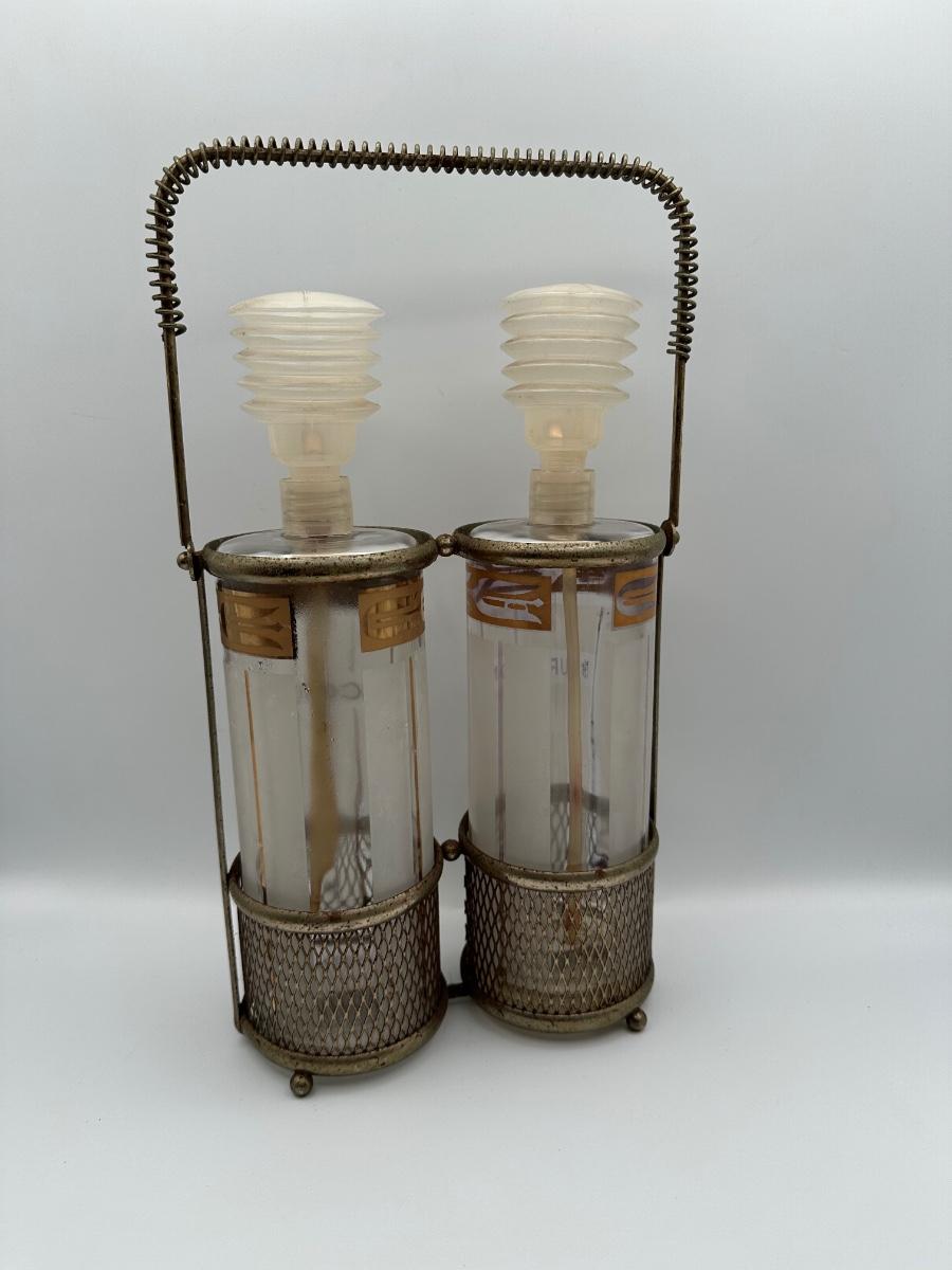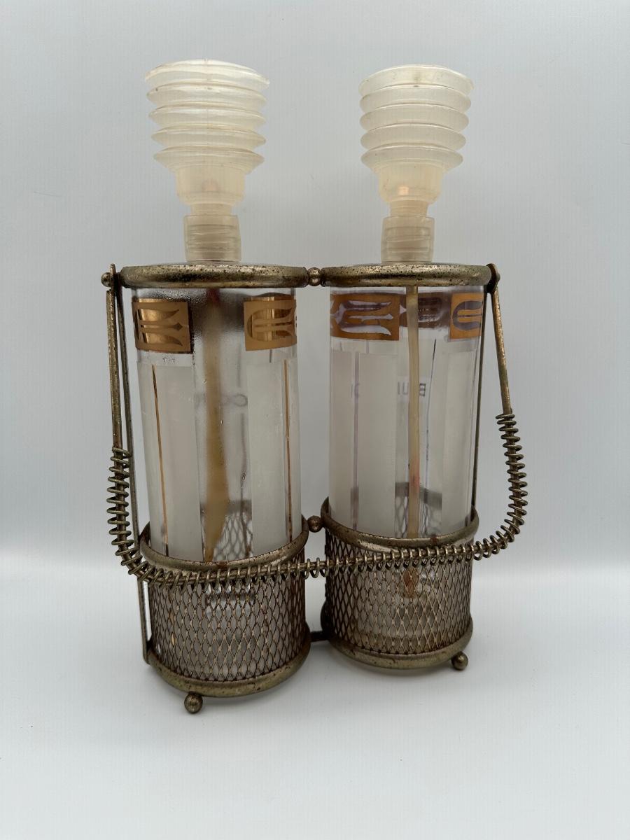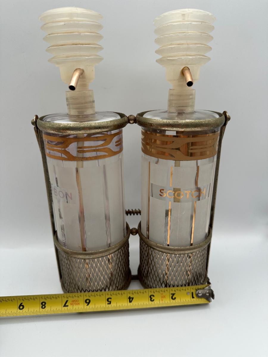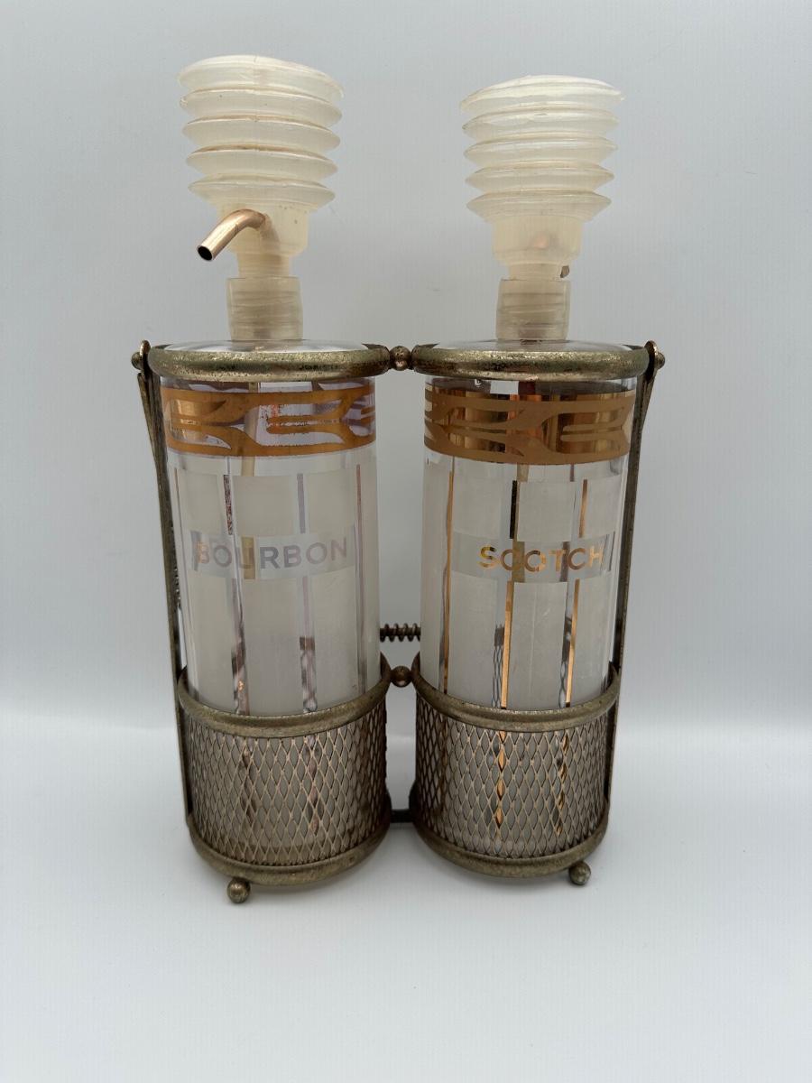 Vintage Pump Dispensing Glass Fred Press Scotch Bourbon Decanters Metal Carrier