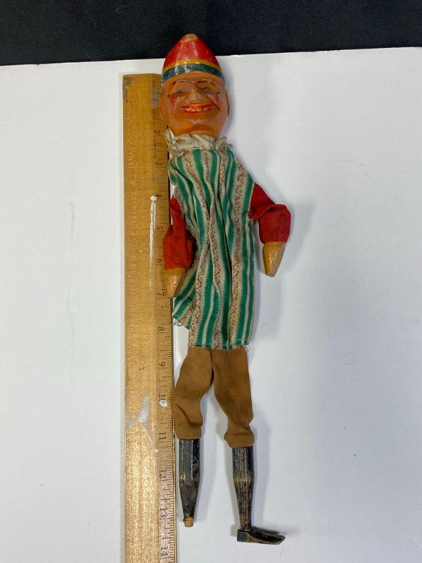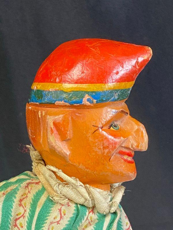 Vintage Punch & Judy style hand puppet. Glove style puppet has wood head, hands, and legs. He is missing a foot. Has signs of age and wear. Total length is about 13".