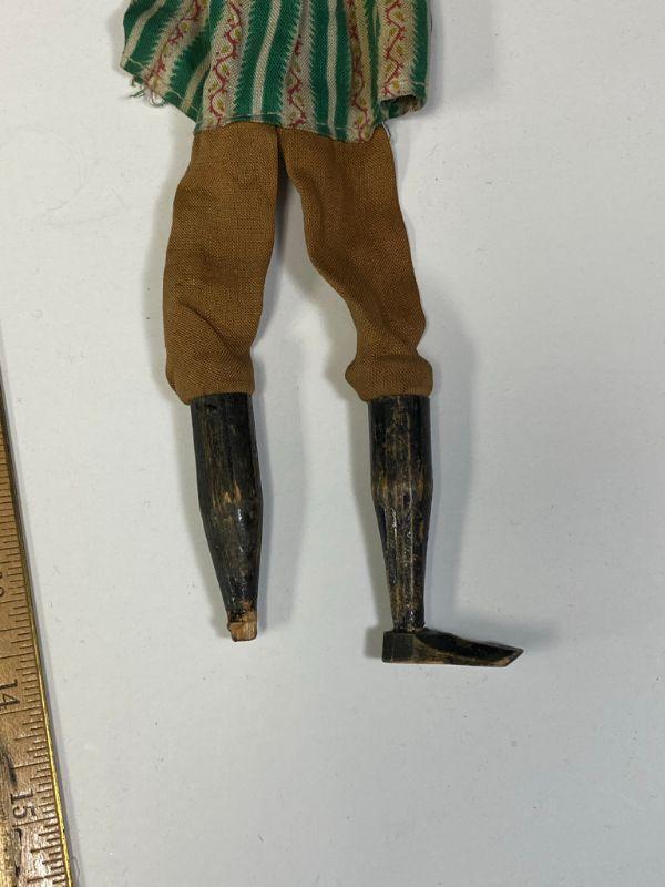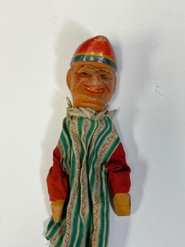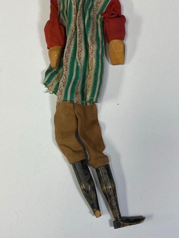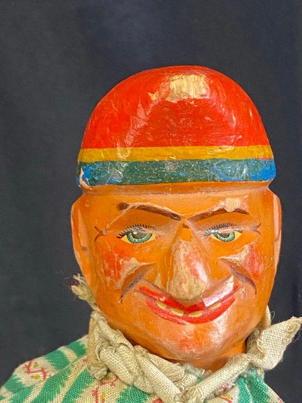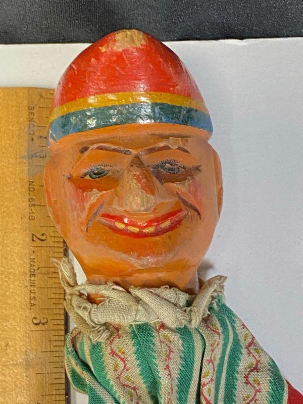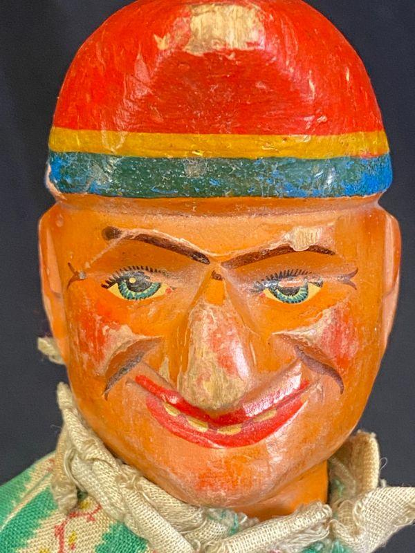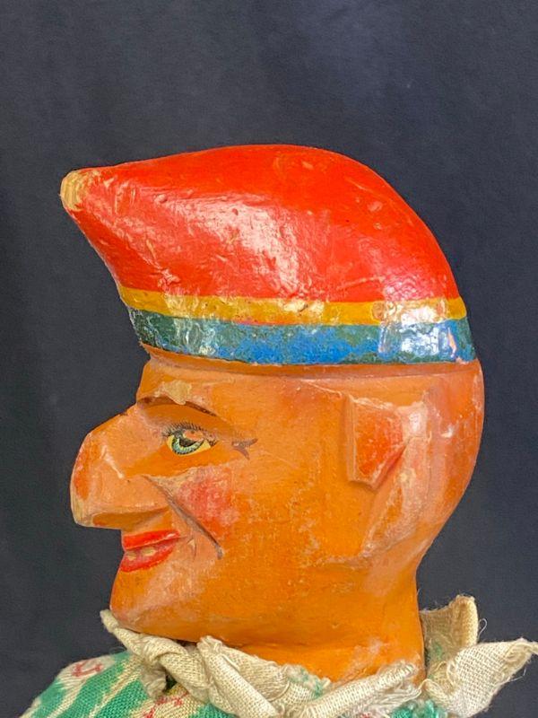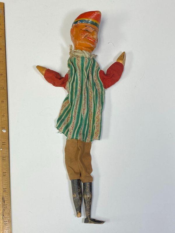 Vintage Punch & Judy style hand puppet. Glove style puppet has wood head, hands, and legs. He is missing a foot. Has signs of age and wear. Total length is about 13".