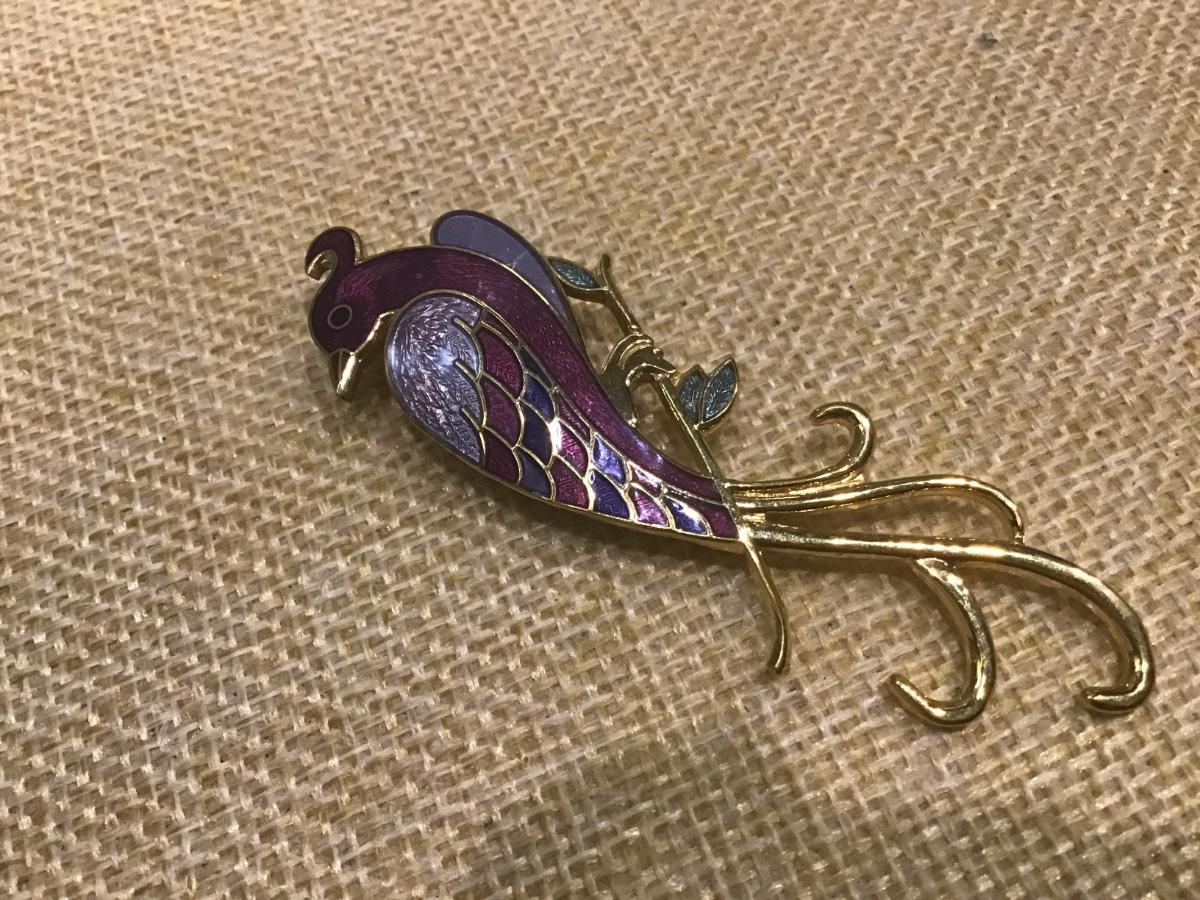 Vintage Purple Enamel Bird Brooch Pin Bird of Paradise Peacock Figural