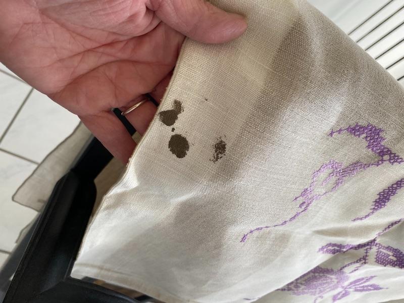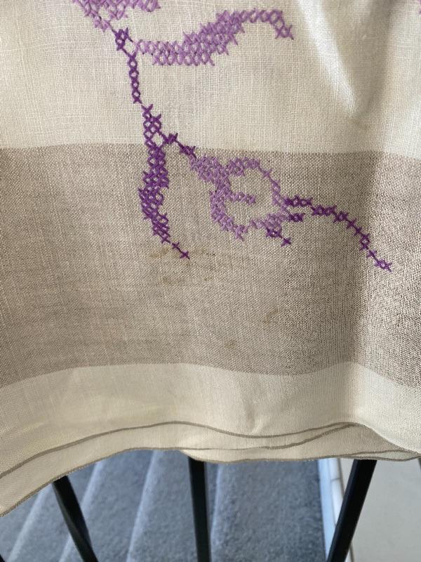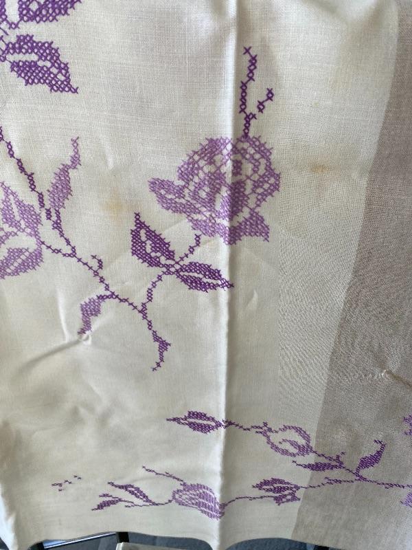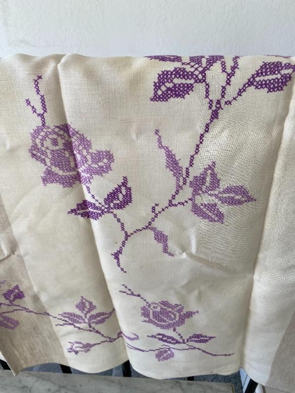 vintage purple cross stitched floral tablecloth. Measures about 5'x 6'. There is some light spots & stains, no holes.