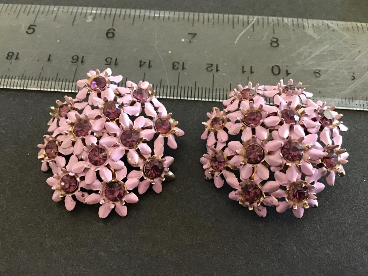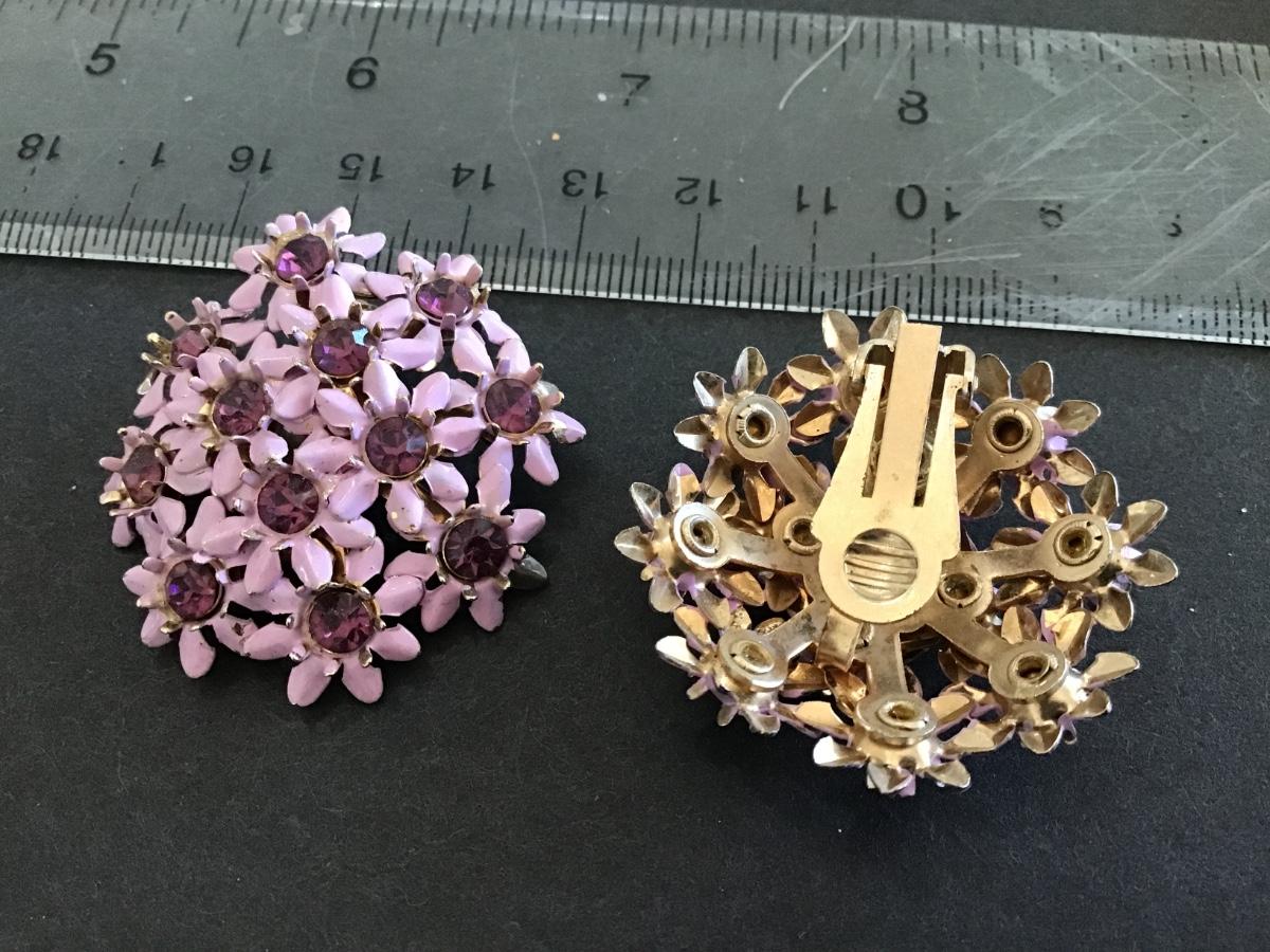 Vintage Purple Rhinestone Flower Clip on Earrings
