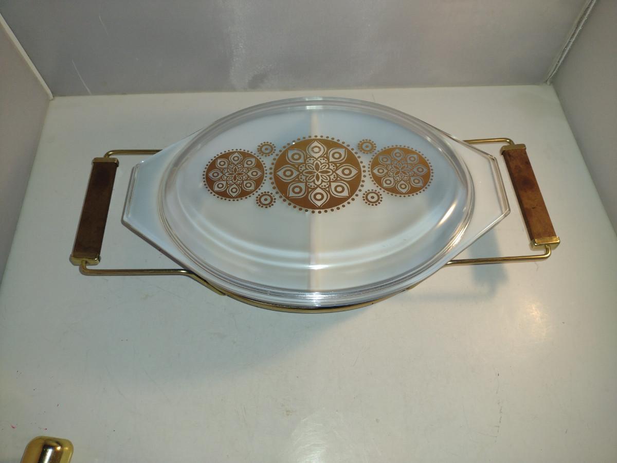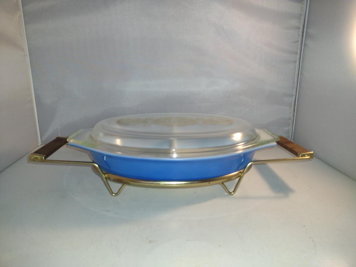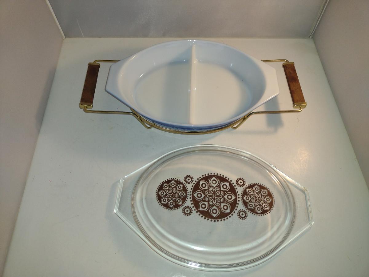 Vintage Pyrex 1 1/2 Quart Divided Vegetable Dish with Lid and Metal Stand