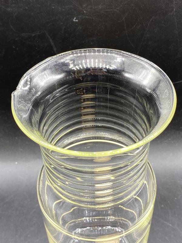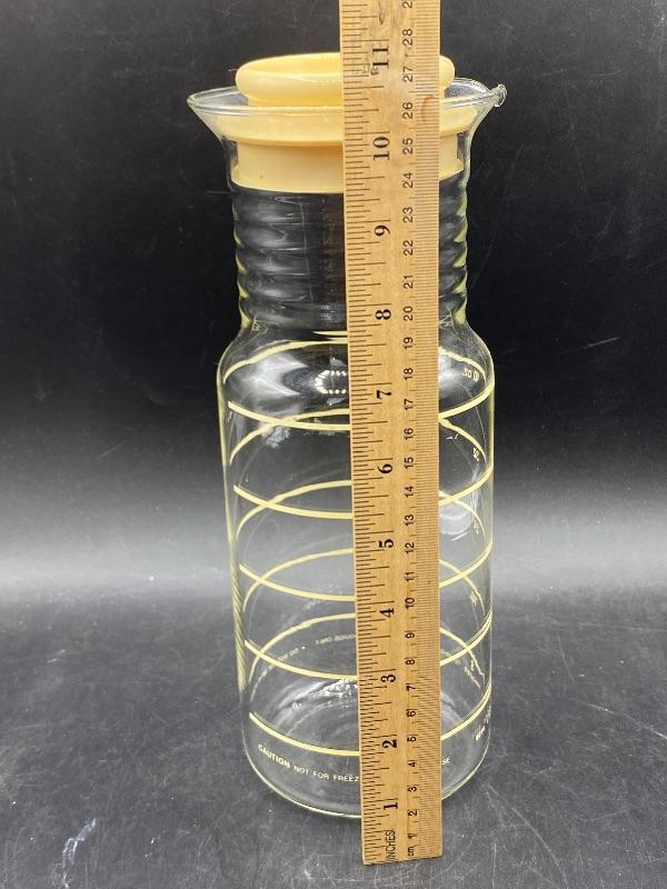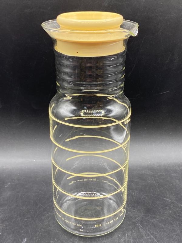 Vintage Pyrex juice pitcher. Clear with pale yellow/beige marked lines and lid. Holds 1.5qt. In excellent condition.