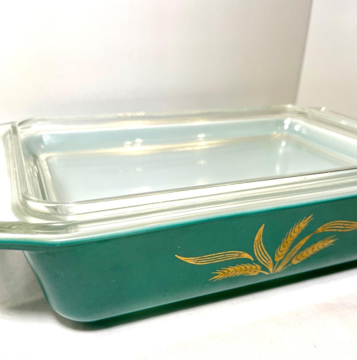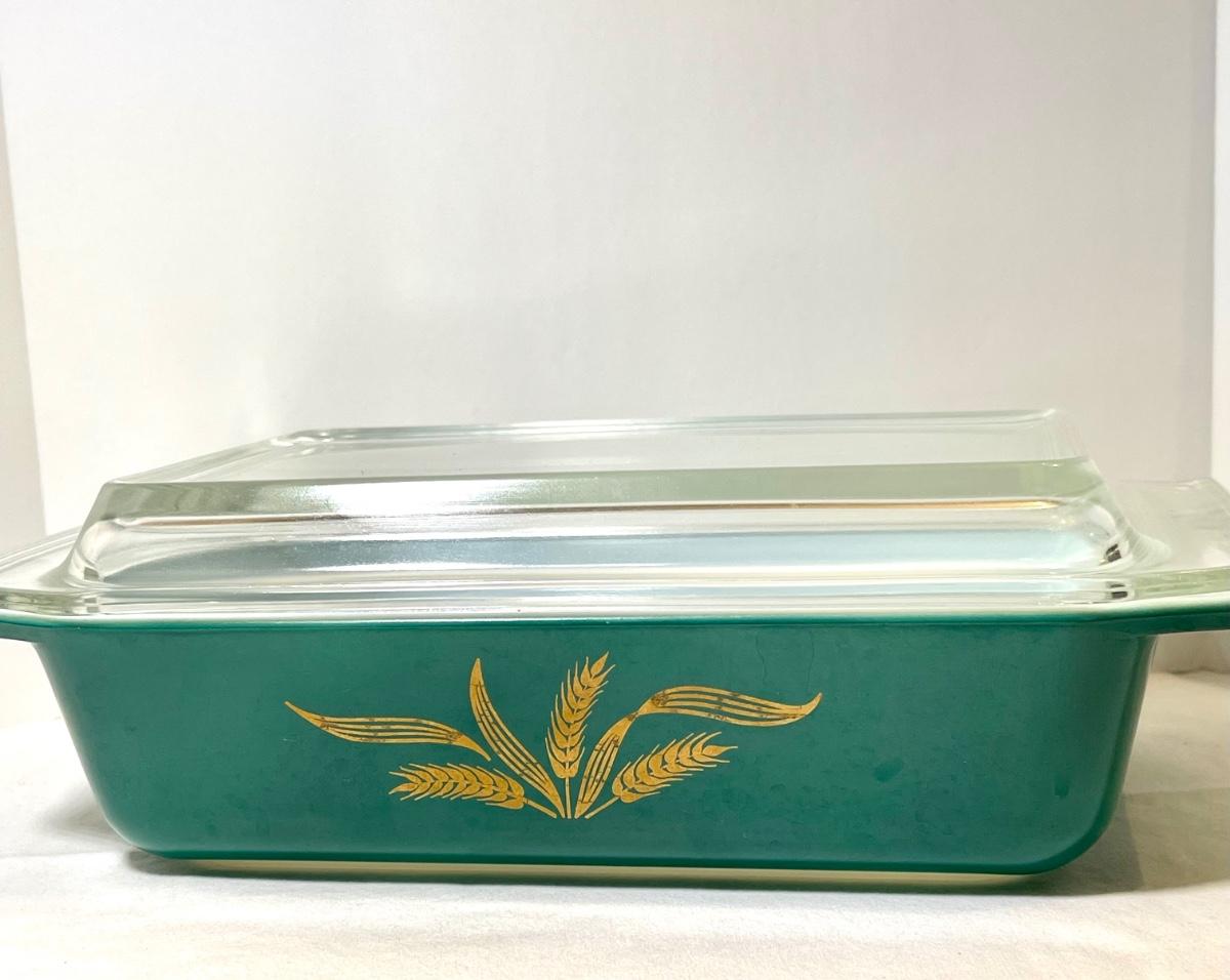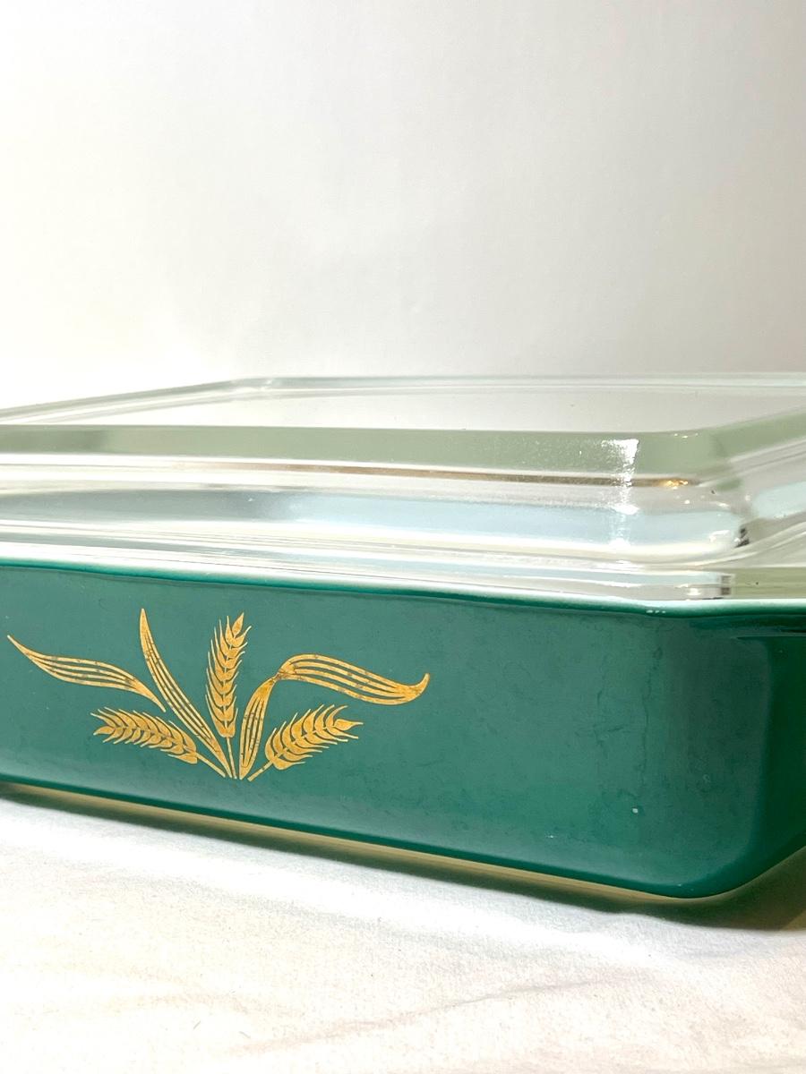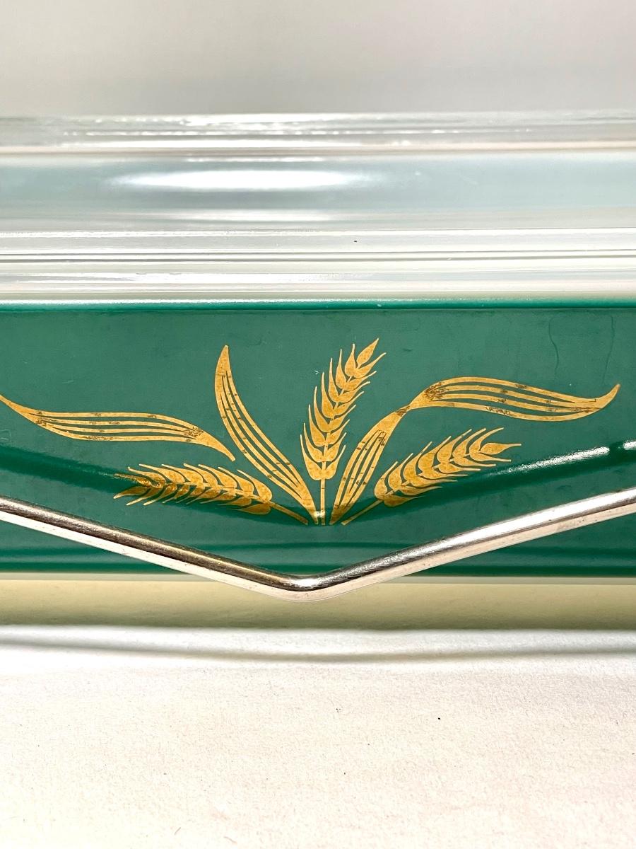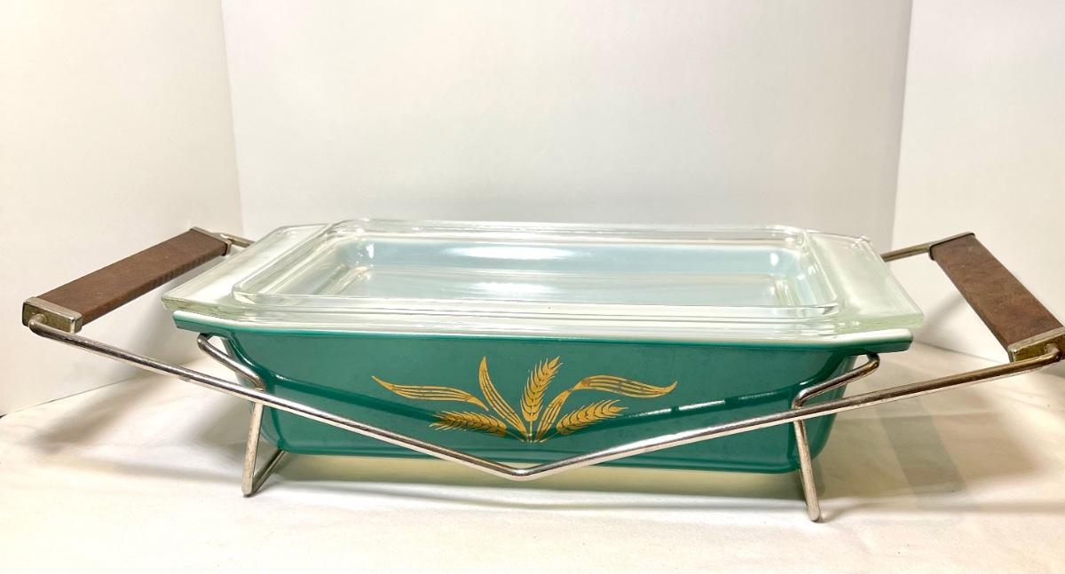 This is a hard to find promotional Pyrex in this green wheat pattern. You rarely find them with the lid and the stand. But here it is for you all to grab! Make sure you tell your vintage pyrex peeps about this piece!! There are slight signs of use and age on the wheat emblem and on metal stand. I believe the metal stand would clean up well. The green paint is in very good condition. Don’t let this one get away. The Pyrex collector in your life would love this! Remember, Christmas is just around the corner.