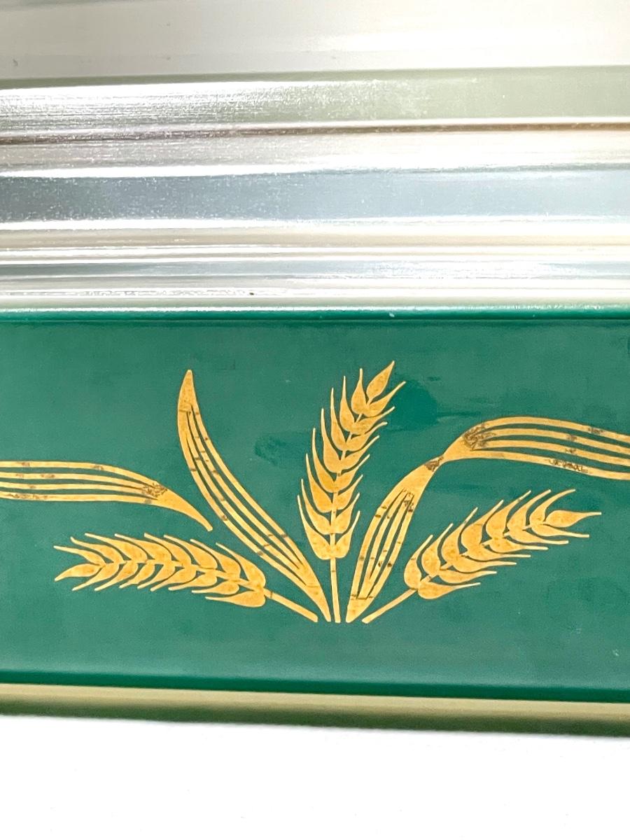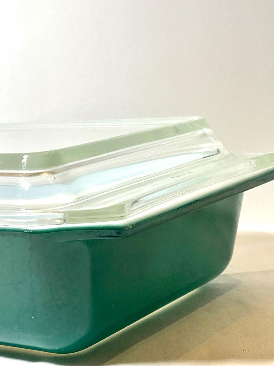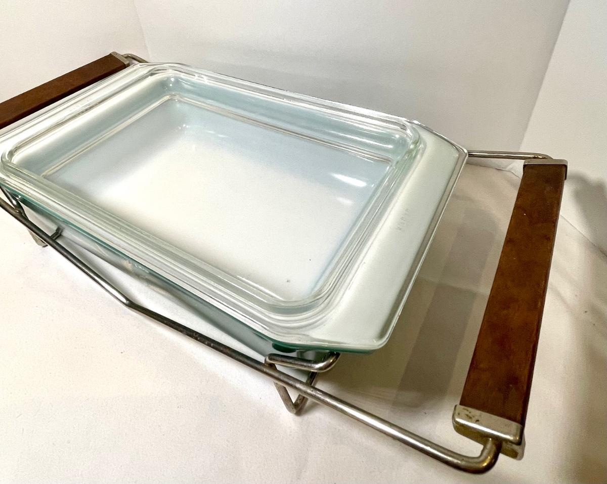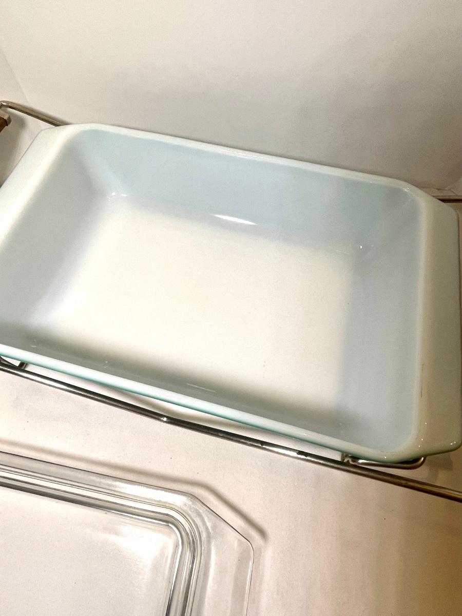 This is a hard to find promotional Pyrex in this green wheat pattern. You rarely find them with the lid and the stand. But here it is for you all to grab! Make sure you tell your vintage pyrex peeps about this piece!! There are slight signs of use and age on the wheat emblem and on metal stand. I believe the metal stand would clean up well. The green paint is in very good condition. Don’t let this one get away. The Pyrex collector in your life would love this! Remember, Christmas is just around the corner.