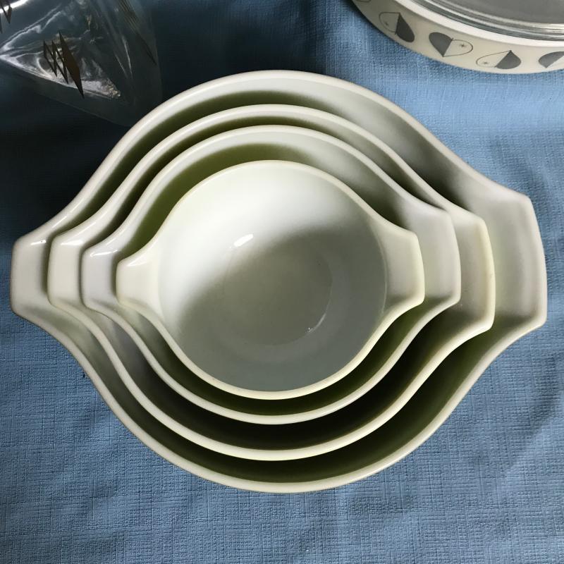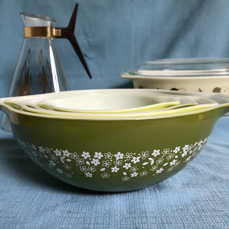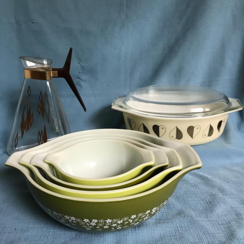 Lot includes four vintage stacking Pyrex bowls, vintage covered Pyrex dish, and vintage Inland Glass pitcher. No shipping available. Local pickup only in Hendersonville, NC.