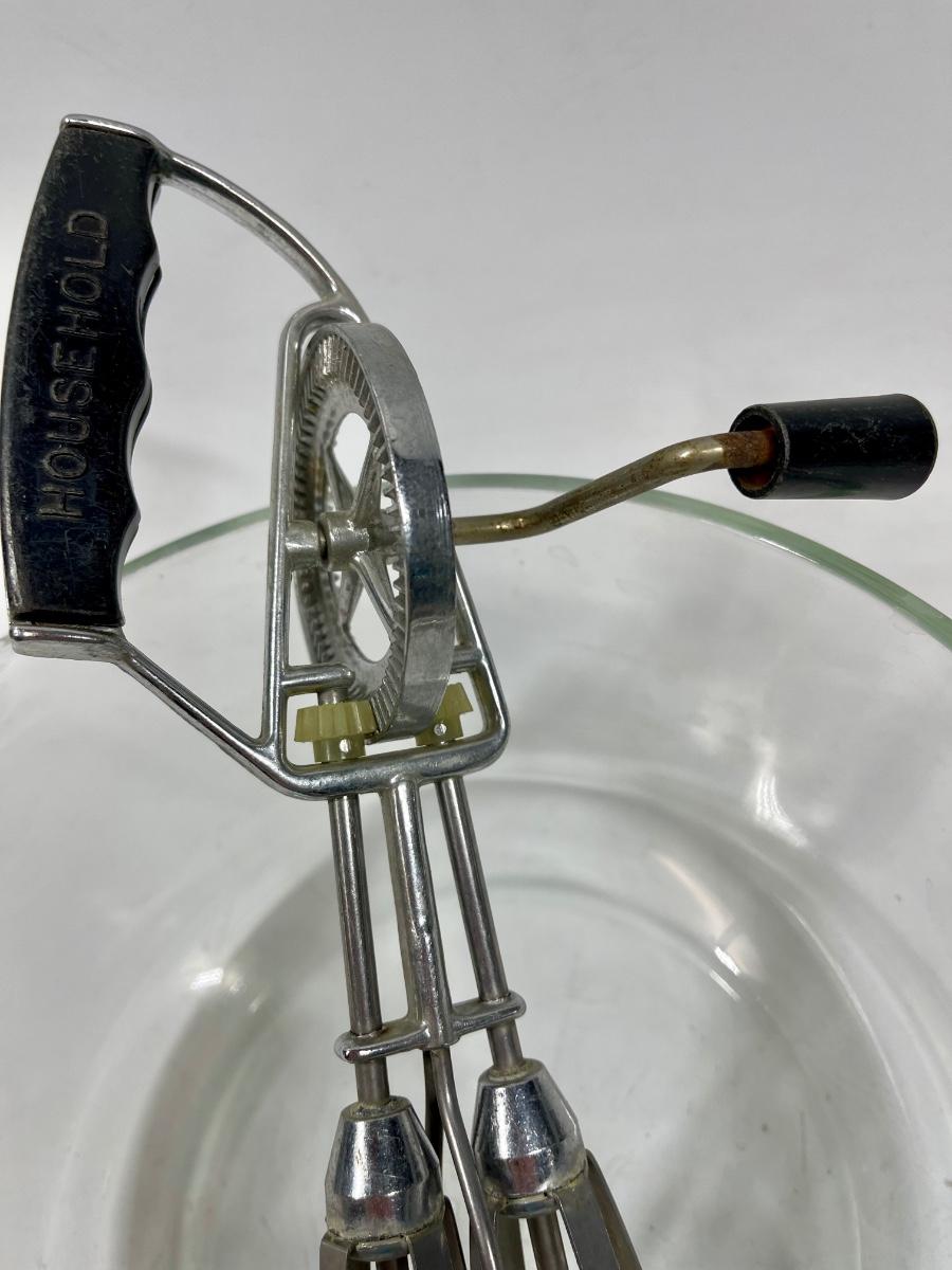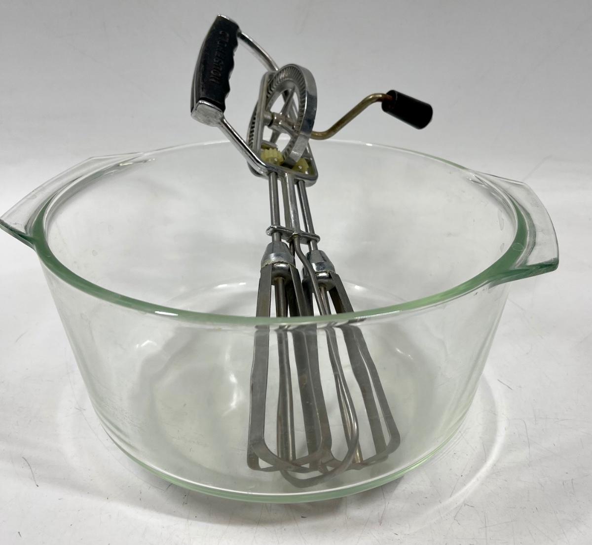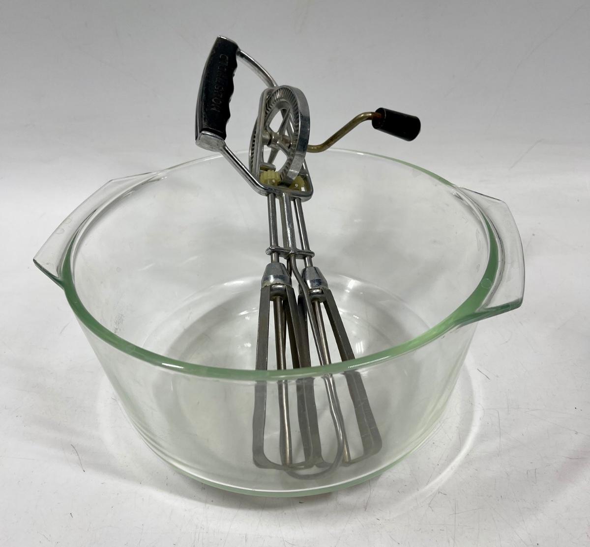 Vintage Pyrex bowl with handles and Vintage egg beater