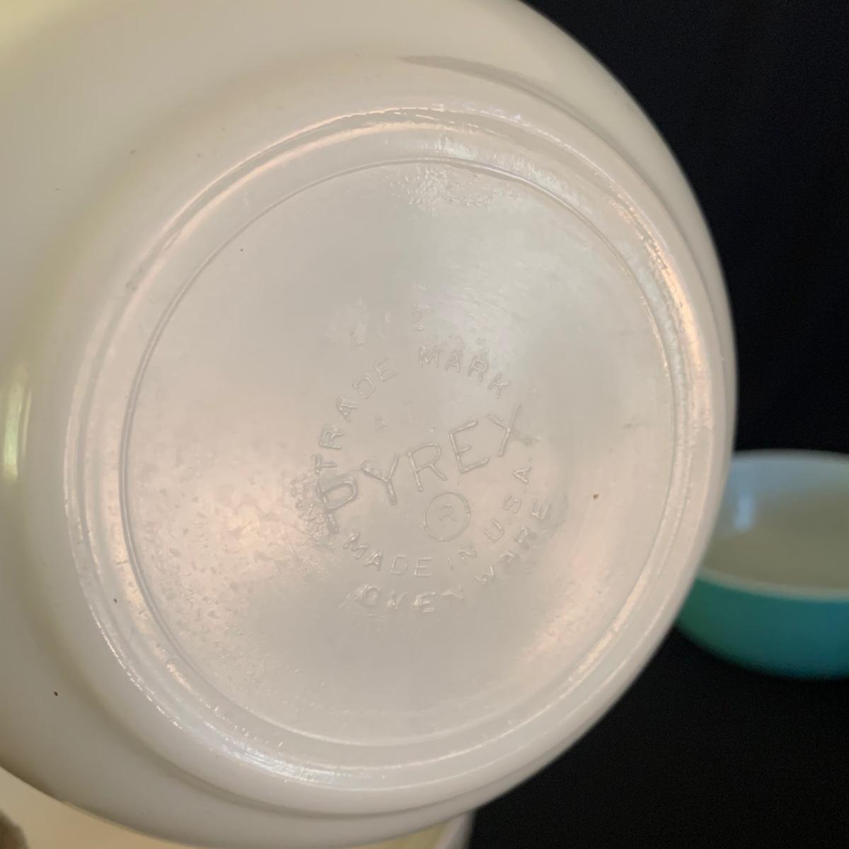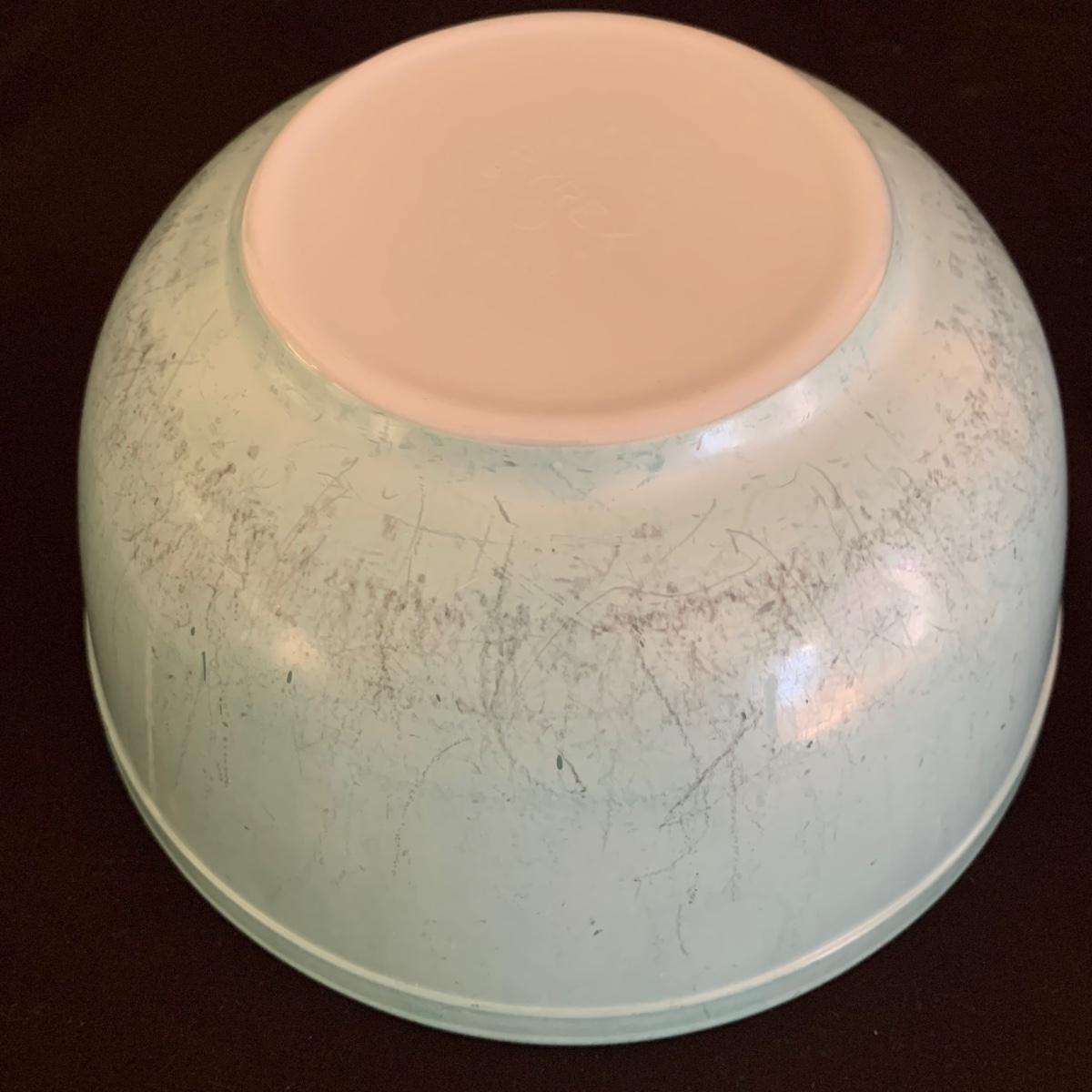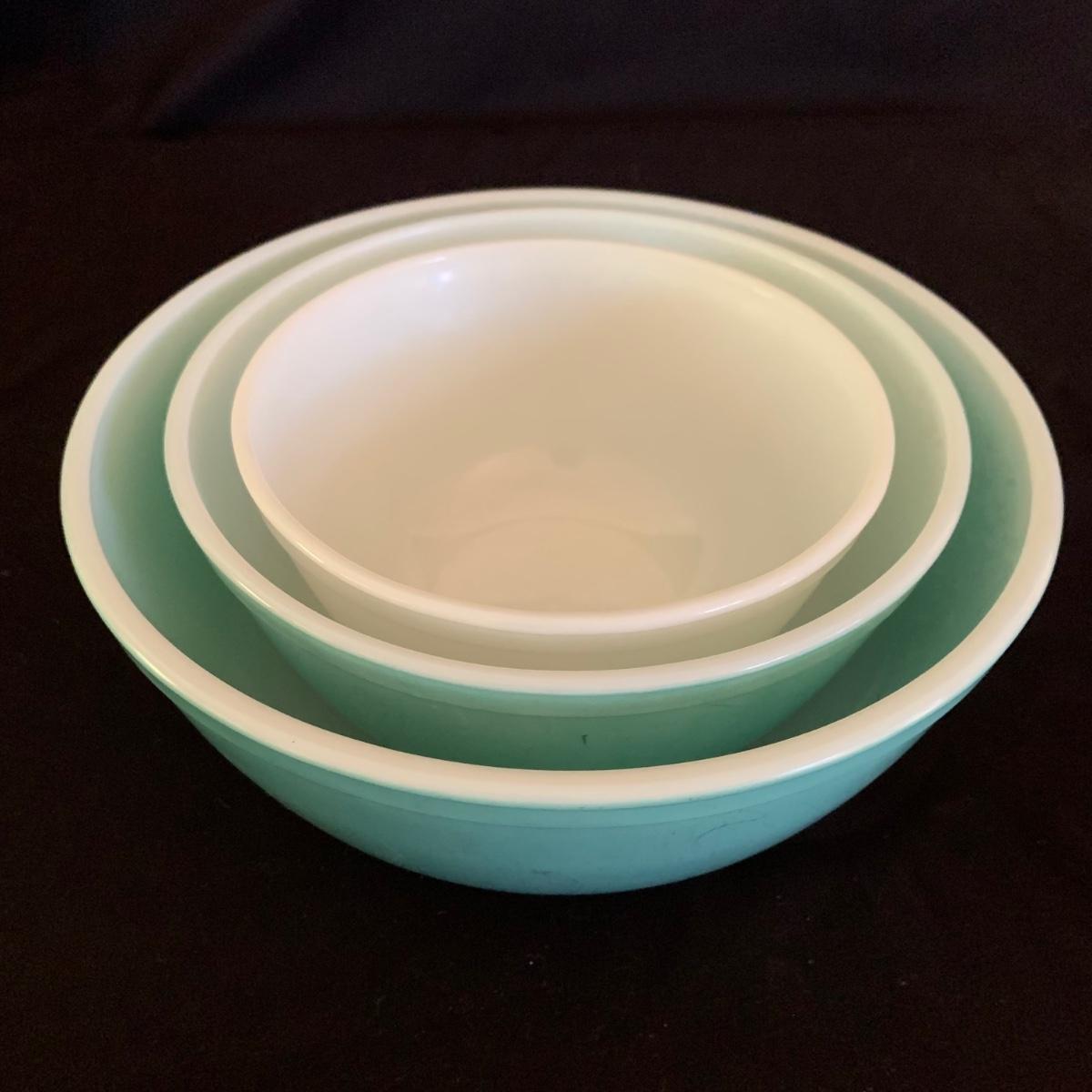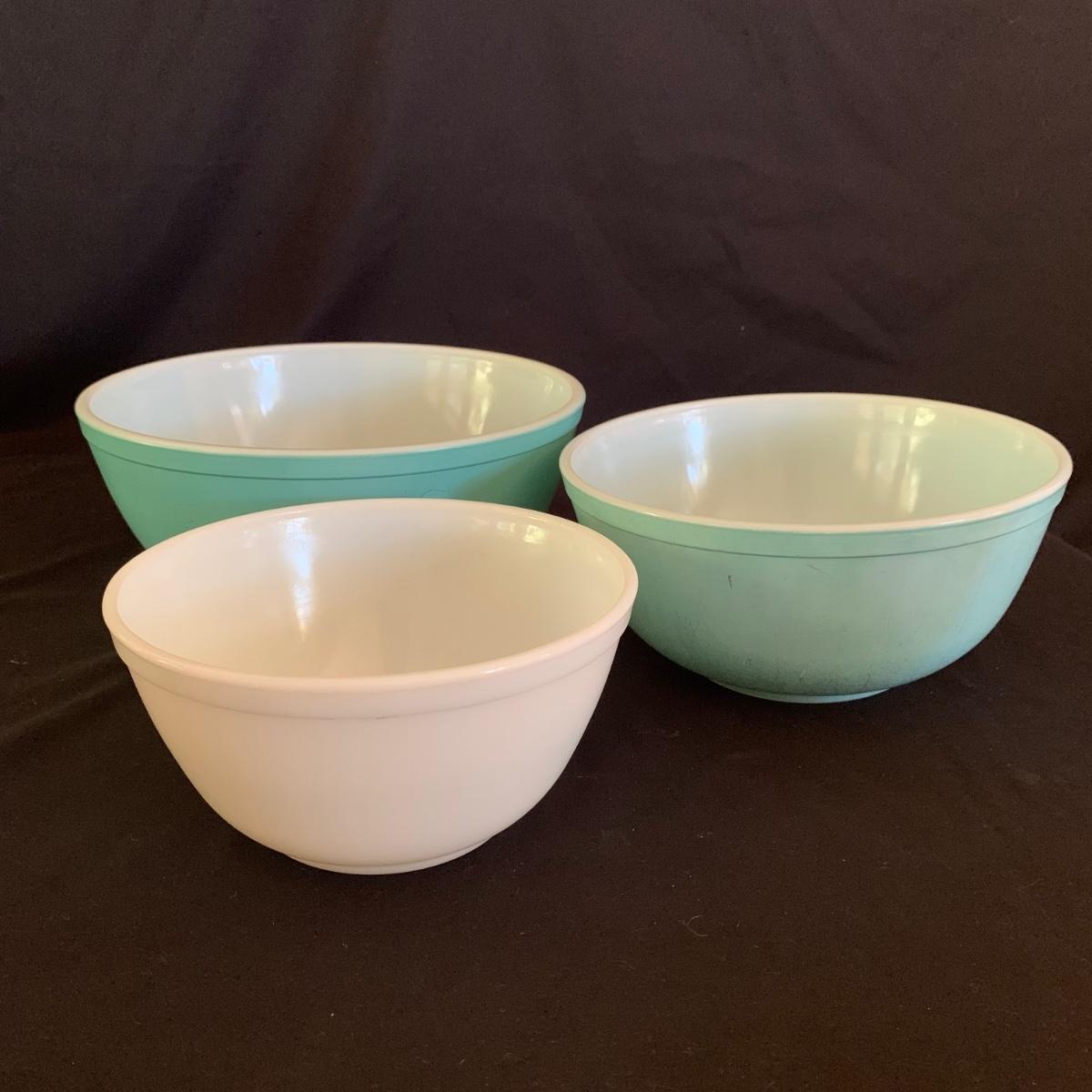 Three nesting Pyrex mixing bowls. The two bigger bowls are a robins egg blue color (one is brighter than the other) and the smallest is all white. There are some scratches on the surfaces of the bowls, but they are otherwise in good condition. The largest bowl is 10.5”d. The Corning Ware casserole dish is a 5 quart dish with a Pyrex lid. It has some stains from use, but is in good condition structurally and the design on the dish is still totally intact.