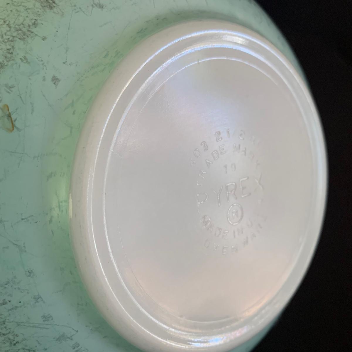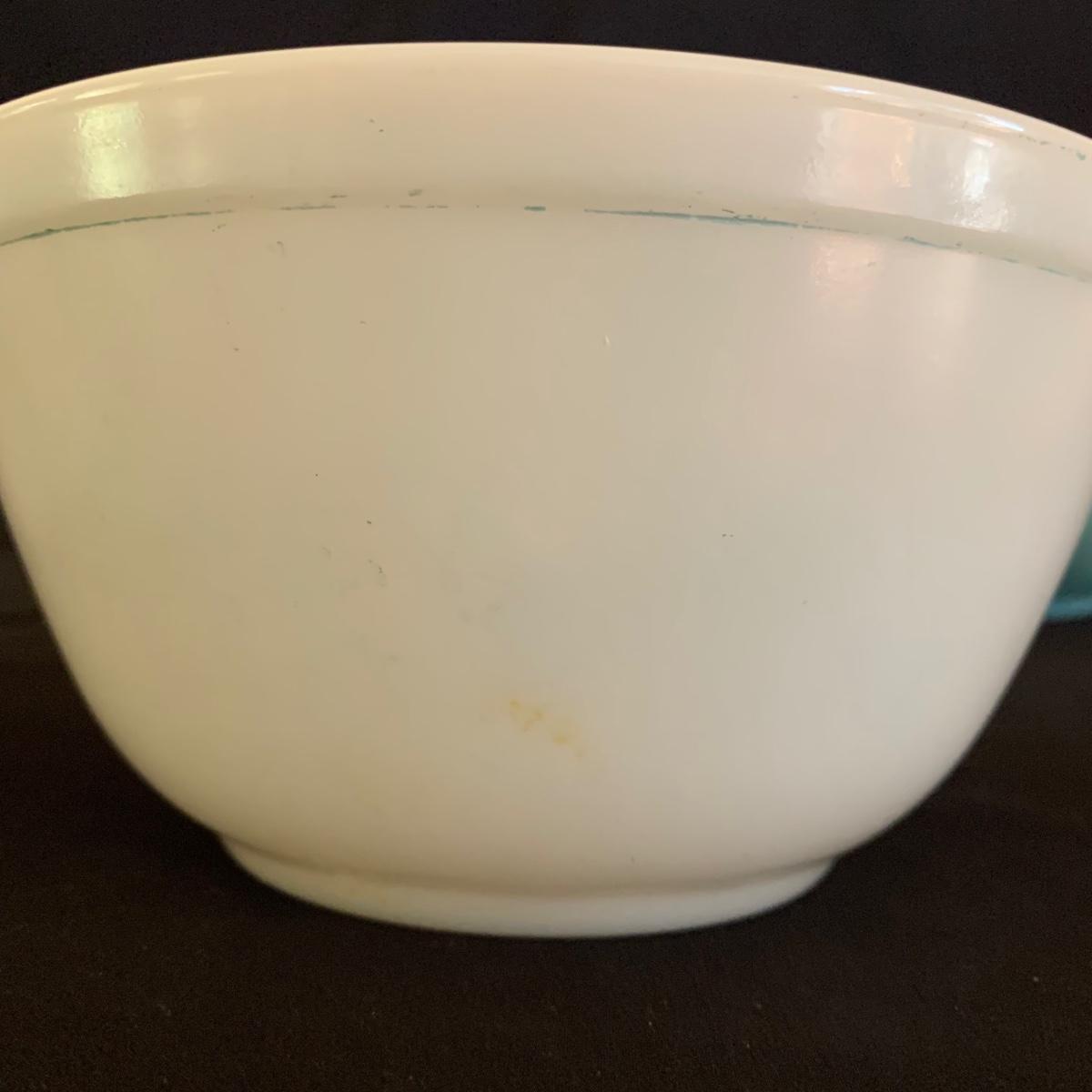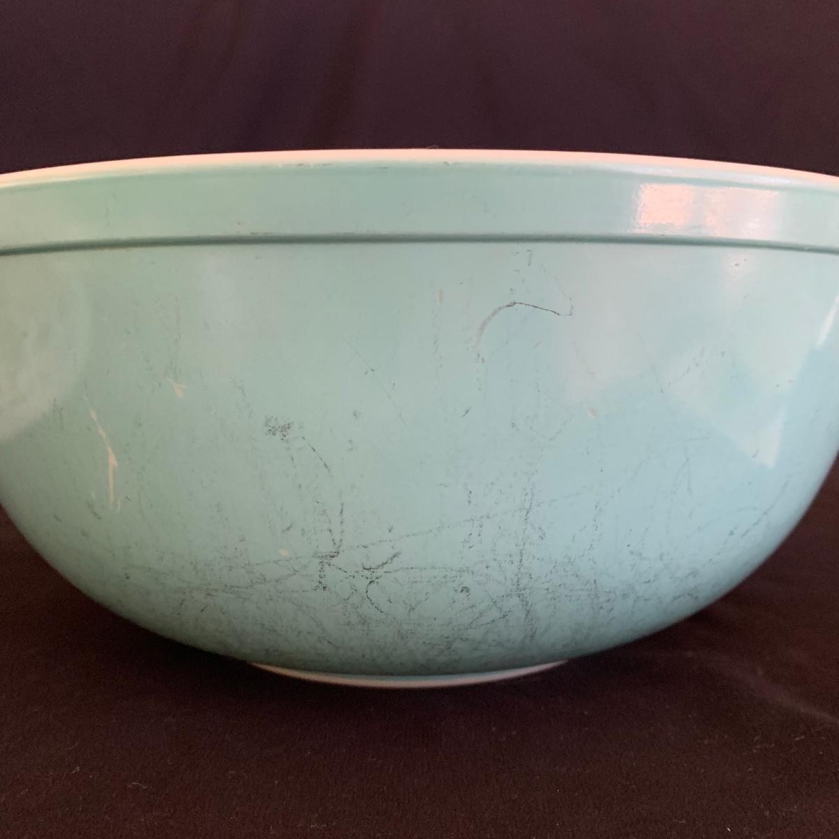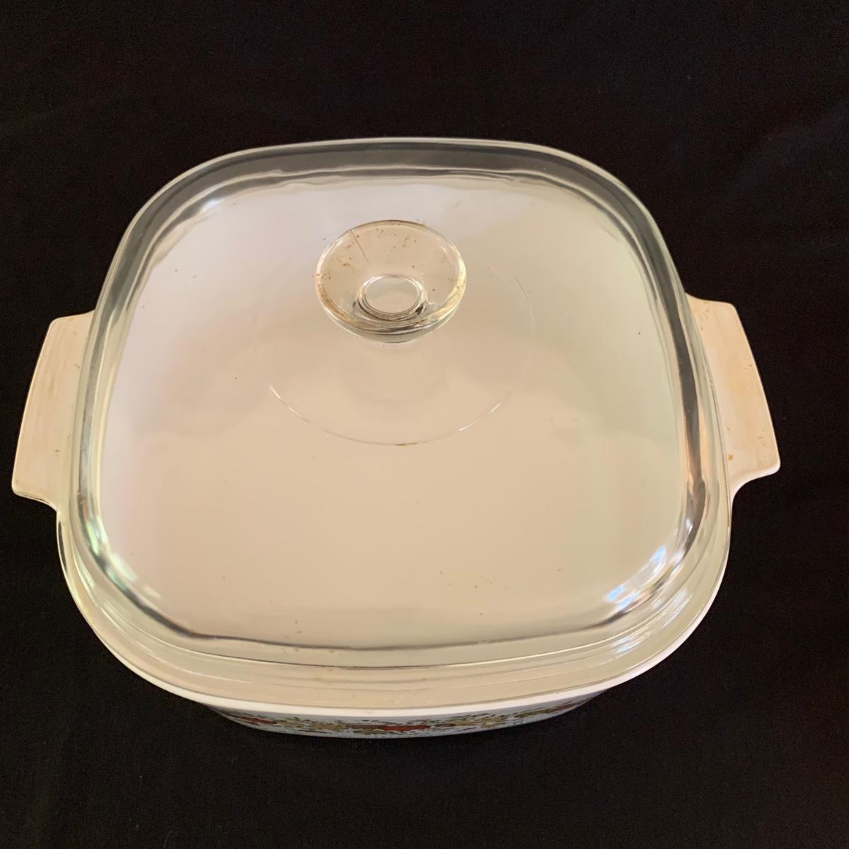 Three nesting Pyrex mixing bowls. The two bigger bowls are a robins egg blue color (one is brighter than the other) and the smallest is all white. There are some scratches on the surfaces of the bowls, but they are otherwise in good condition. The largest bowl is 10.5”d. The Corning Ware casserole dish is a 5 quart dish with a Pyrex lid. It has some stains from use, but is in good condition structurally and the design on the dish is still totally intact.