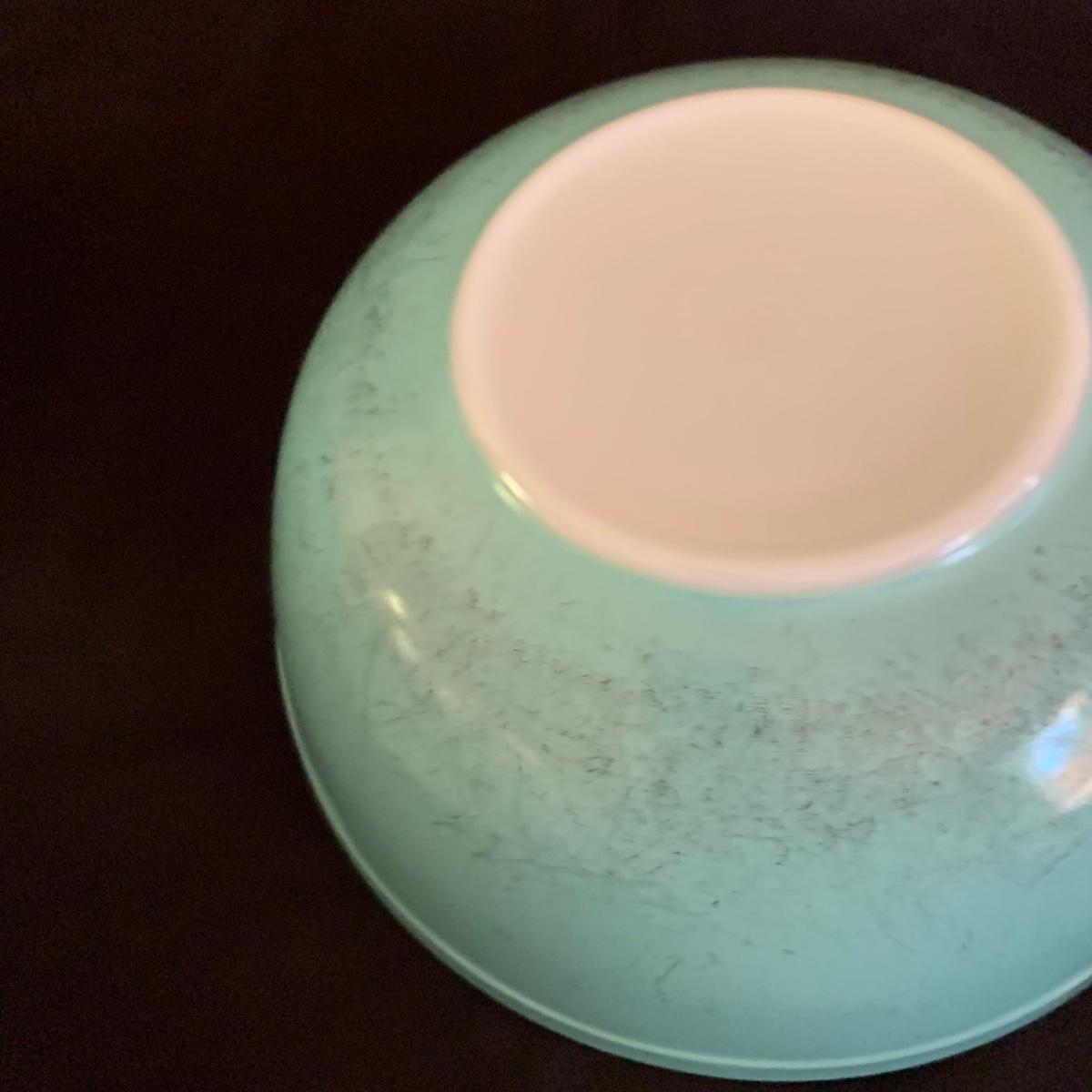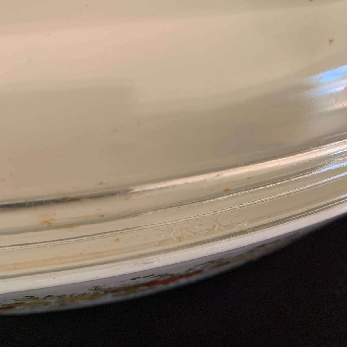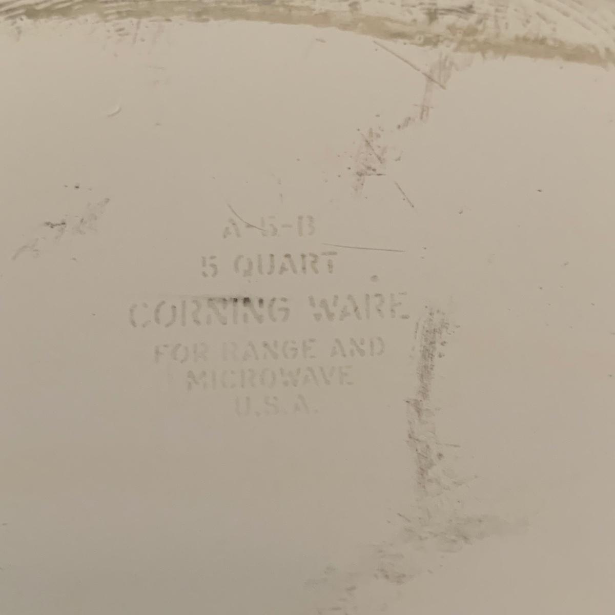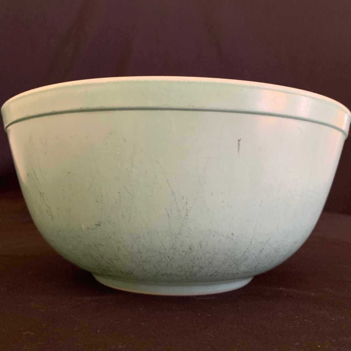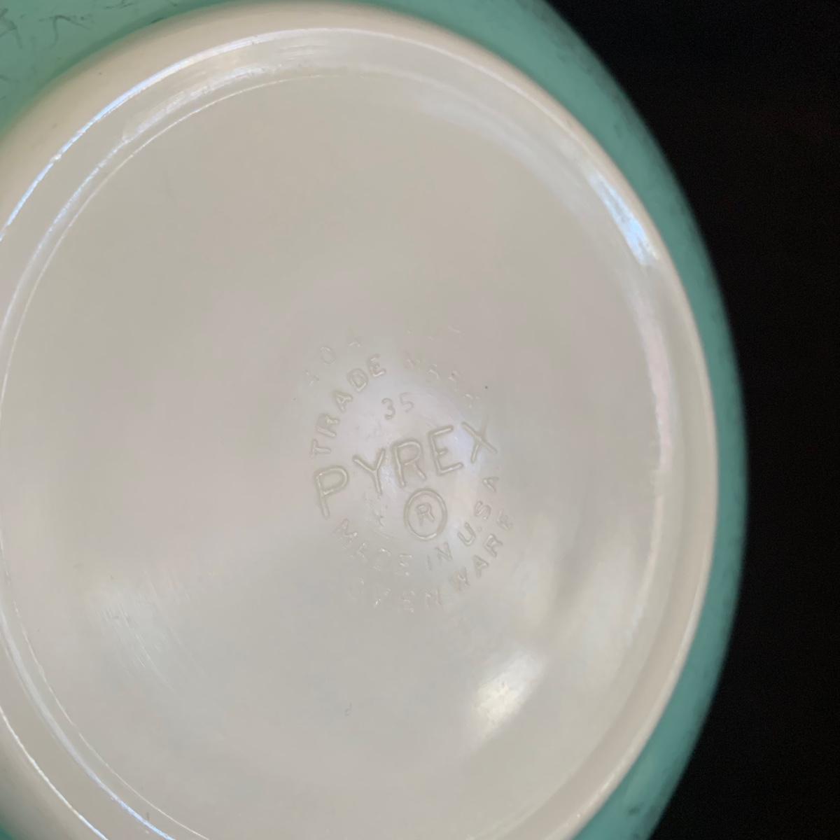 Three nesting Pyrex mixing bowls. The two bigger bowls are a robins egg blue color (one is brighter than the other) and the smallest is all white. There are some scratches on the surfaces of the bowls, but they are otherwise in good condition. The largest bowl is 10.5”d. The Corning Ware casserole dish is a 5 quart dish with a Pyrex lid. It has some stains from use, but is in good condition structurally and the design on the dish is still totally intact.
