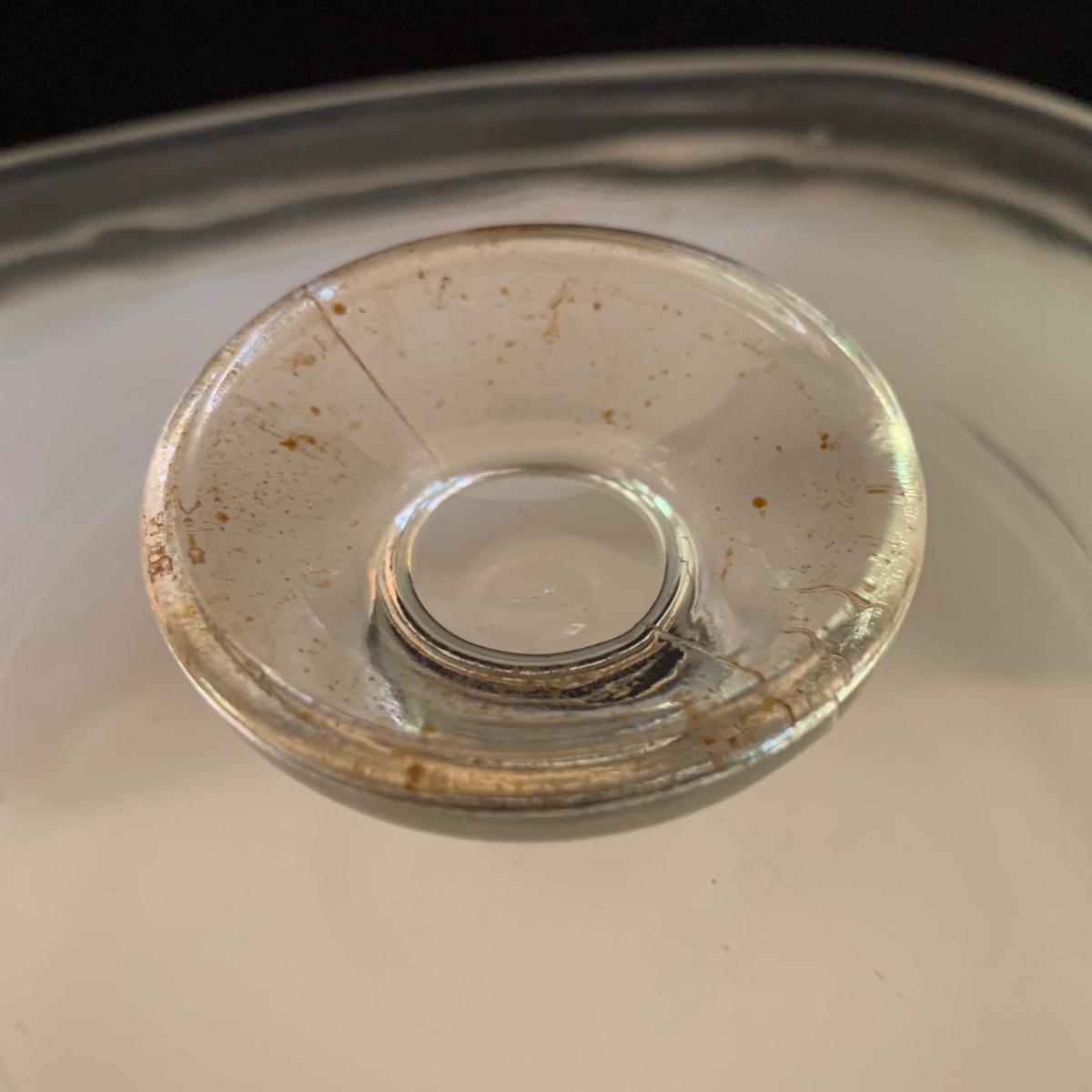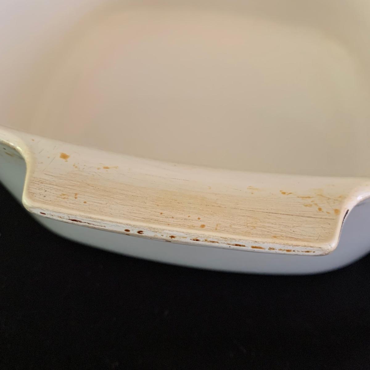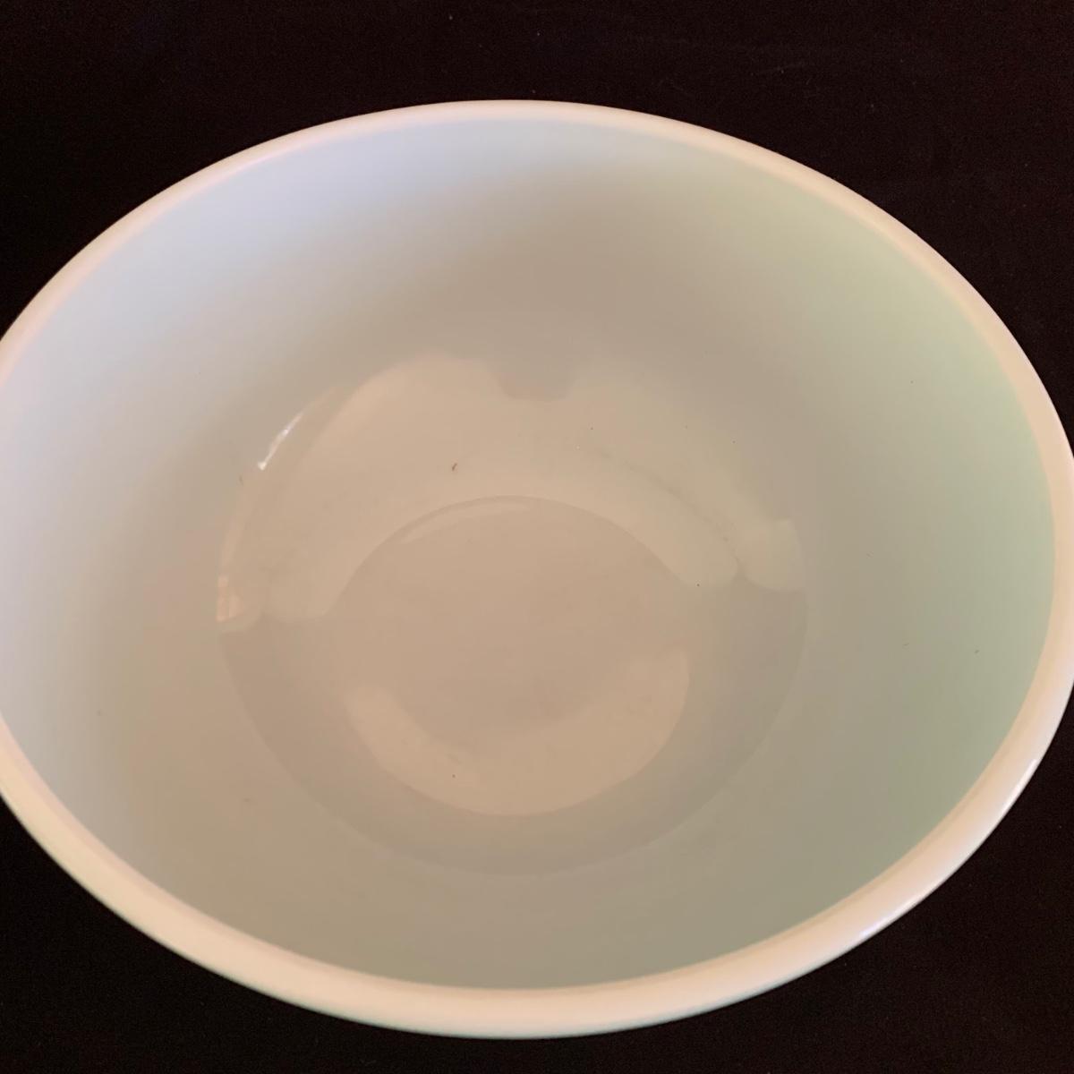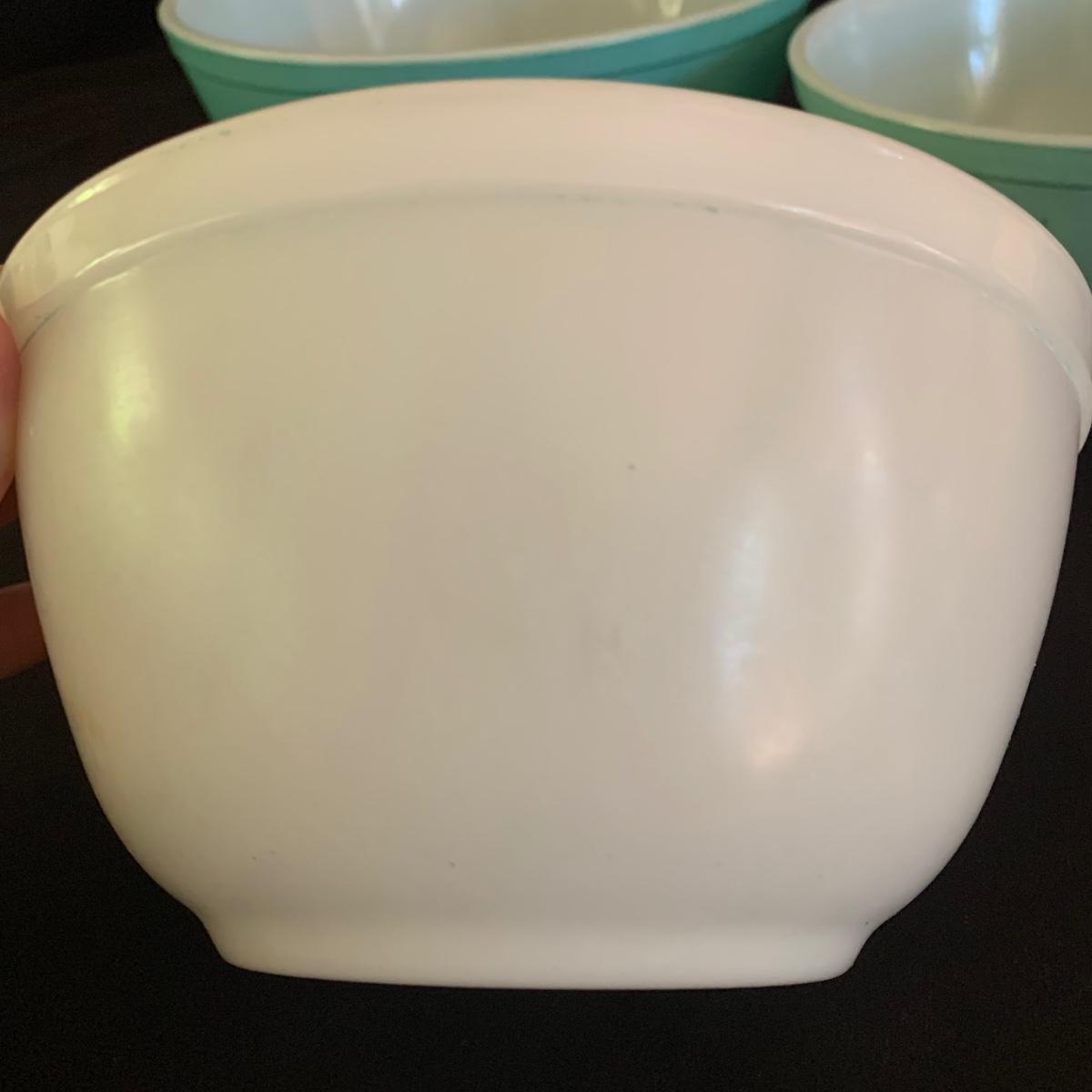 Three nesting Pyrex mixing bowls. The two bigger bowls are a robins egg blue color (one is brighter than the other) and the smallest is all white. There are some scratches on the surfaces of the bowls, but they are otherwise in good condition. The largest bowl is 10.5”d. The Corning Ware casserole dish is a 5 quart dish with a Pyrex lid. It has some stains from use, but is in good condition structurally and the design on the dish is still totally intact.